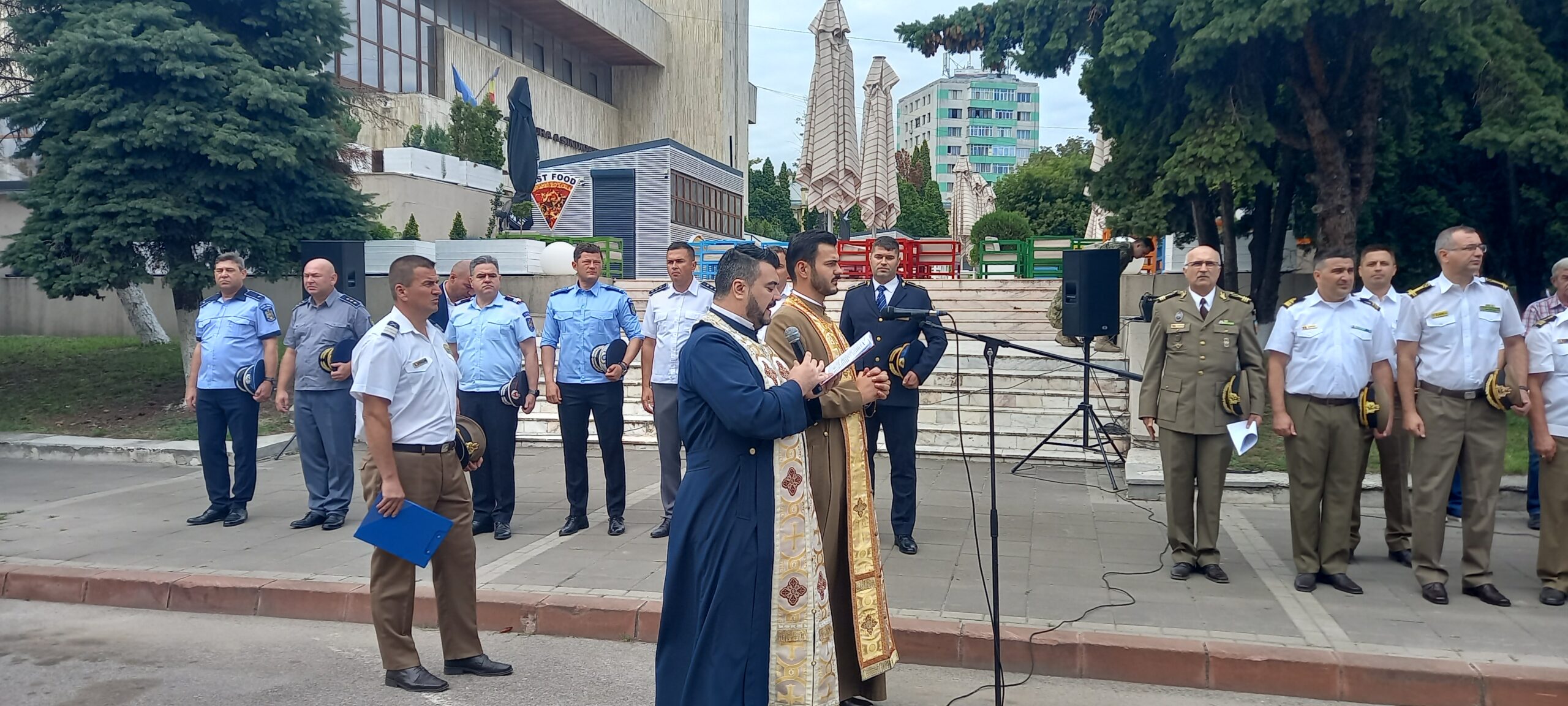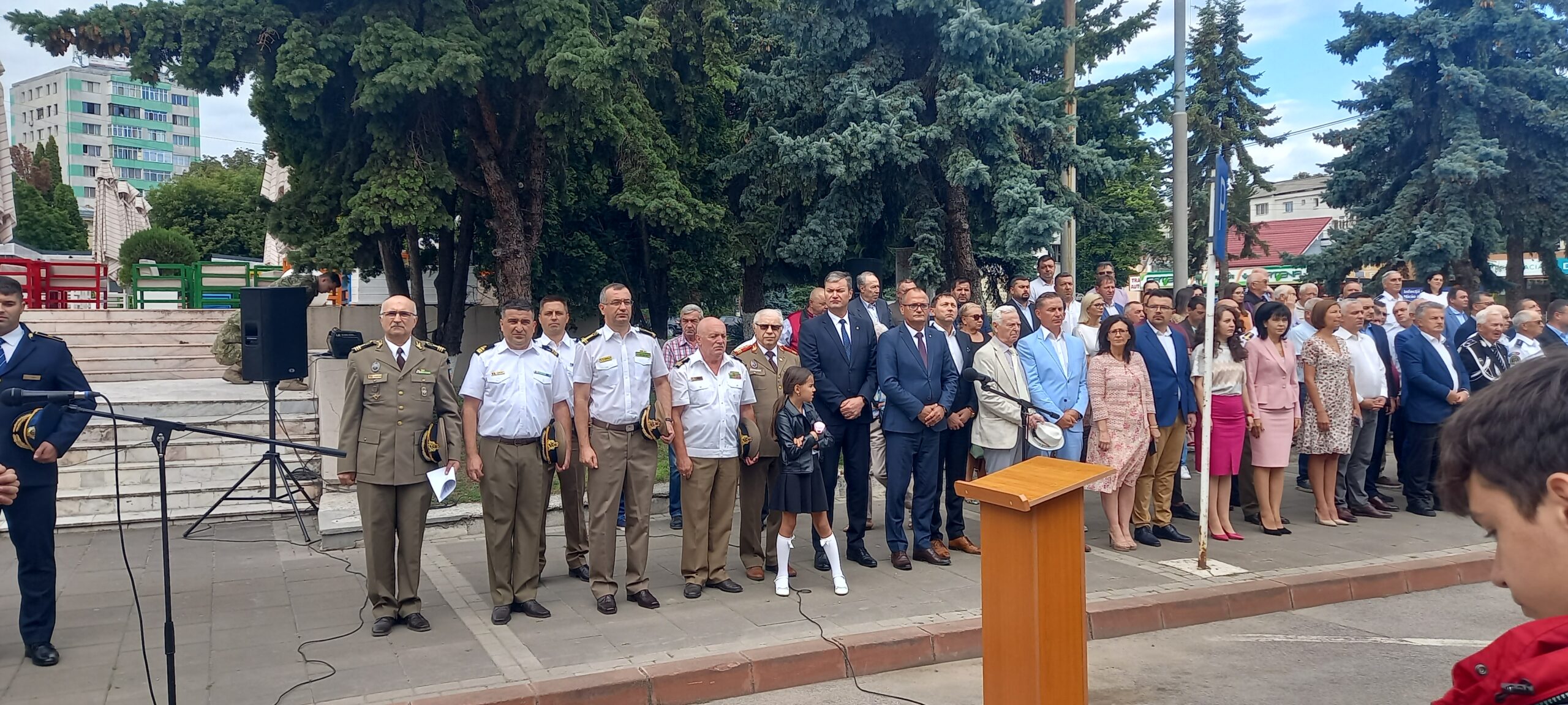 Ceremonia a început cu întâmpinarea oficialităților și trecerea în revistă a detașamentului de onoare de către președintele Consiliului Județean, după care a fost oficiat,ă de preotul militar, o rugăciune pentru poporul român.