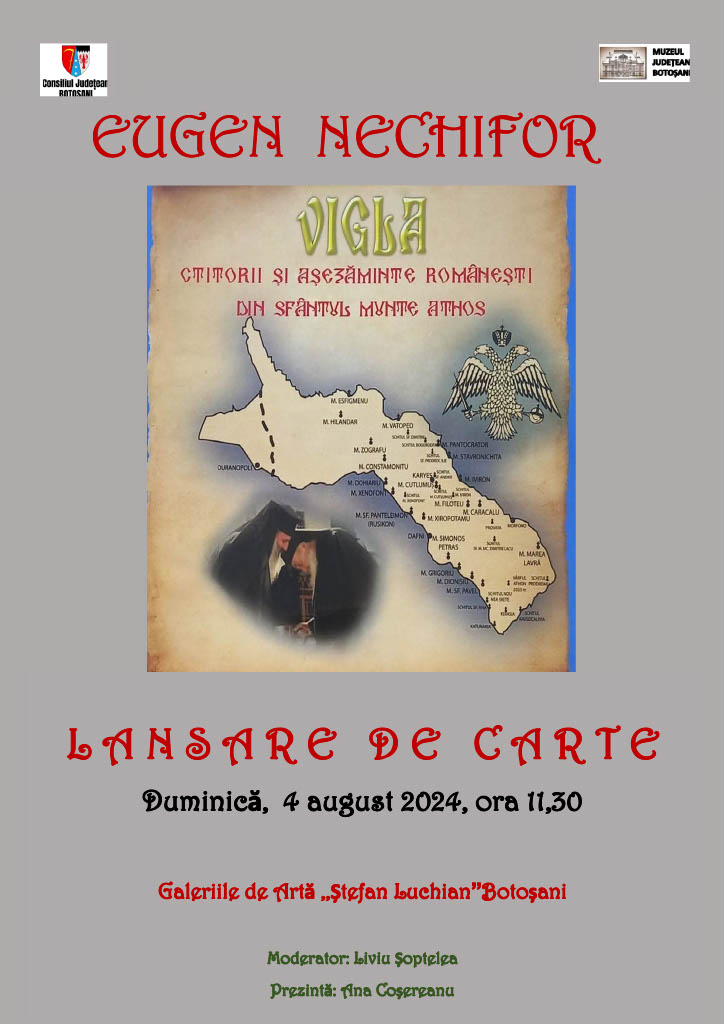 Muzeul Județean Botoșani găzduiește duminică, 4 august 2024, ora 11.30, în spațiul Galeriilor de Artă „Ștefan Luchian” Botoșani, lansarea volumului ,,Vigla – ctitorii și așezăminte românești din Sfântul Munte Athos”, al lui Eugen Nechifor (părintele Vichentie). Cartea, apărută în 2022 la editura Vasiliana ʼ98 din Iași, reprezintă un ghid spiritual, istoric și cultural despre Athos, „Muntele lui Dumnezeu”, fiind structurată pe 6 capitole, care abordează: cadrul geografic, istoric și cultural; evoluția așezămintelor monahale de la Athos; statutul juridico-canonic al așezămintelor monahale; așezămintele românești (schituri, chilii, colibe) de la Sfântul Munte de-a lungul istoriei; mărturii istoriografice din Schitul Prodromu; pelerinajele la Sfântul Munte.
