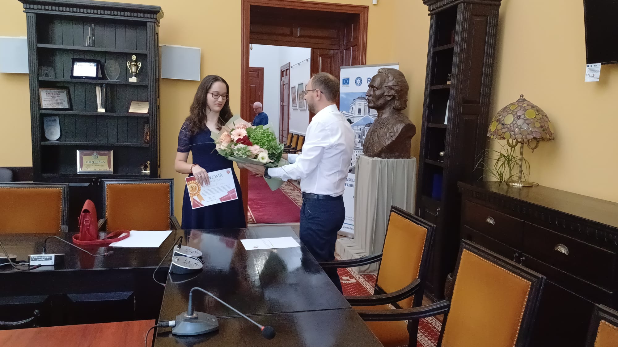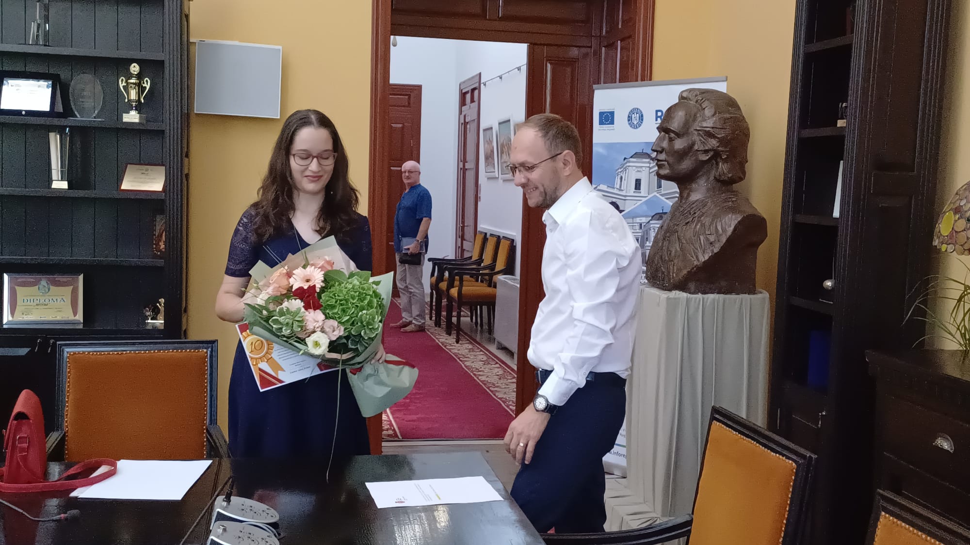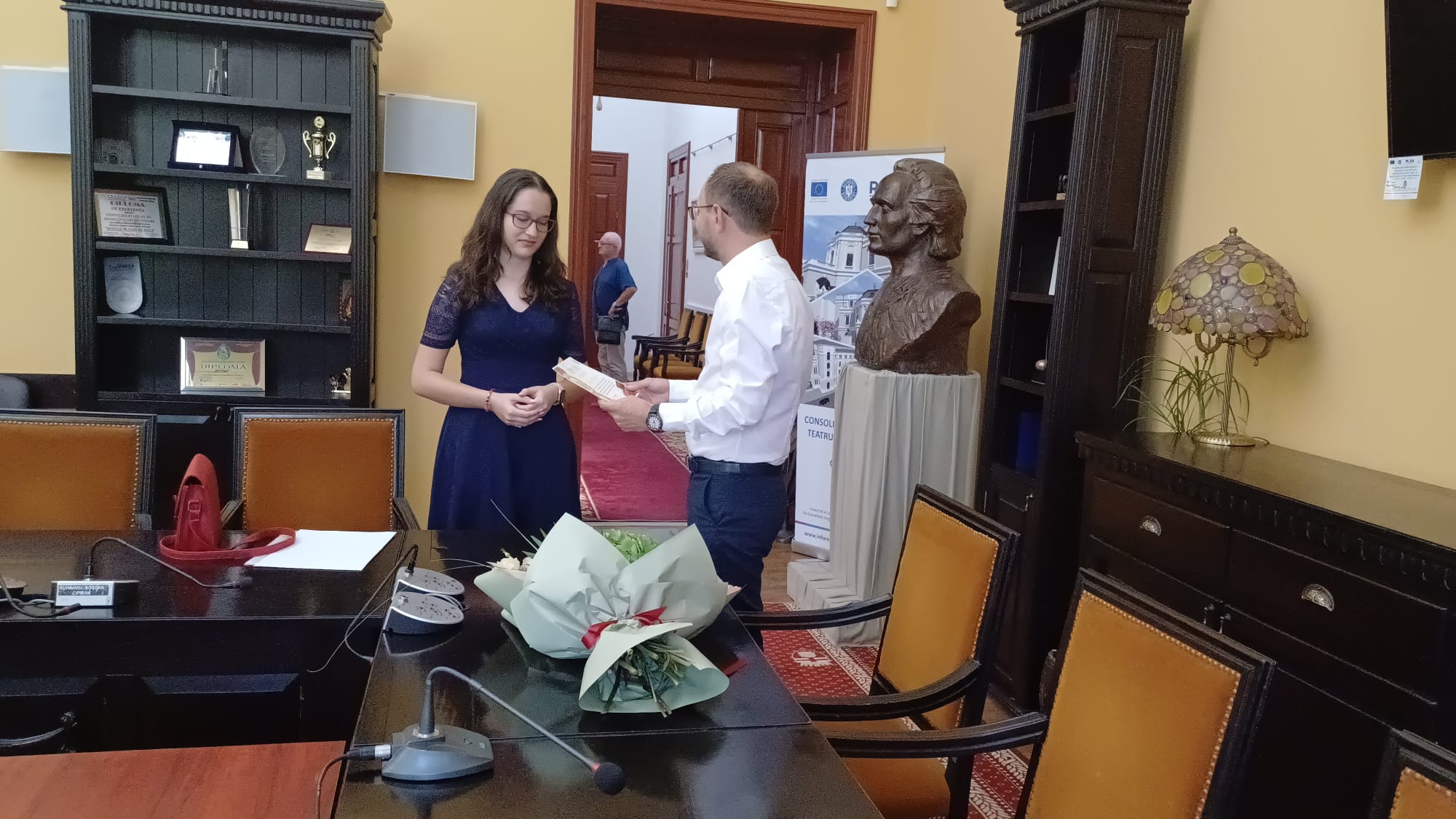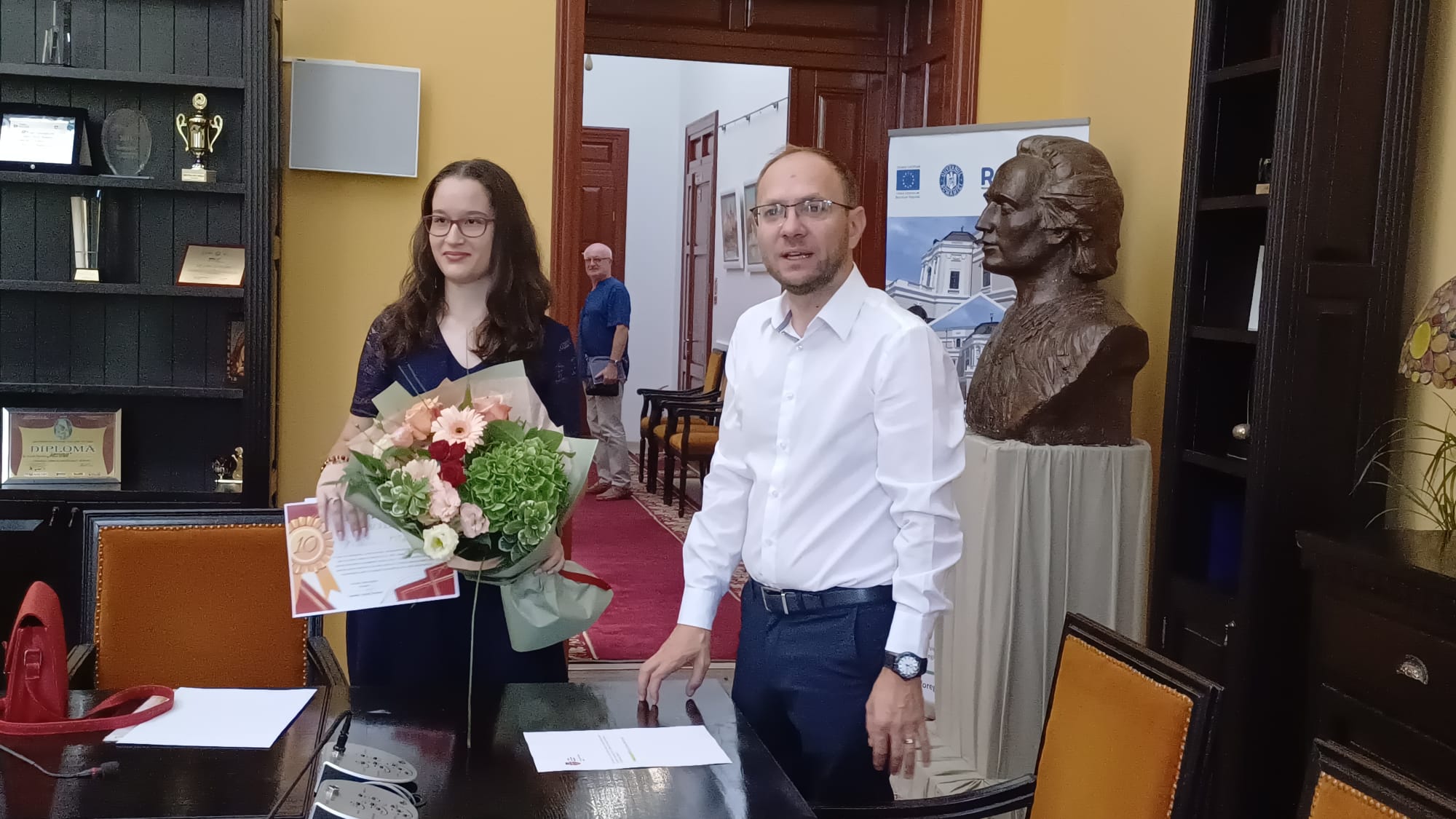 Primarul Cosmin Andrei i-a oferit o diplomă, flori, dar și o sumă de bani Mariei Macovei, elevă la Colegiul Național Mihai Eminescu.