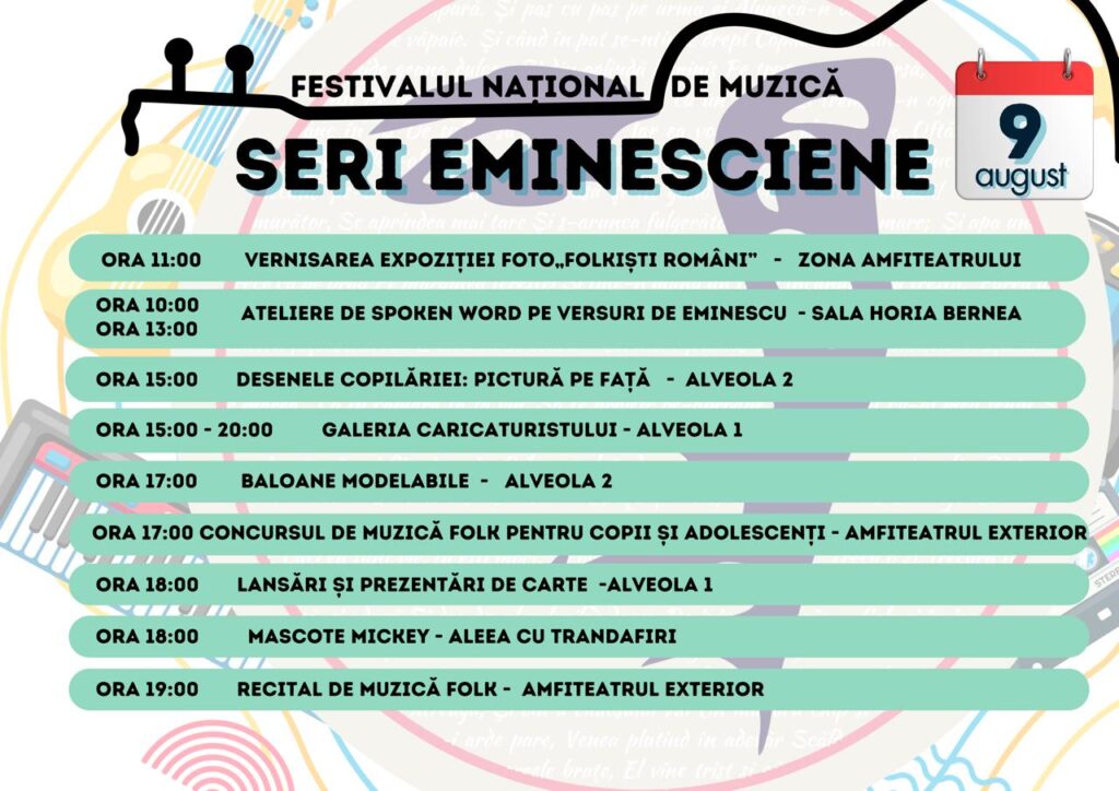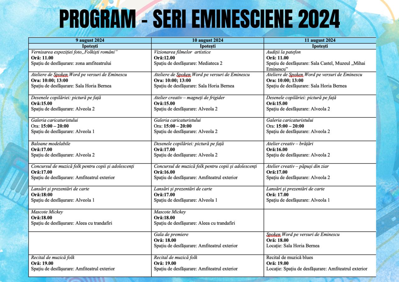 Memorialul Ipoteşti Centrul Naţional de Studii „Mihai Eminescu”, instituţie din subordinea Consiliului Judeţean Botoşani, organizează, în perioada 9-11 august 2024, Festivalul Naţional de Muzică Folk Seri Eminesciene. Ediţia din acest an este finanţată de Consiliul Judeţean Botoşani şi este organizată în parteneriat cu Centrul Judeţean pentru Conservarea şi Promovarea Culturii Tradiţionale Botoşani.
