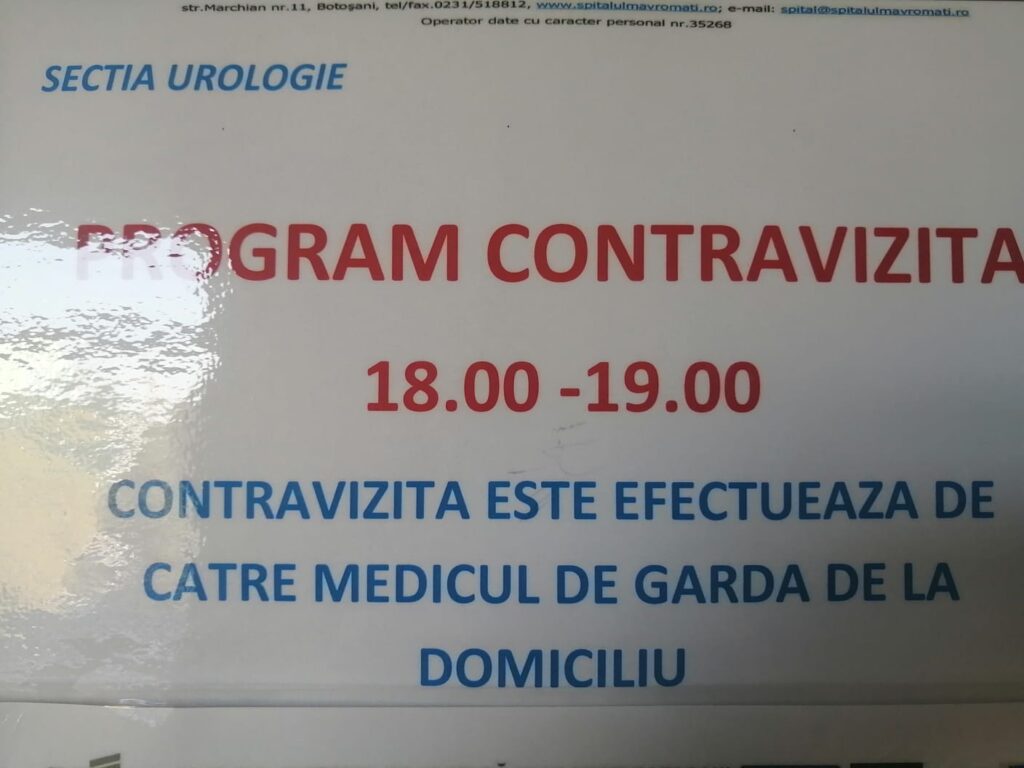Spre exemplu: la Urologie, „contravizita este efectuează de către medicul de gardă de la domiciliu”, iar purtarea „măști de protecție” este obligatorie.