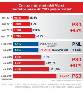 Marius Budăi a arătat că miniștrii Muncii de la PSD au crescut punctul de pensie cu 45% în perioada 2017-2019 (de la 917,5 lei la 1.265 lei), iar în actuala guvernare 2022-2024 cu încă 41% (de la 1.586 lei la 2.032 lei), la care se adaugă și creșterea medie de 26,7% a 82,5% dintre pensii, în urma recalculării de la 1 septembrie. În contrast, în ultimul deceniu, miniștrii PNL ai Muncii au majorat o singură dată punctul de pensie, cu 14% în 2020 – în loc de 40%, cum prevedea legea, iar în 2021 au înghețat cu totul punctul de pensie.