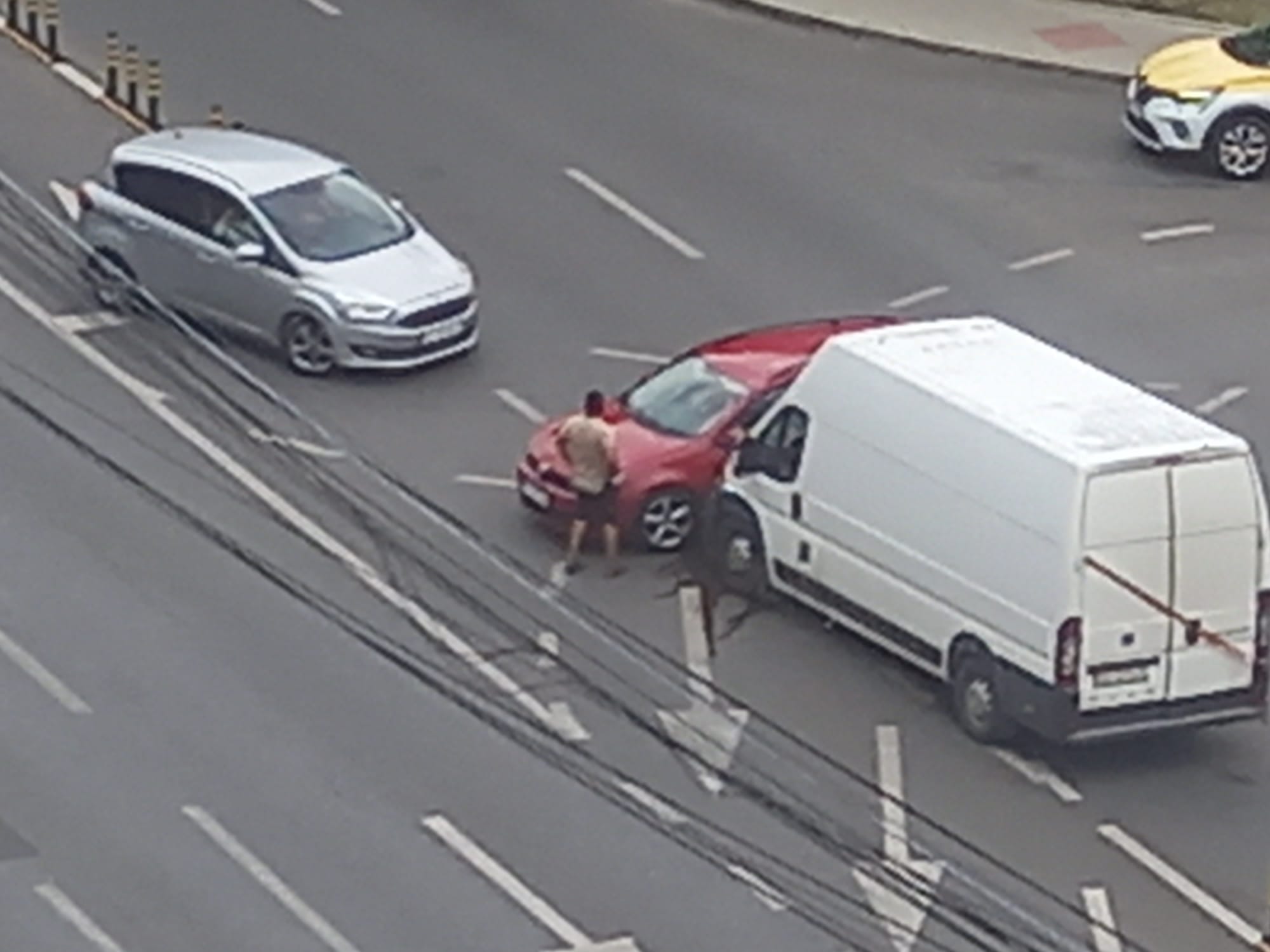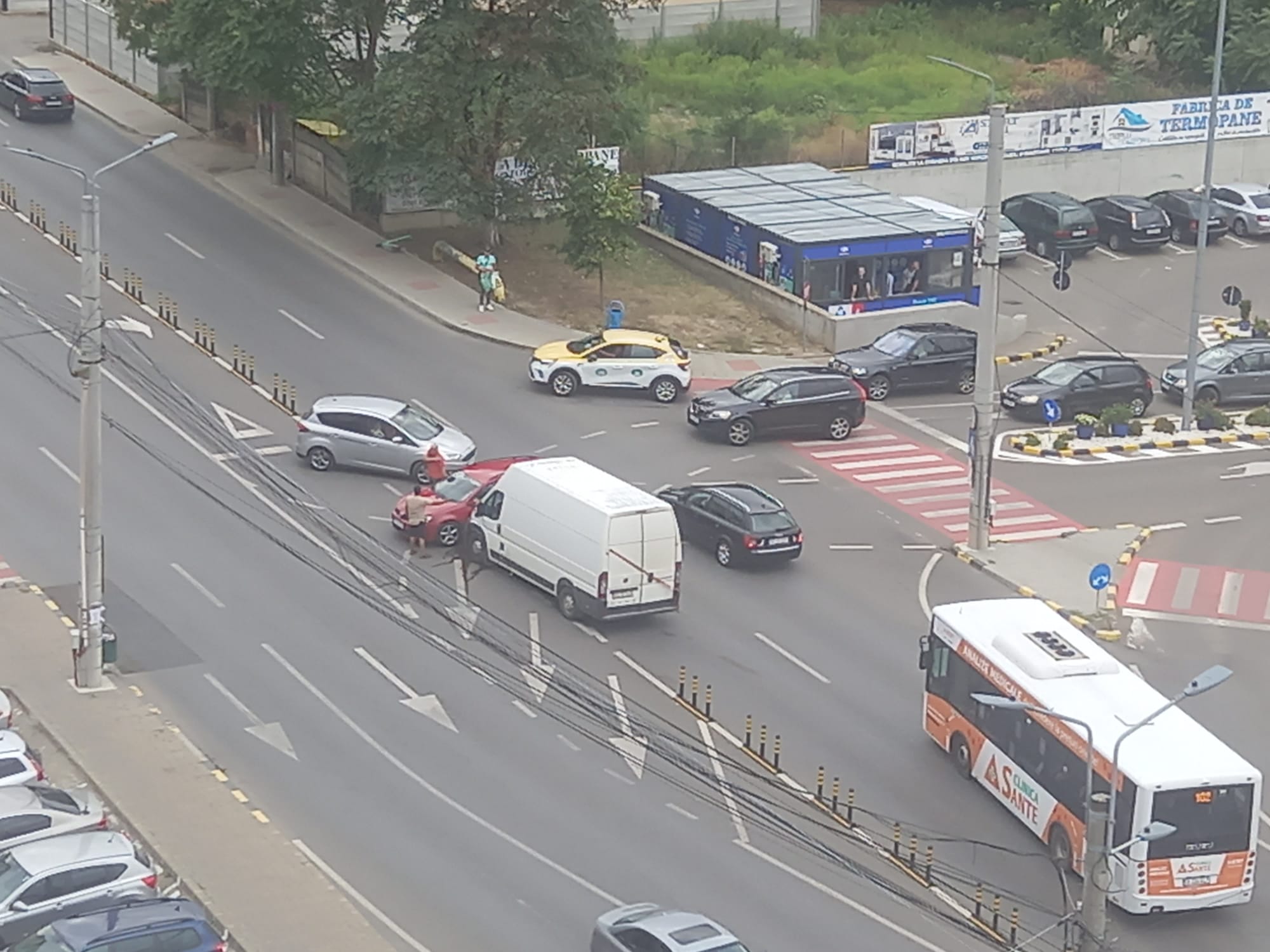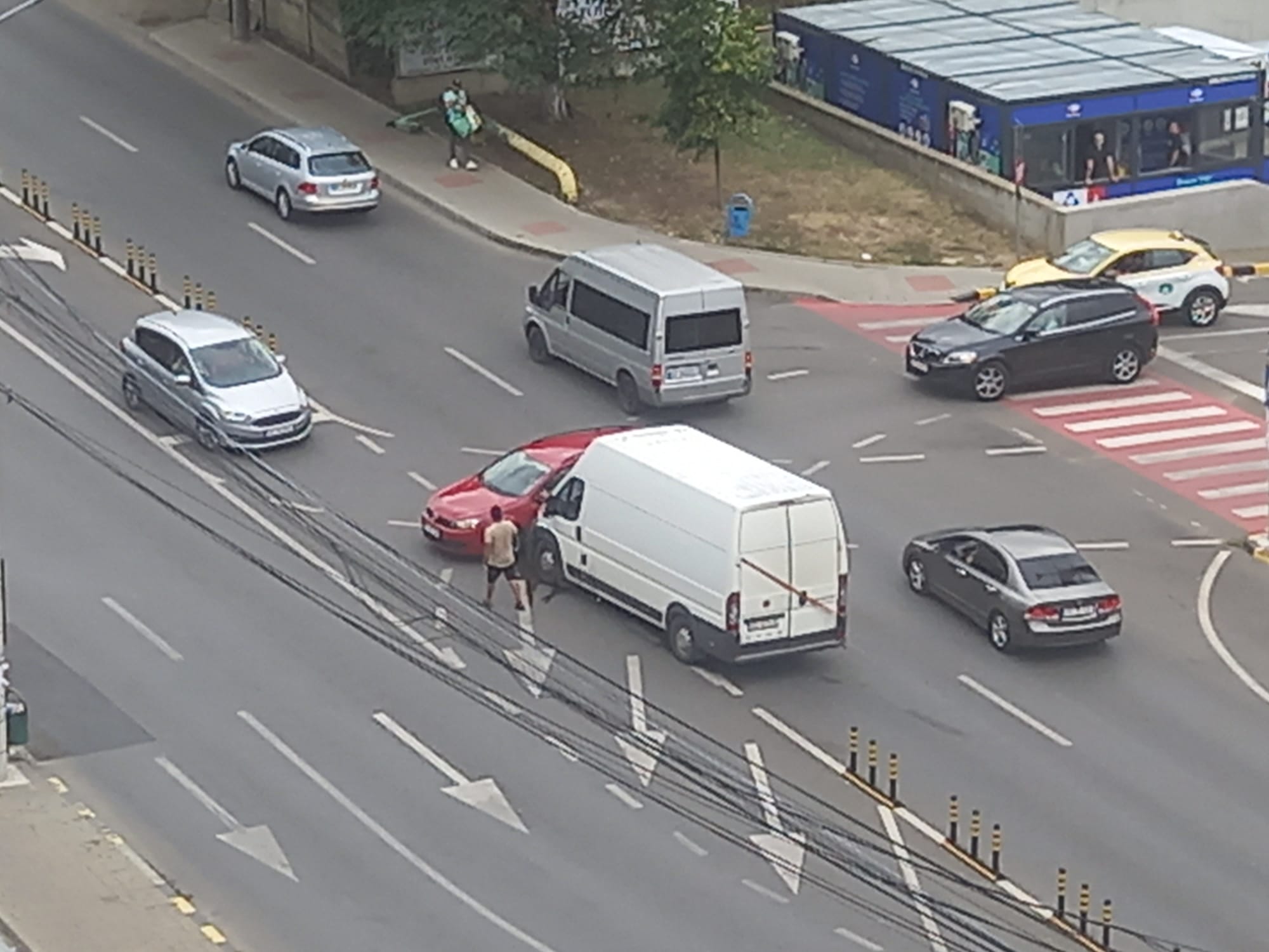 Un autoturism circula dinspre Calea Națională spre Pacea, iar în intersecția de la Carrefour s-a ciocnit cu un alt autoturism care a ieșit din parcarea centrului comercial.