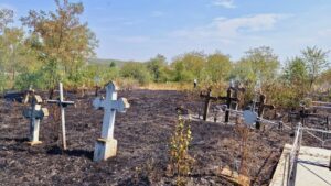 Un incendiu a avut loc sâmbătă, în județul Botoșani. Evenimentul s-a produs la cimitirul din Dumeni, comuna George Enescu. Focul a cuprins aproximativ 2000 de metri pătrați, în cimitir.