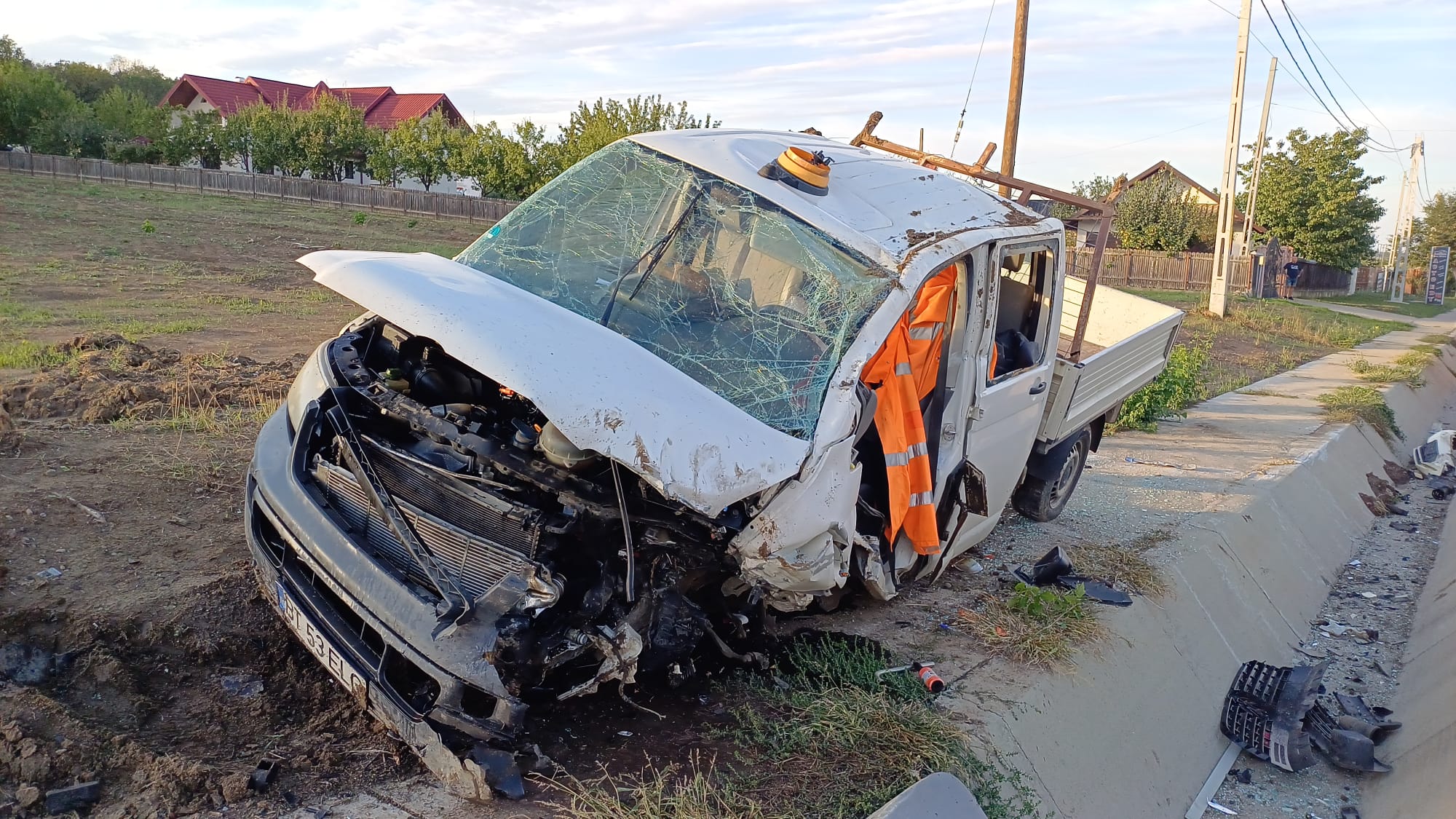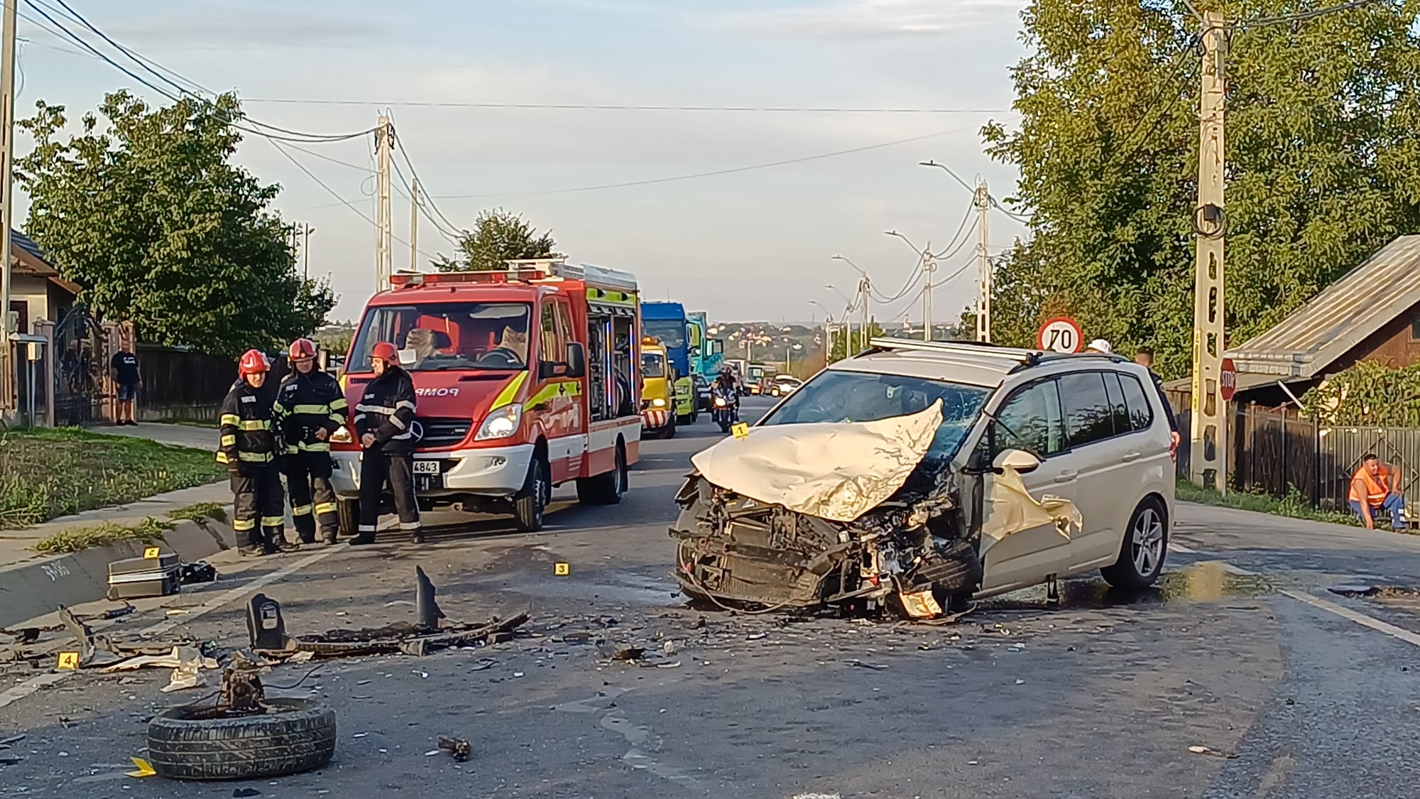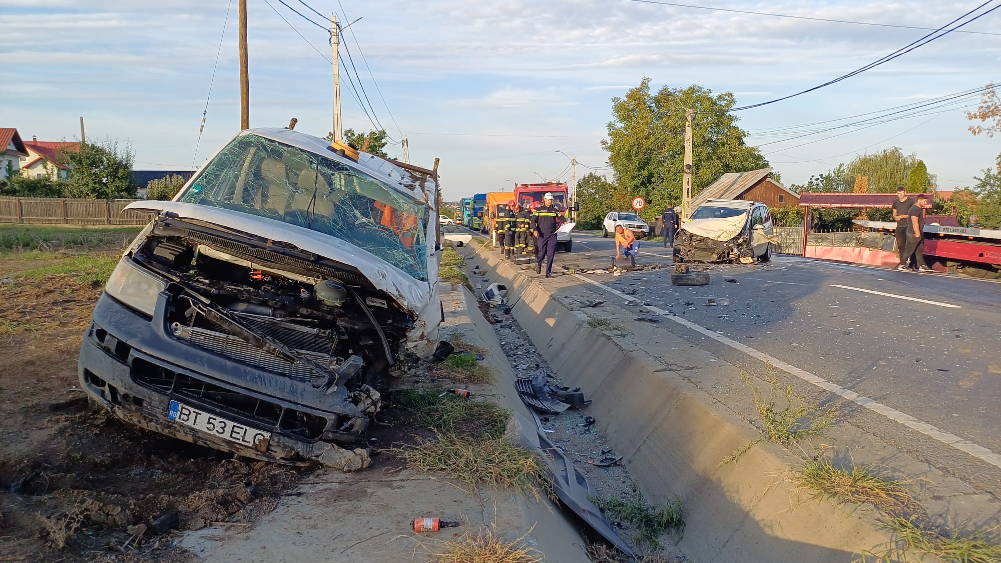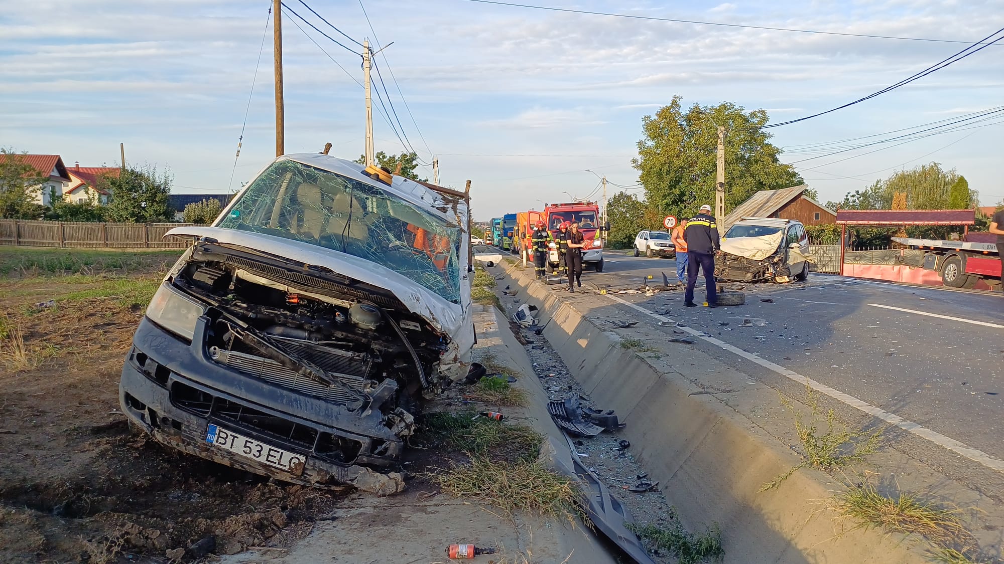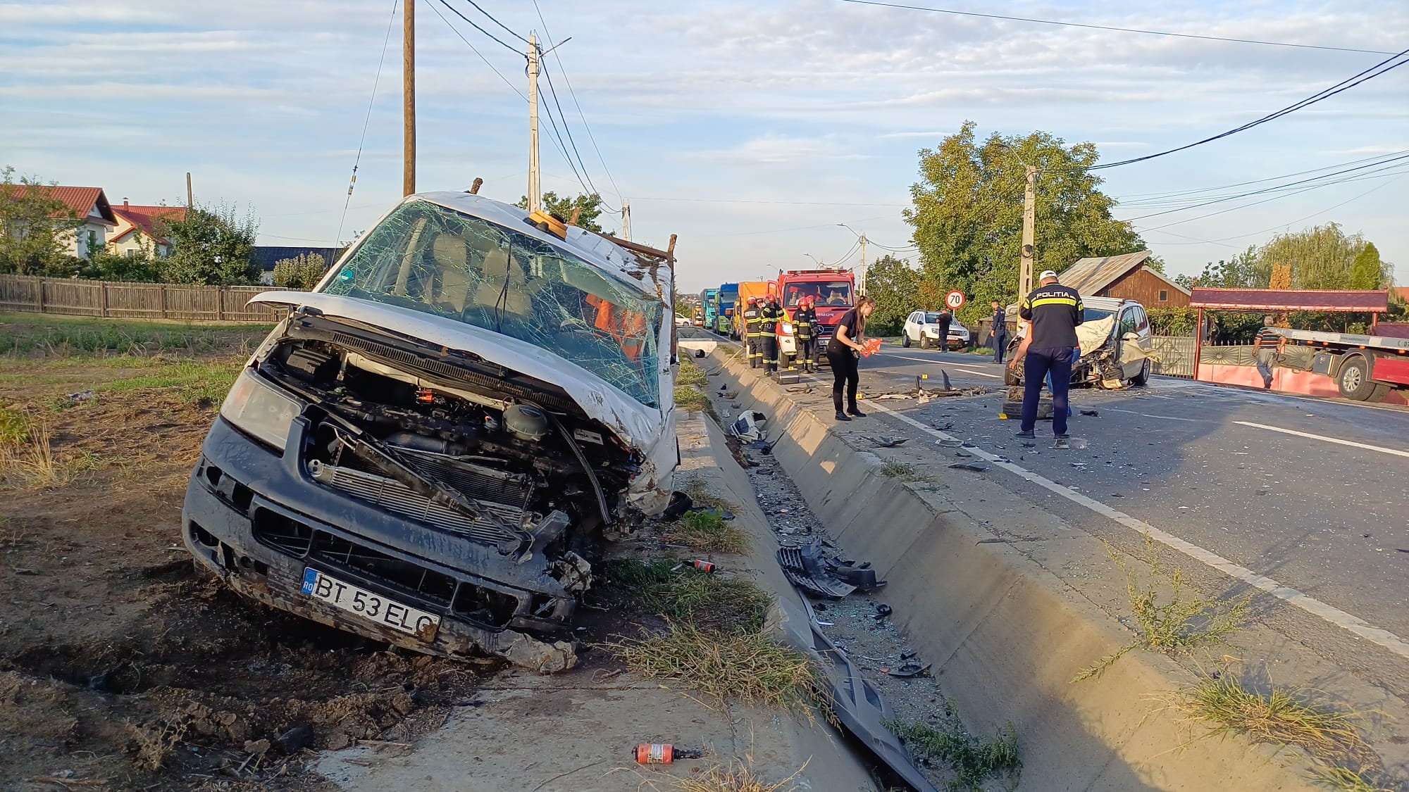Accidentul s-a produs după ce un  bărbat, care circula cu un VW Touran, cu soția în dreapta, a intrat într-o depășire, a ajuns pe contrasens și s-a izbit într-o mașină care transporta muncitori, de la firma Elegant Glob. În urma impactului, autoutilitara a ieșit în afara părții carosabile.