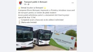 O falsă ofertă în numele Primăriei Botoşani, dar şi a societăţii comerciale Eltrans a fost lansată pe reţelele de socializare. Oferta face trimitere la un serviciu pe care societatea de transport nu îl oferă, respectiv cardul de transport în comun.
