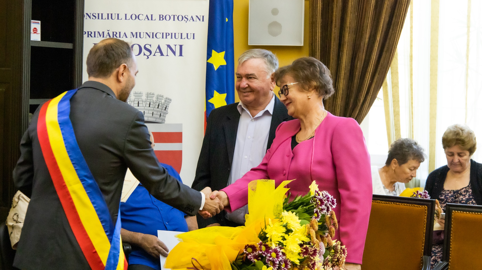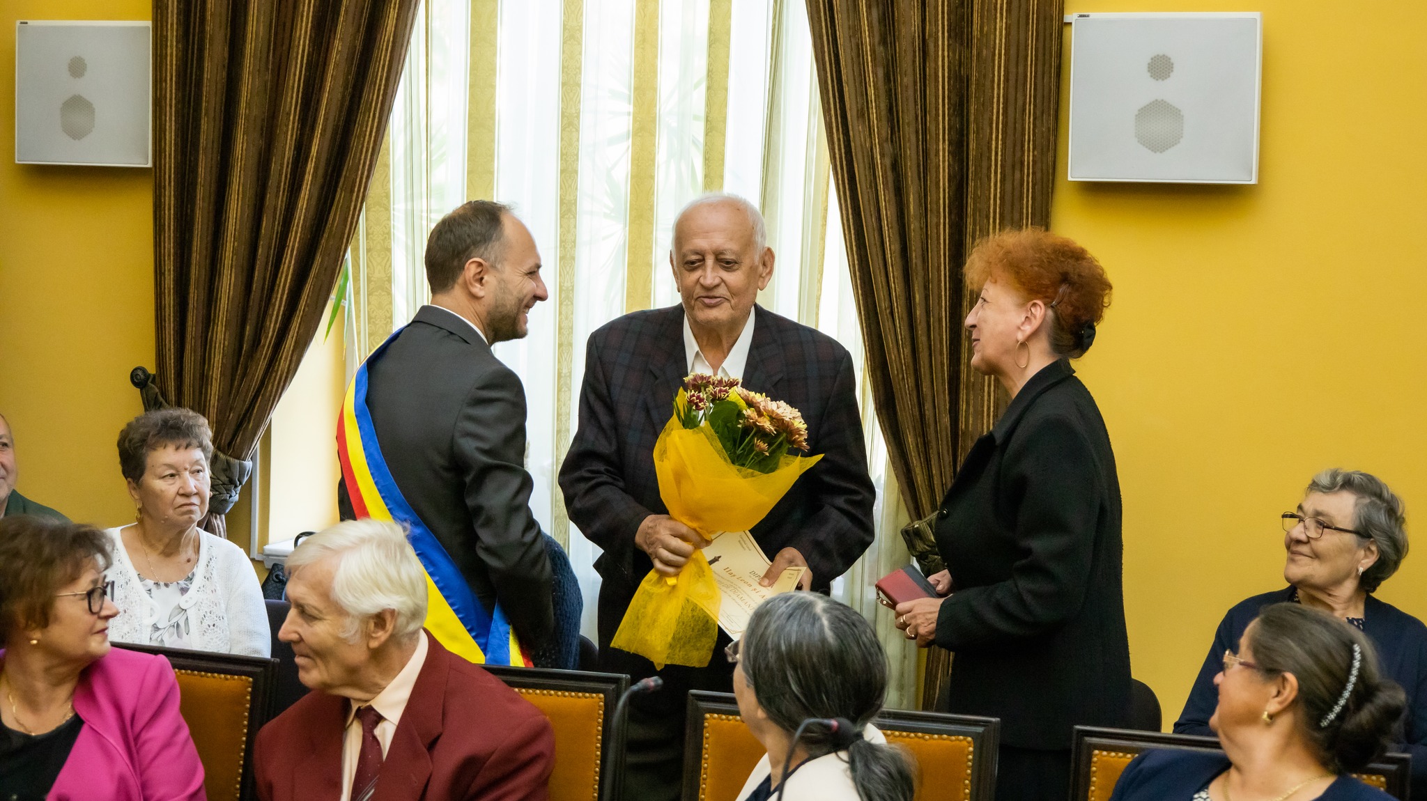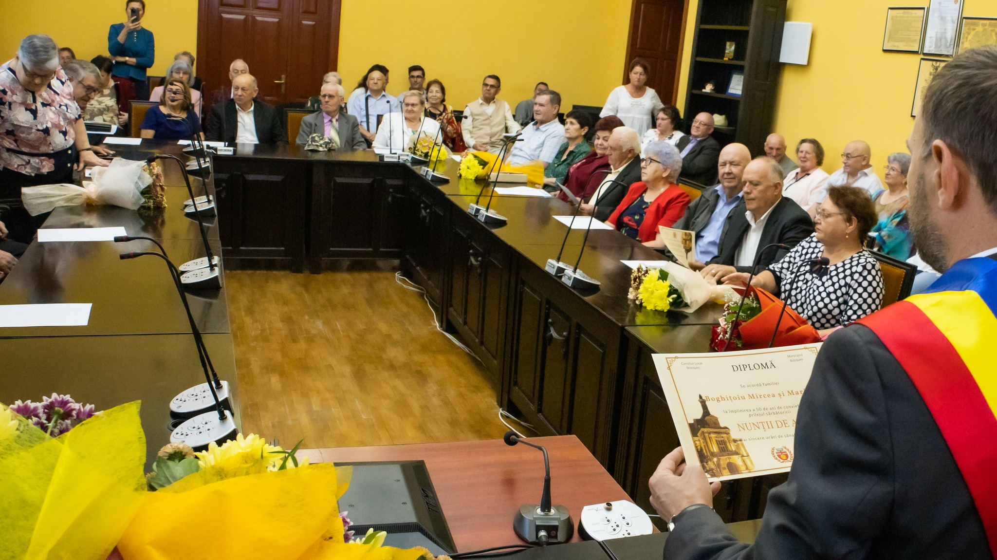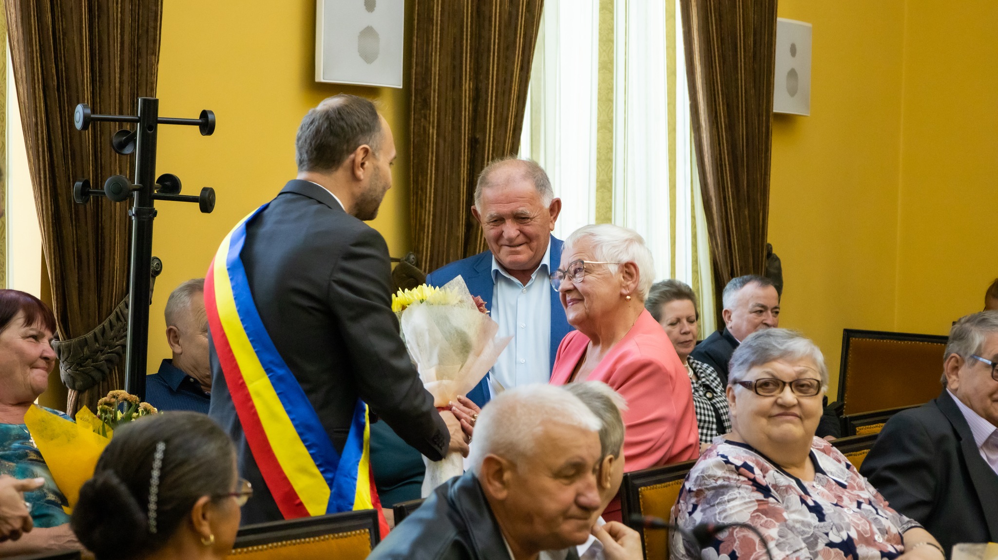 Un cuplu de „diamant” și 41 de „aur” au fost sărbătorite, marți, în cadrul unei ceremonii organizate la Primăria municipiului Botoșani. Primarul municipiului Botoșani, Cosmin Andrei, a felicitat și premiat 42 de cupluri care au sărbătorit 60 de ani, respectiv 50 de ani de căsnicie.