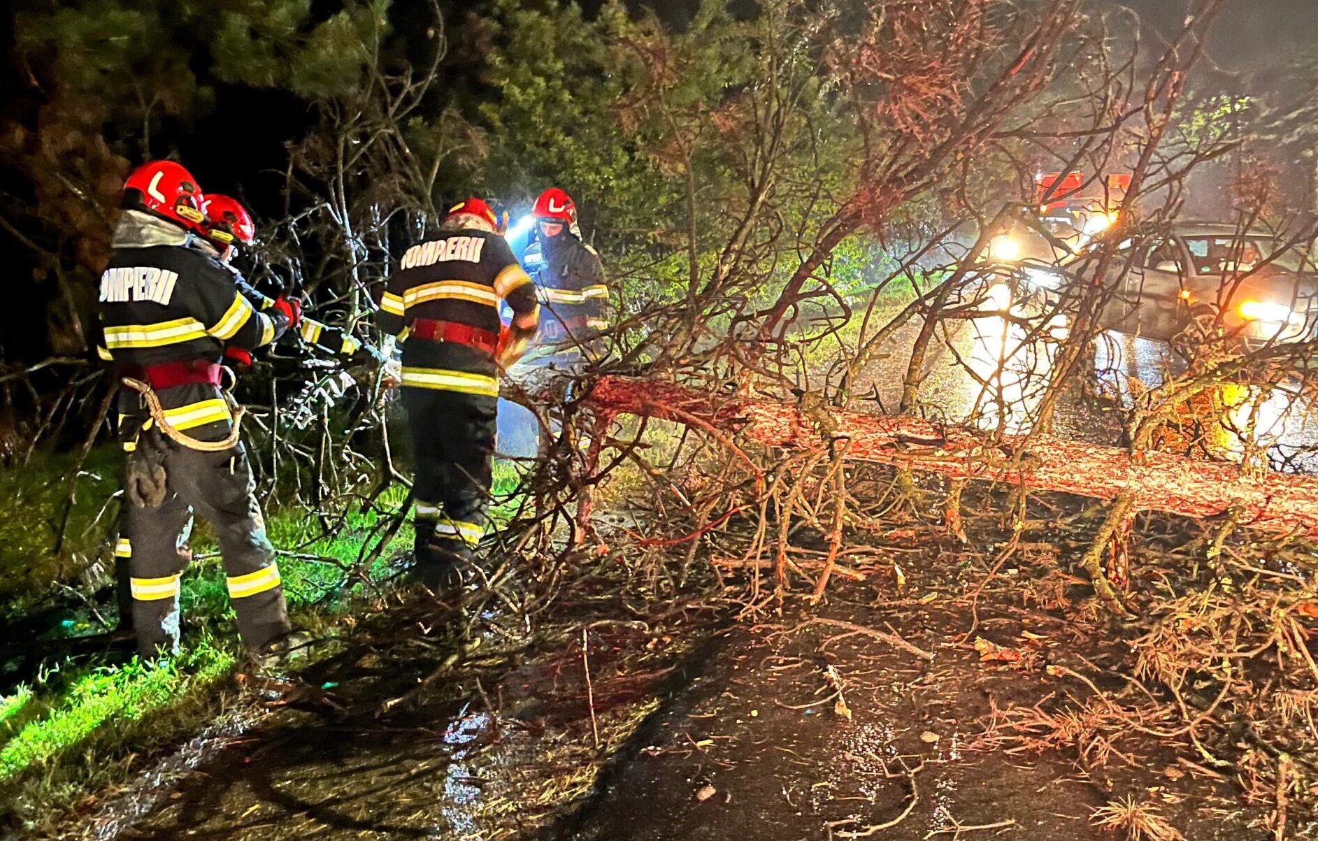 - în apropierea localității Vârfu Câmpului, unde un arbore doborât de vânt a blocat circulația pe un sens de mers. Pericolul a fost îndepărtat de pompierii de la Detașamentul Dorohoi;