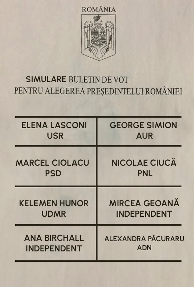 Potrivit surselor Gândul, prima pagină a buletinului de vot va conține 8 candidați. Totuși, până duminică, când se va stabili macheta finală, există posibilitatea ca numărul candidaților de pe prima pagină să crească la 10.