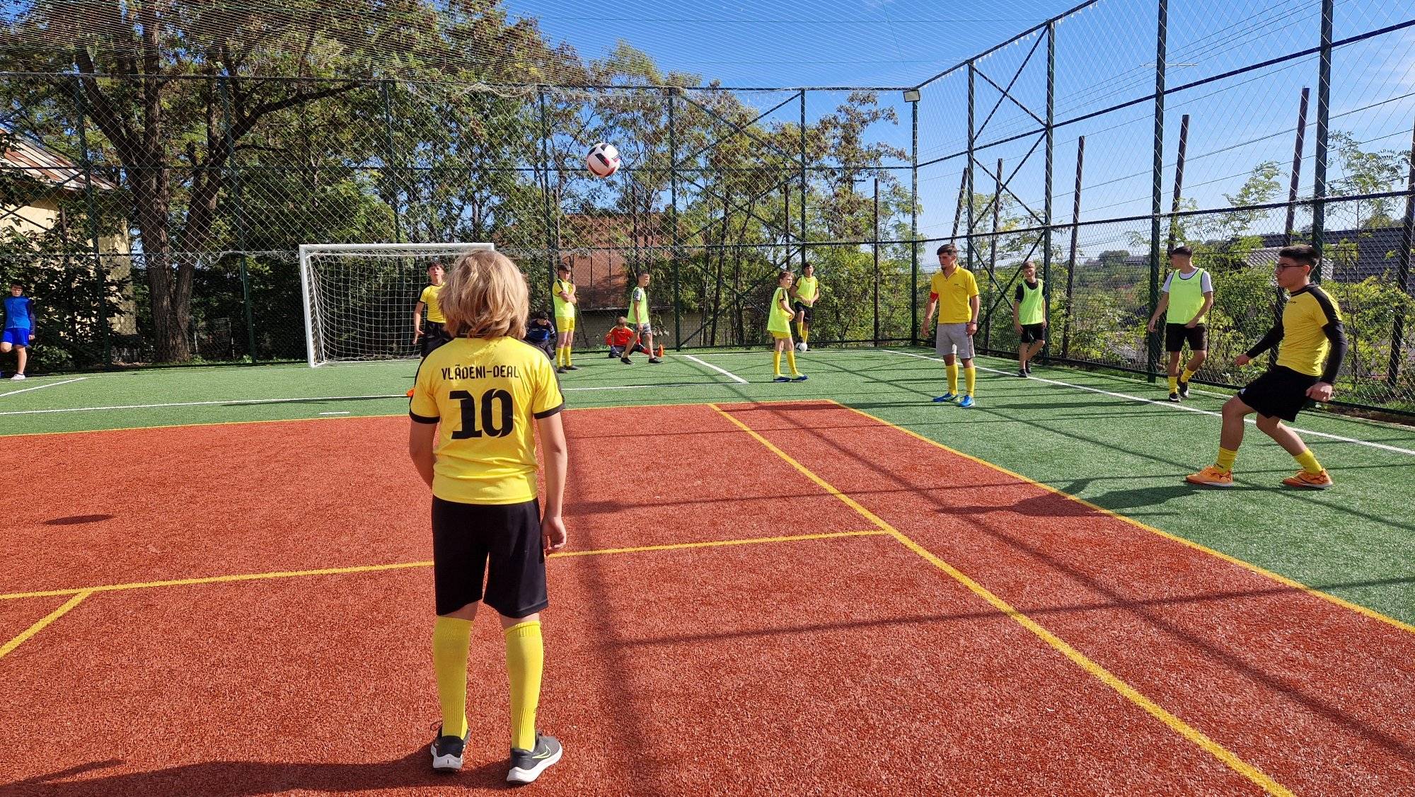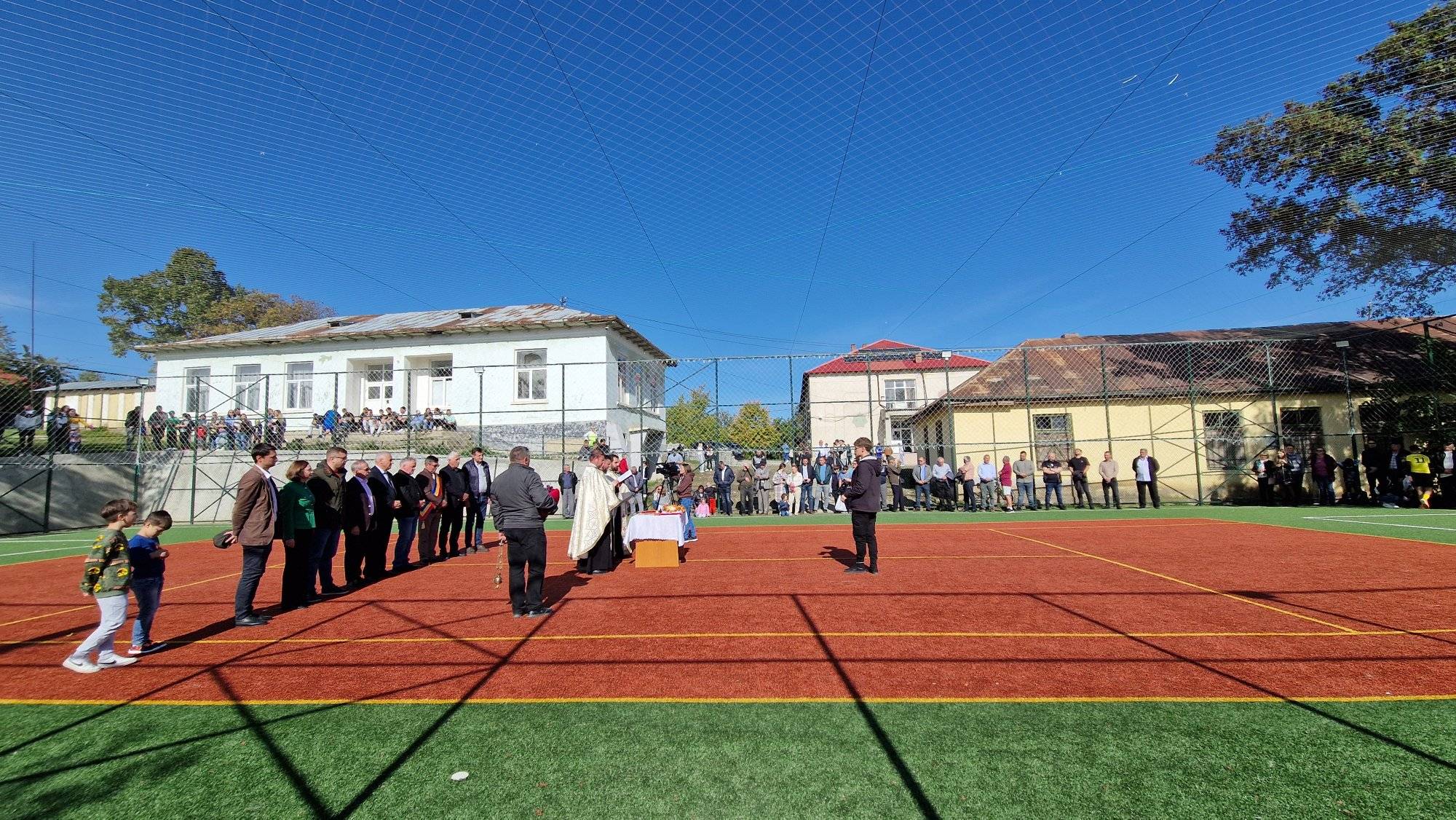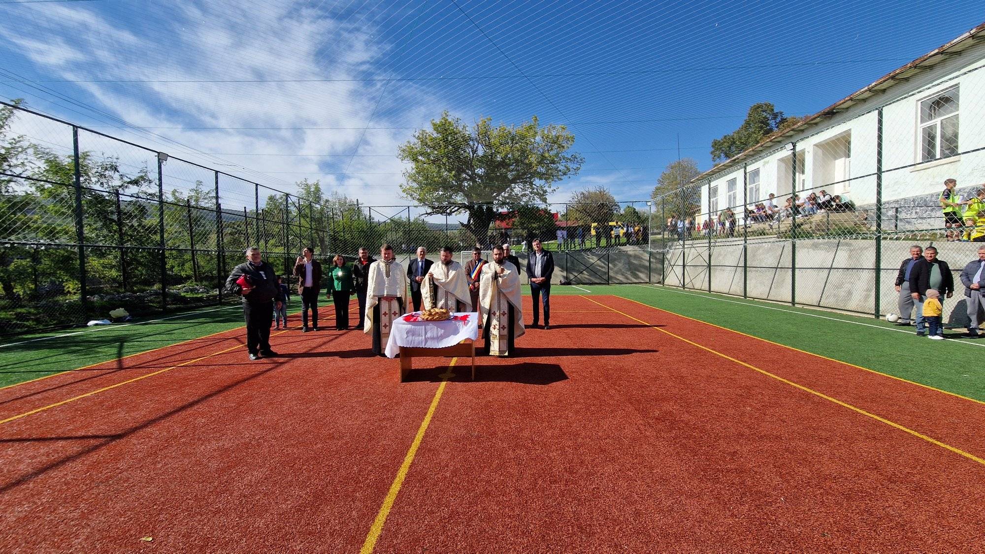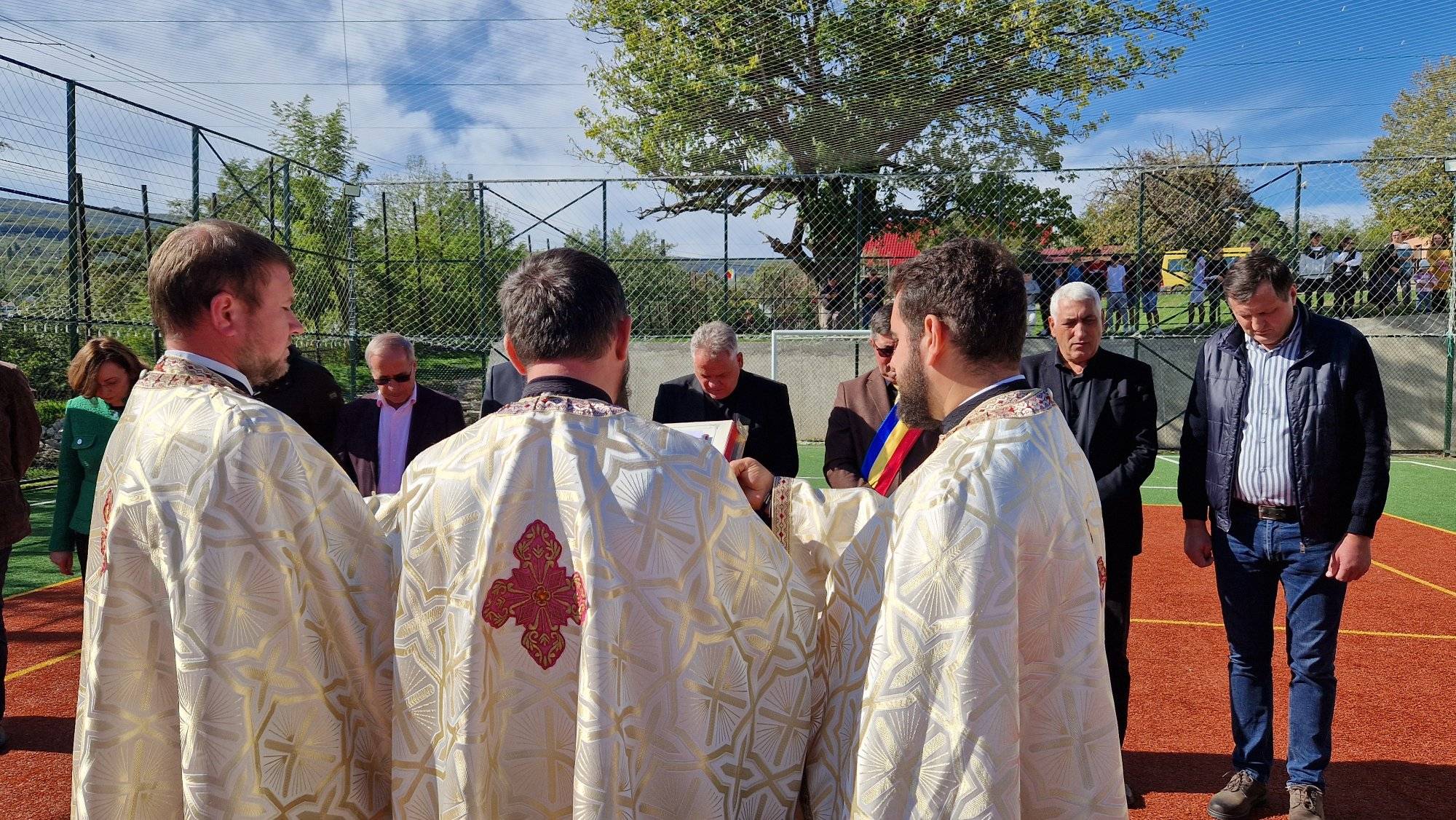 Terenul de sport, realizat din fonduri de la bugetul local, a fost sfințit de trei preoți.