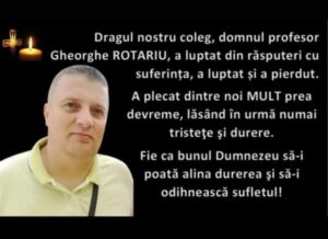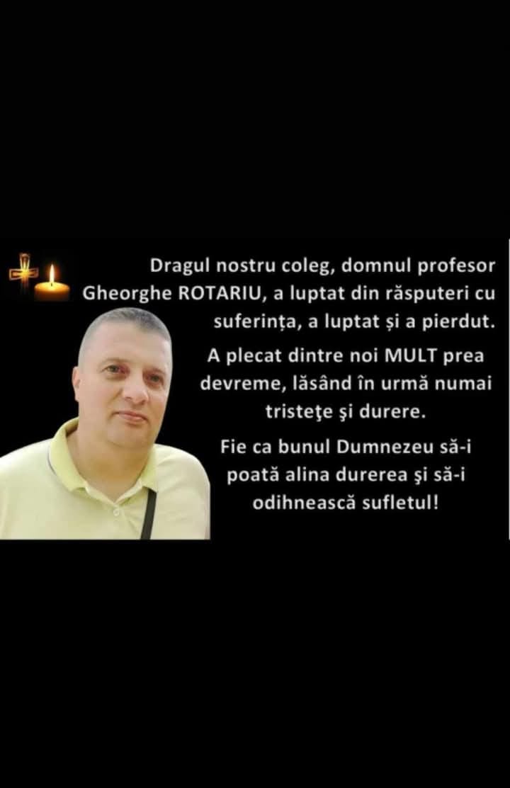 Este vorba despre Gheorghe Rotariu, care a trecut la cele veșnice joi, după o suferință din cauza unei boli crunte. Fiind foarte respectat în rândul colegilor de catedră, dar și al elevilor săi, moartea sa a căzut ca un trăsnet peste cei care l-au cunoscut.