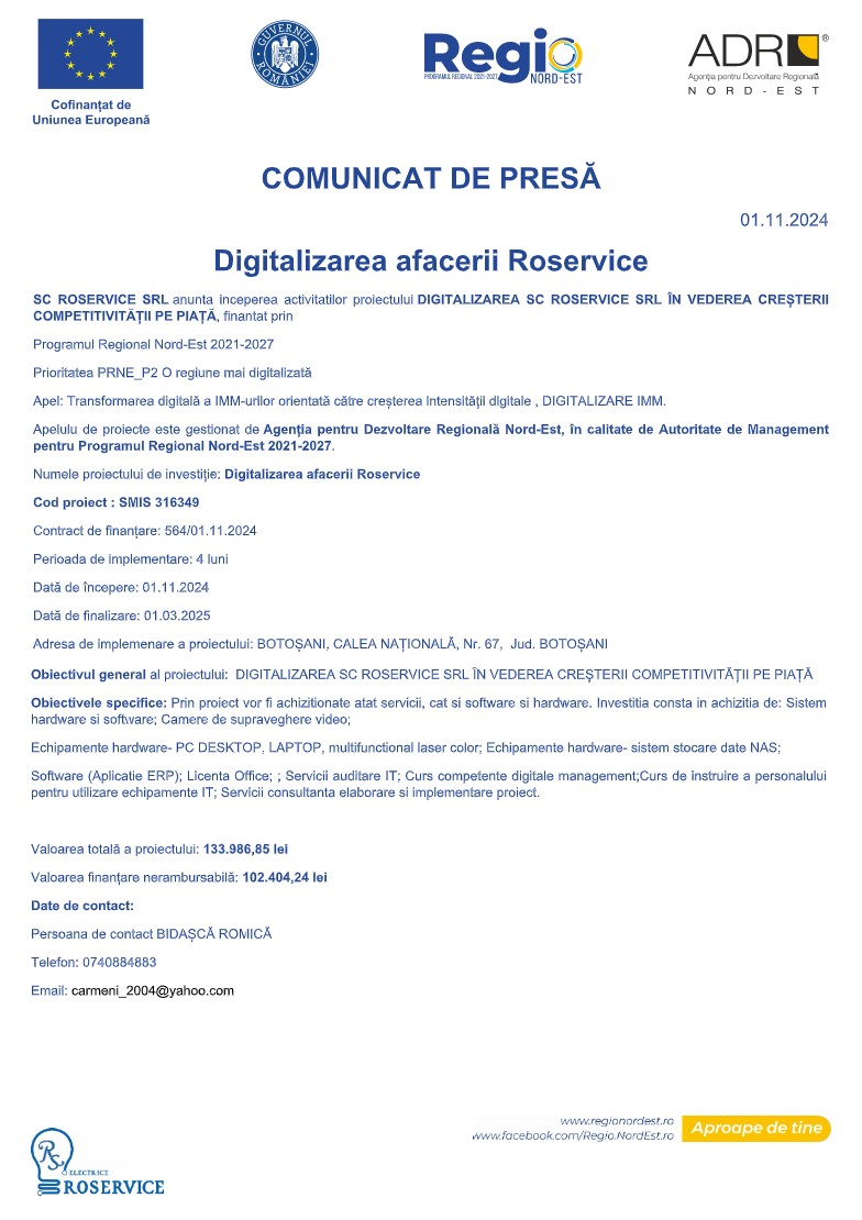 SC ROSERVICE SRL anunta inceperea activitatilor proiectului DIGITALIZAREA SC ROSERVICE SRL ÎN VEDEREA CREȘTERII COMPETITIVITĂȚII PE PIAȚĂ, finantat prin