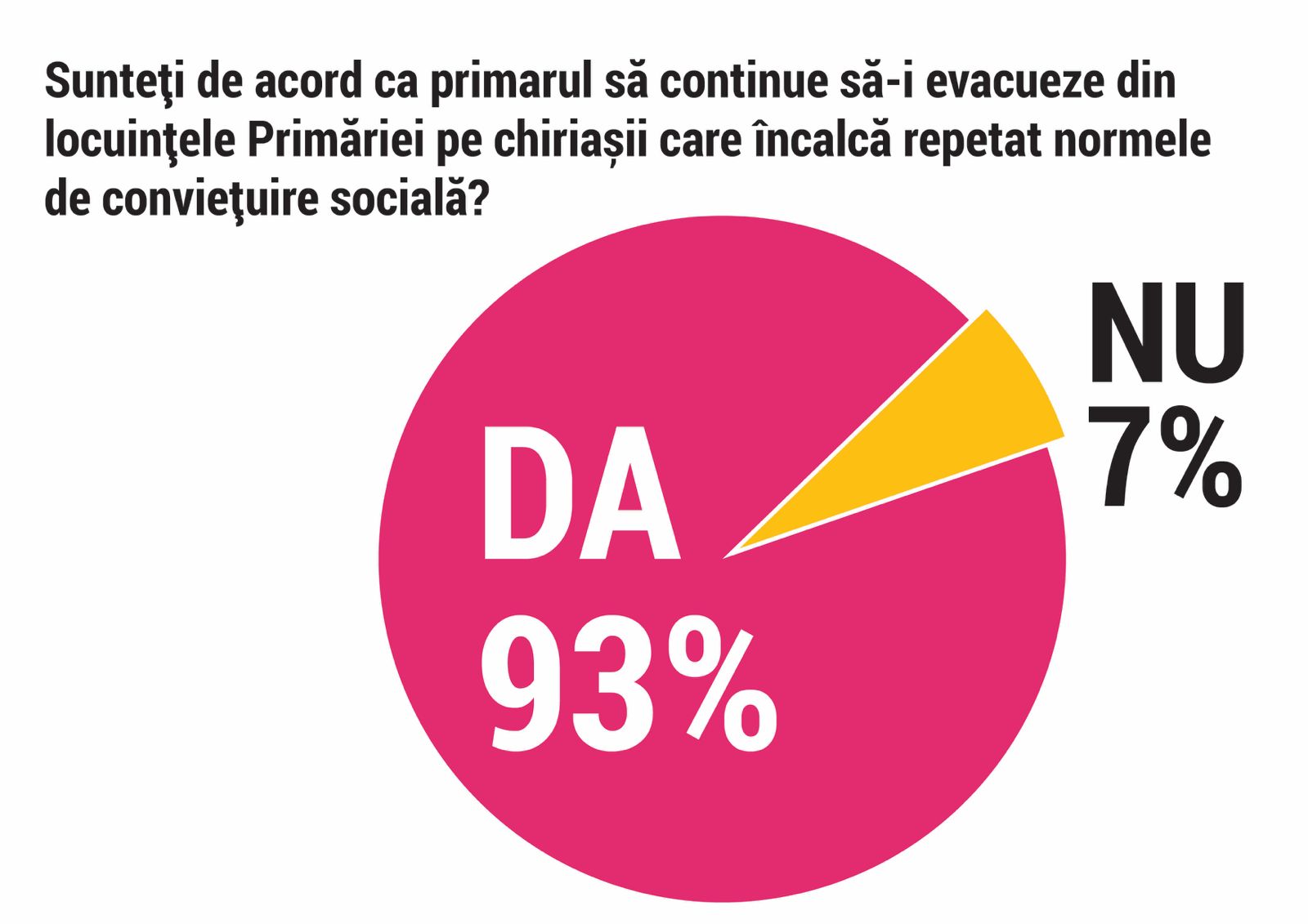 Potrivit edilului, 93% dintre respondenți au răspuns DA la întrebarea dacă sunt de acord ca primarul să continue evacuarea și doar 7% au fost de acord cu intervenția în instanță a avocatei PNL Botoșani (candidată pe lista PNL la Senat) prin care a suspendat temporar acțiunea Primăriei.