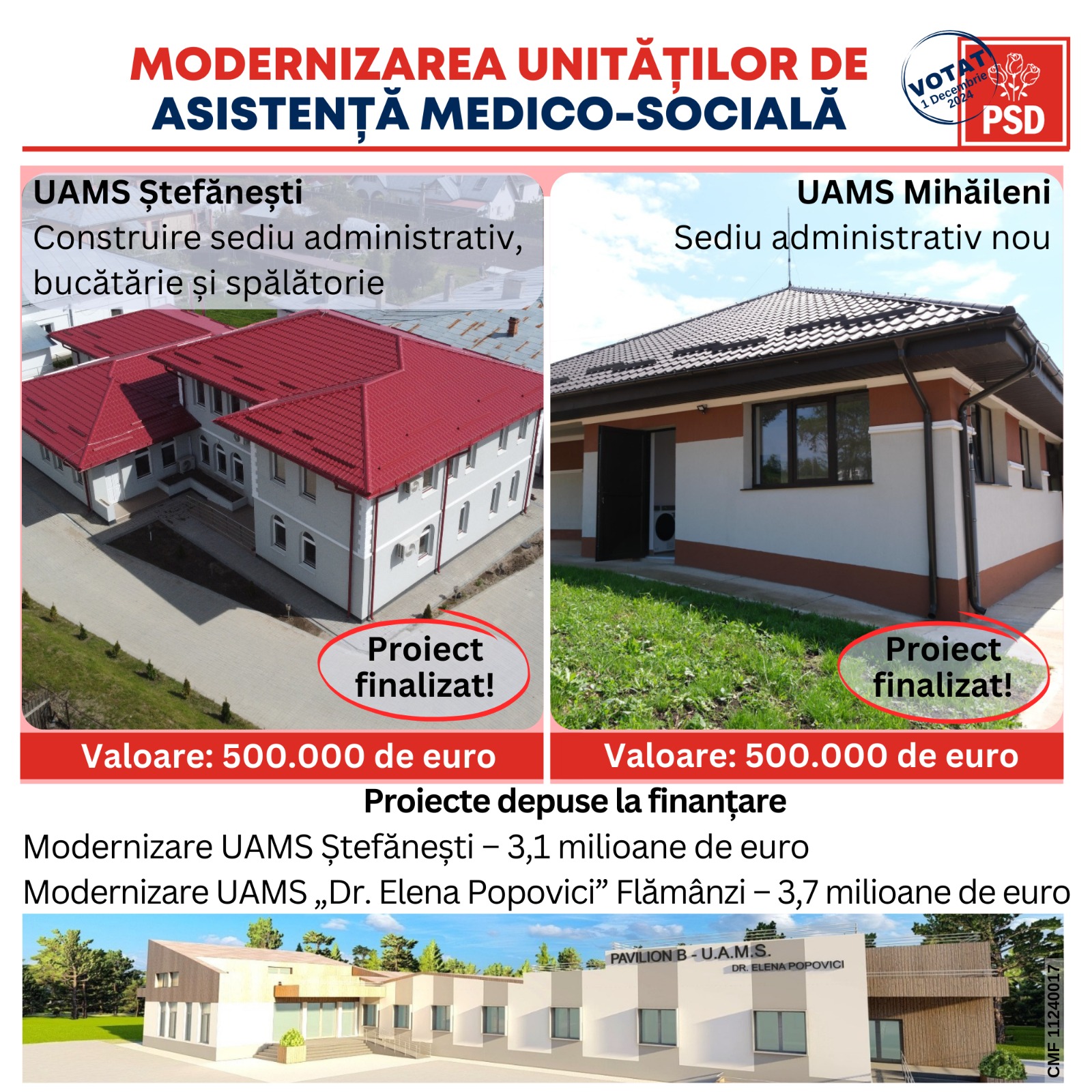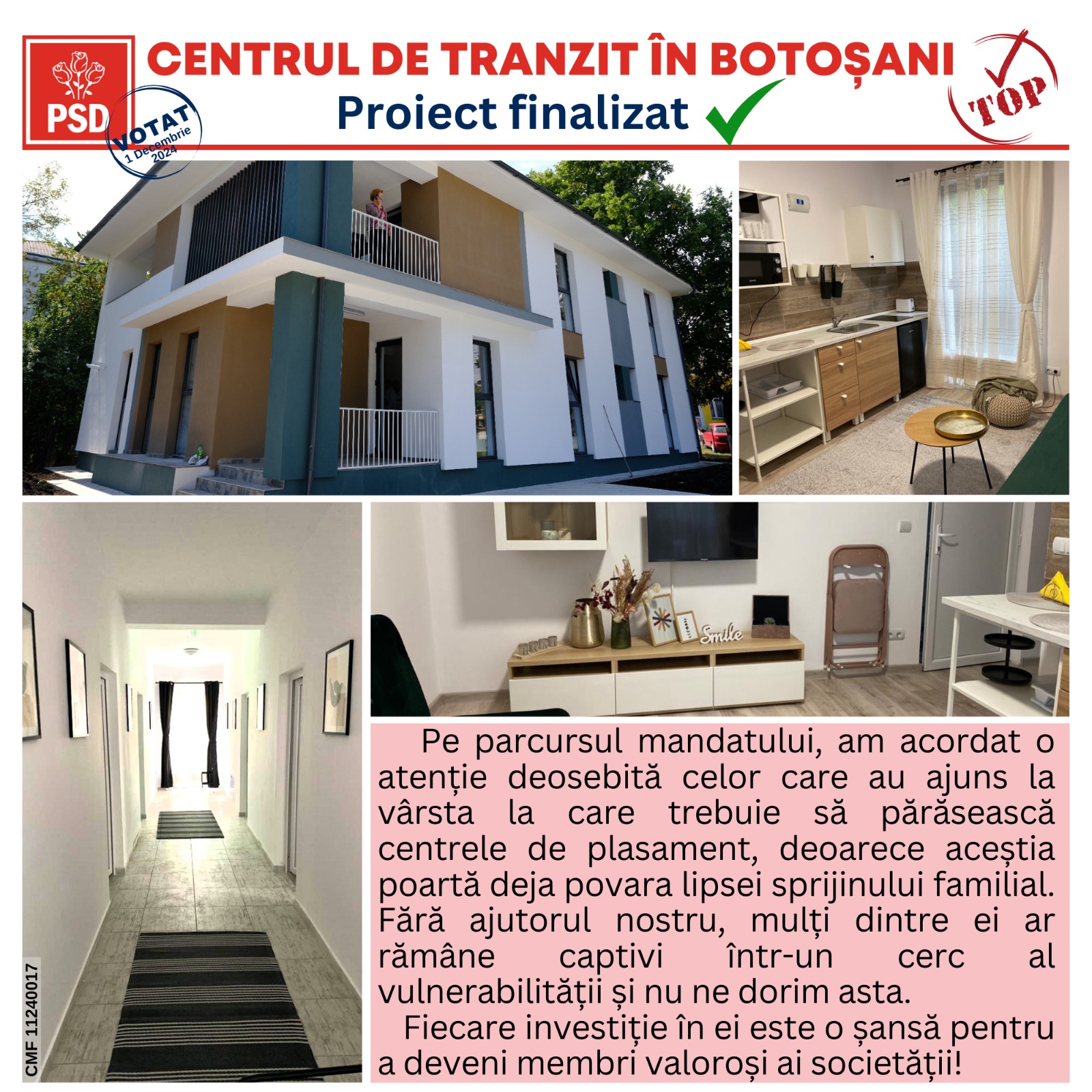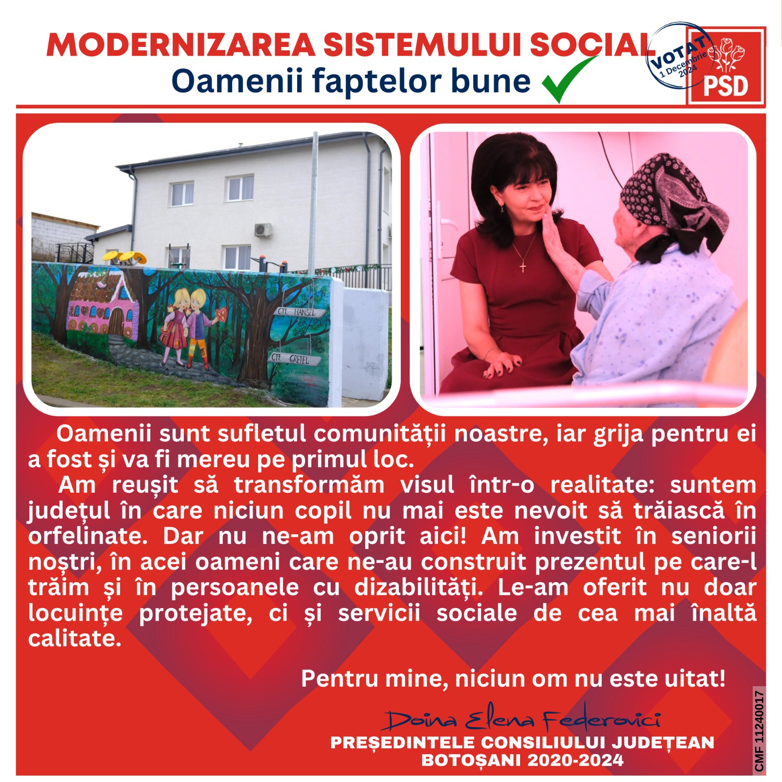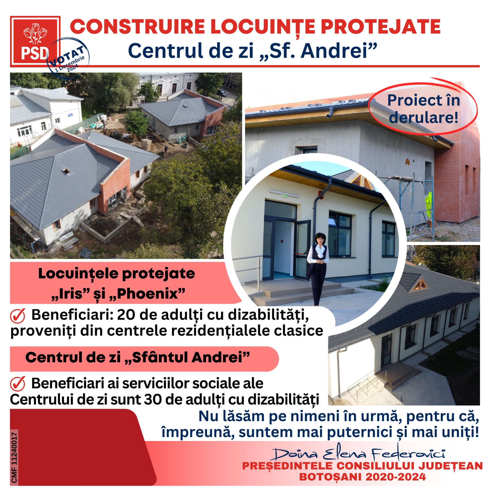 „Suntem oamenii faptelor bune, iar fiecare investiție realizată vorbește despre angajamentul nostru față de comunitate și față de cei care au nevoie de noi. Nu lăsăm pe nimeni în urmă! Pe 1 decembrie, vă invităm să ne susțineți în alegerile parlamentare. Votați pentru continuitatea acestor investiții și pentru un viitor mai bun pentru toți. Voi continua să fiu un susținător puternic al sistemului de asistență socială din postura de senator, așa cum am fost și primele două mandate. Votați candidații PSD, poziția 3 pe buletinul de vot! Împreună, suntem mai puternici și mai uniți!”, a conchis Doina Federovici.