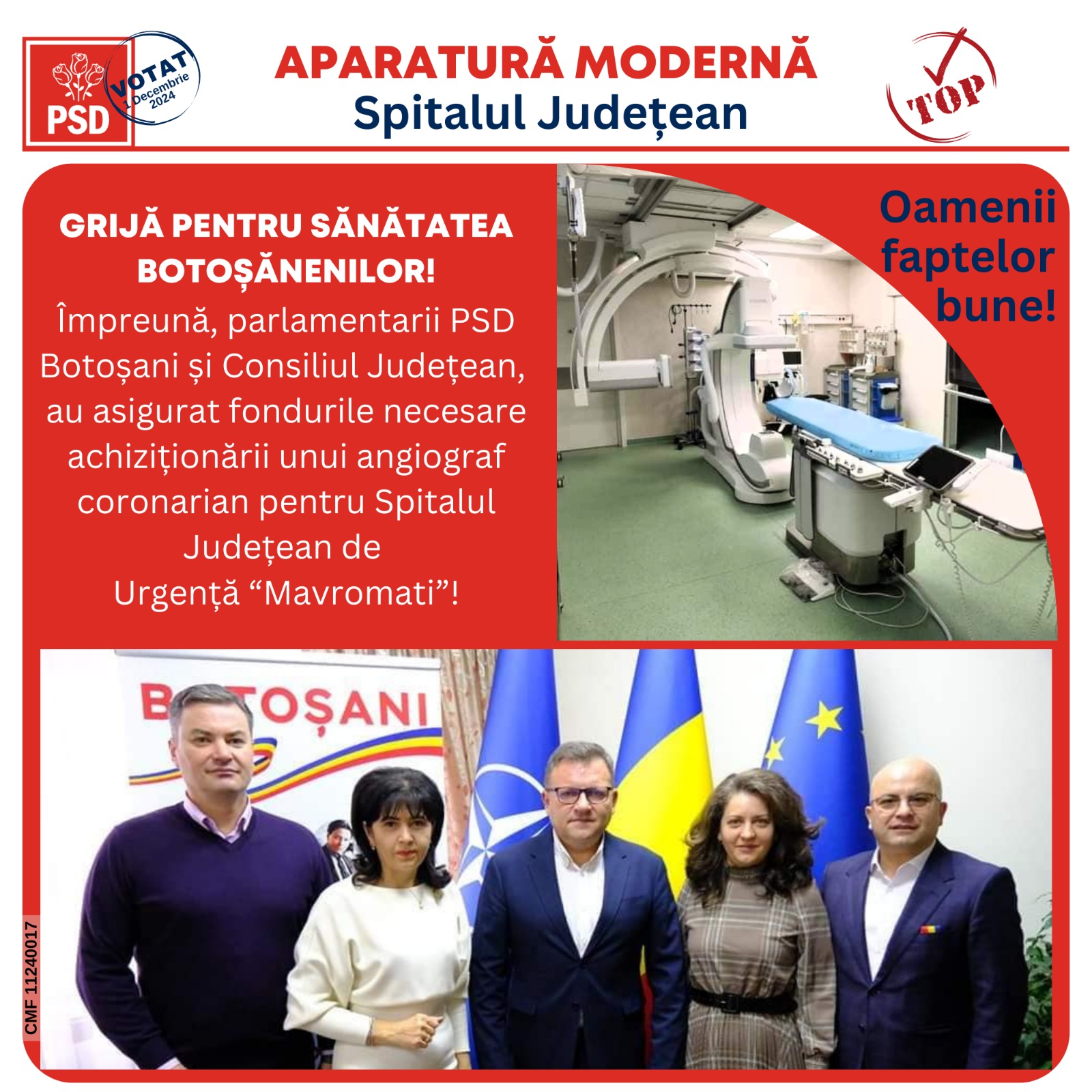 Dotarea sistemului sanitar cu aparatură medicală de ultimă generație a fost prioritară și pentru echipa de parlamentari PSD, care, printr-un amendament la Legea bugetului pe anul în curs, au alocat bani pentru achiziționarea unui angiograf coronarian.