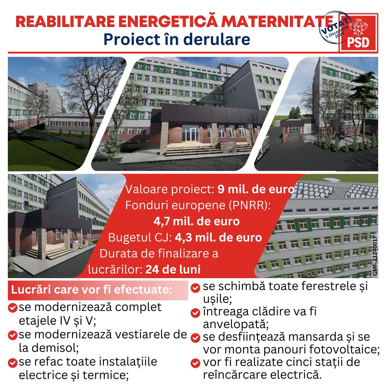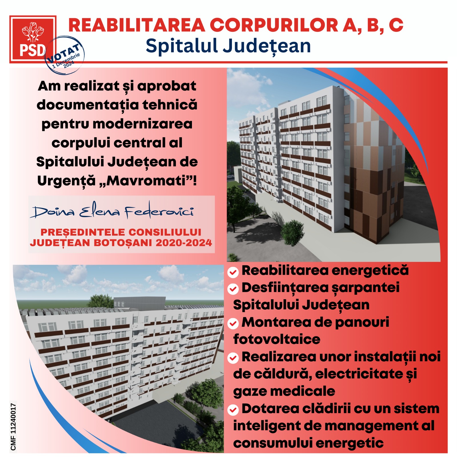 De asemenea, am demarat proiecte majore, care sunt în diferite stadii de implementare și care, odată ce vor fi finalizate, vor schimba radical fața sistemului sanitar botoșănean. Printre acestea sunt cele două cu fonduri atrase din PNRR și care vizează modernizarea și eficientizarea energetică a Blocului alimentar, a magaziei de alimente și spălătoriei centrale a Spitalului Județean, precum și modernizarea și eficientizarea energetică a Maternității Botoșani. În cadrul acestor proiecte, clădirile sunt reabilitate din punct de vedere energetic. Se refac instalațiile electrice și cele termice, se schimbă geamurile și ușile. La Maternitate, se desființează mansarda pentru a se monta panouri fotovoltaice.  Se instalează și patru stații de reîncărcare electrică. De asemenea, se modernizează etajele IV și V, dar și vestiarele din zona de demisol”, a mai spus liderul social-democraților botoșăneni.