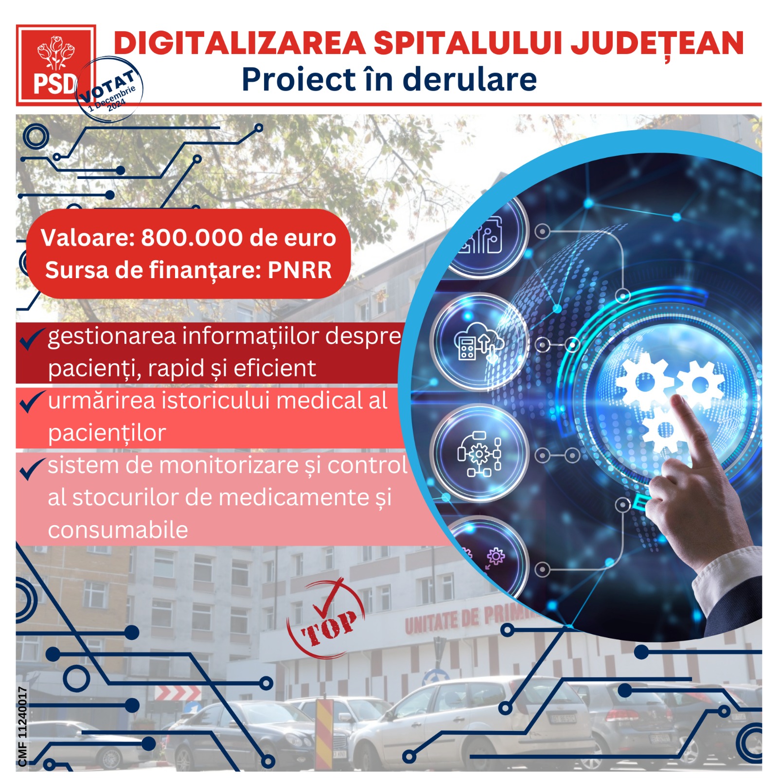 • Digitalizarea tuturor secțiilor Spitalului Județean prin intermediul unei finanțări PNRR;