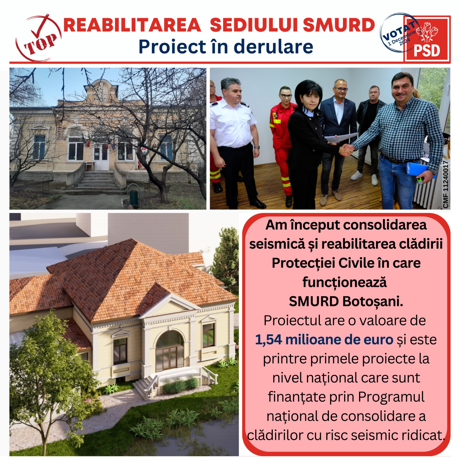 • Consolidarea seismică a clădirii Protecției civile în care funcționează sediul SMURD;