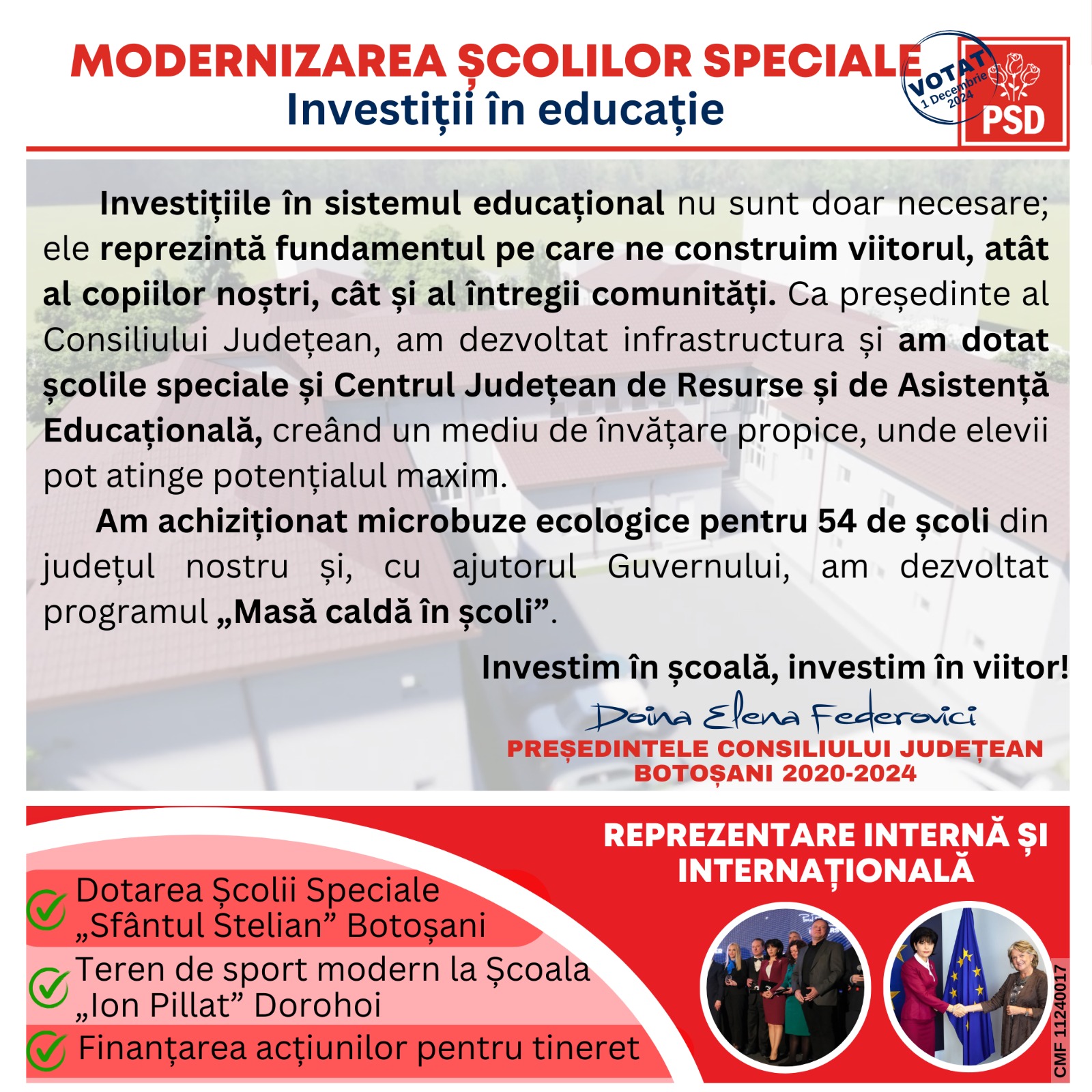 „Pentru a avea un viitor mai bun, trebuie să investim în educația copiilor noștri. Doar printr-un sistem educațional solid și de calitate putem asigura un progres continuu al societății noastre, iar acest lucru se reflectă direct în dezvoltarea individuală a fiecărui elev și în succesul colectiv pe termen lung. În ultimii patru ani, am depus eforturi semnificative pentru a transforma învățământul din județul nostru într-un mediu modern, eficient și propice dezvoltării tinerelor talente. Alături de colegii primari, am alocat resurse considerabile pentru dezvoltarea infrastructurii școlare, iar astăzi, multe dintre unitățile de învățământ dispun de condiții care rivalizează cu cele mai avansate standarde europene”, a declarat Doina Federovici, președintele PSD Botoșani.