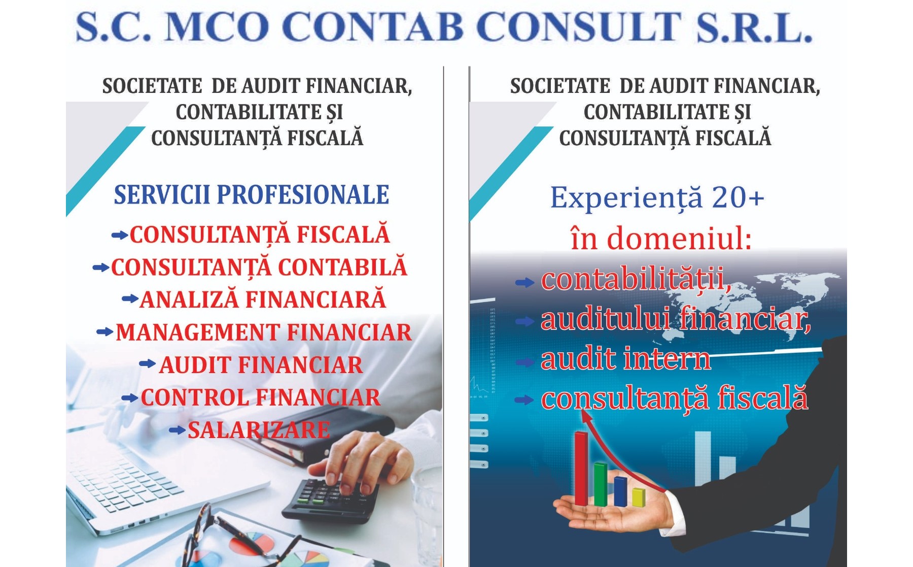 Societatea MCO Contab Consult SRL din Botoșani oferă servicii de contabilitate, salarizare, consultanță fiscală și audit financiar pentru orice persoană fizică sau juridică interesată. Cu o experiență de peste 20 de ani în domeniul contabilității, auditului financiar, auditului intern și consultanței fiscale, MCO Contab Consult SRL vine în întâmpinarea firmelor sau persoanelor fizice cu servicii profesionale de înaltă calitate.