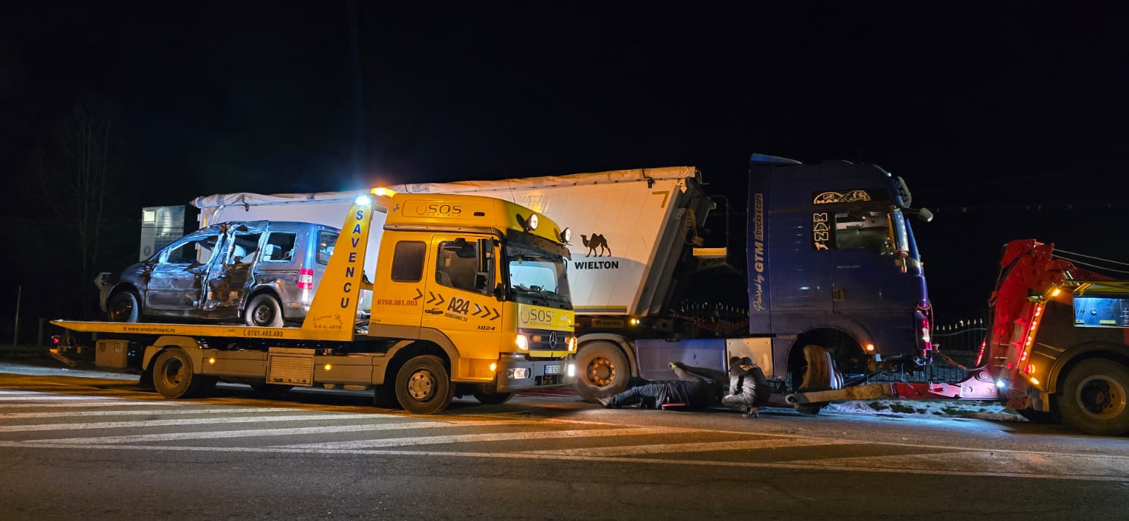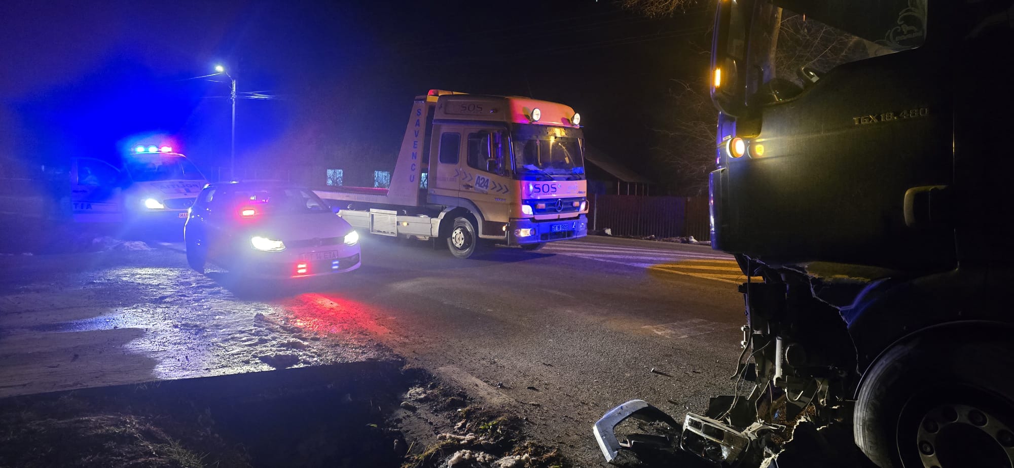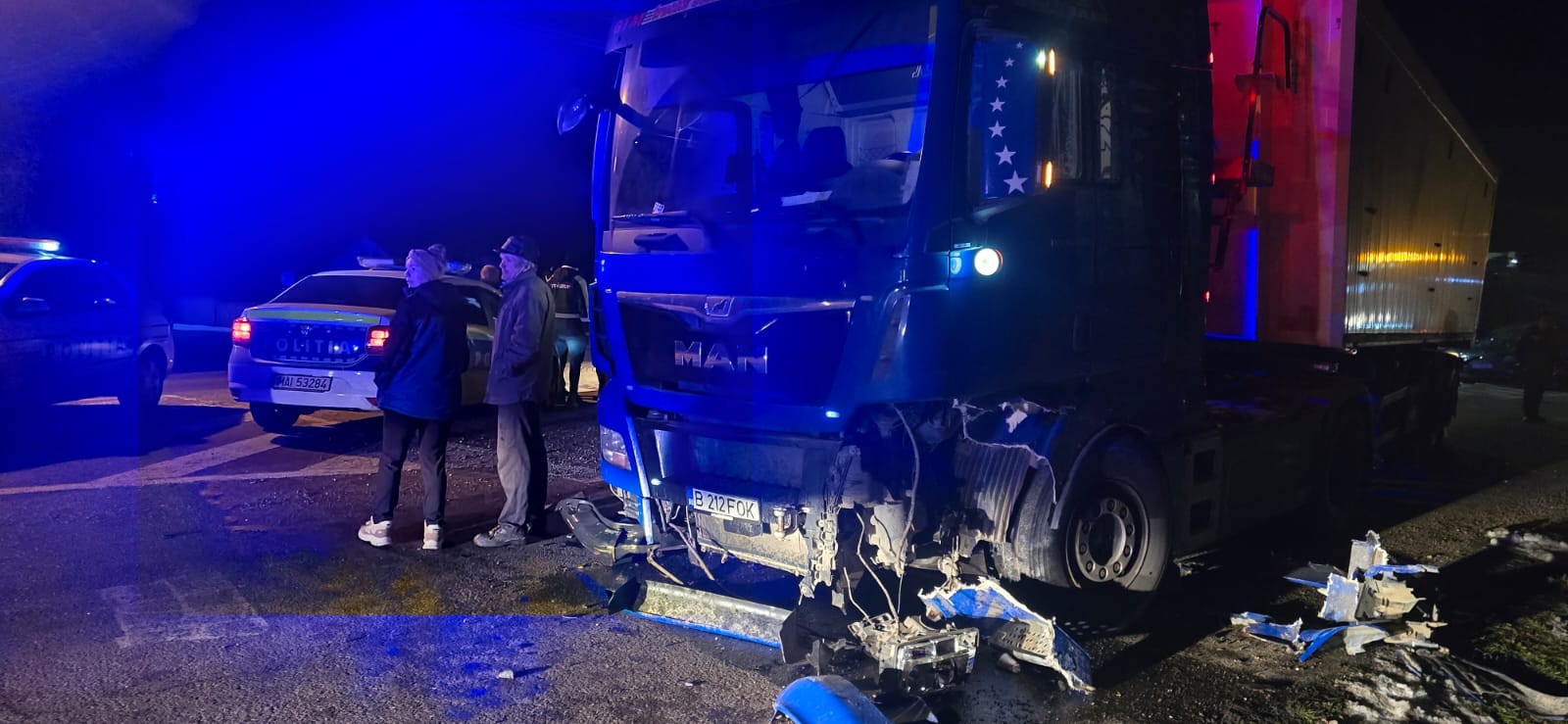 Camionul, care venea dinspre Tudora, a intrat neregulamentar în sensul giratoriu, lovind un Volkswagen Caddy care circula regulamentar.