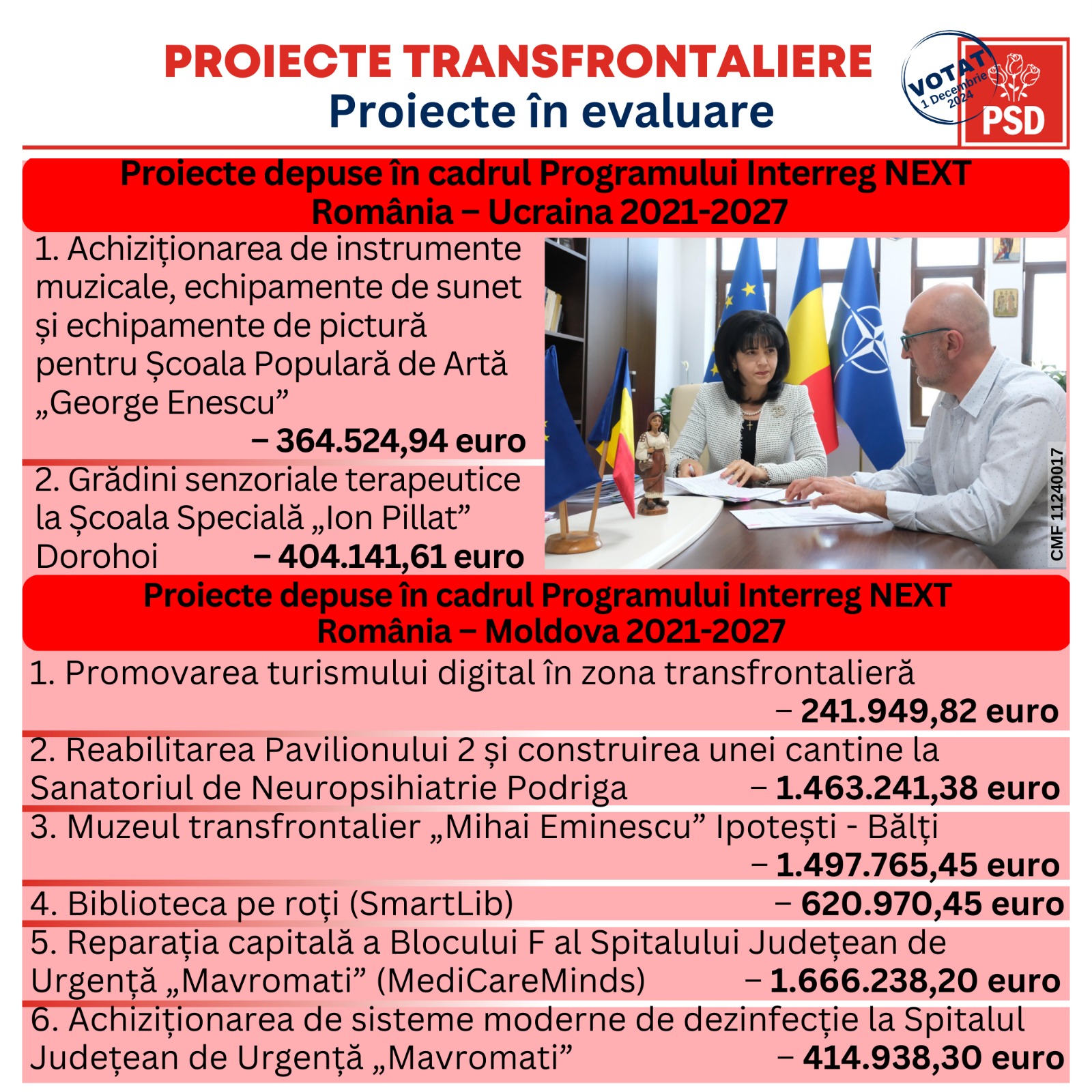 Cooperarea transfrontalieră este foarte importantă pentru că oferă posibilități de finanțare a unor proiecte în comun. Pe programele transfrontaliere, echipa coordonată de Doina Federovici a implementat proiectele privind restaurarea Casei Memoriale „George Enescu” și dotarea celor două școli speciale cu echipamente moderne, mobilier și utilaje pentru atelierele de croitorie, precum și construirea unui teren de sport multifuncțional la Școala „Ion Pillat” Dorohoi.