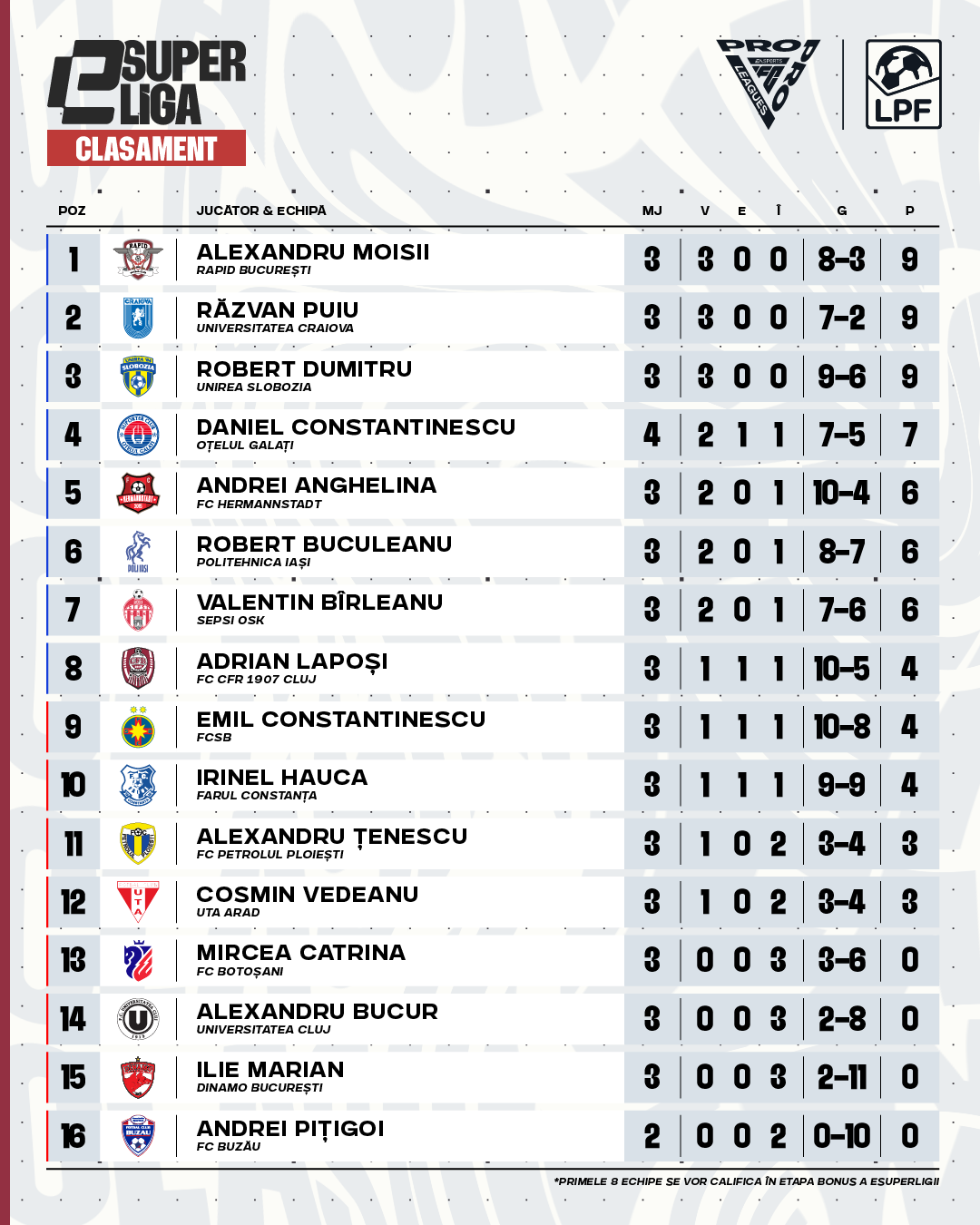 Înaintea celei de-a patra etape din eSuperliga, FC Rapid 1923 (Alexandru Moisii), Universitatea Craiova (Răzvan Puiu) și Unirea Slobozia (Robert Dumitru) conduc clasamentul, cu câte 9 puncte.