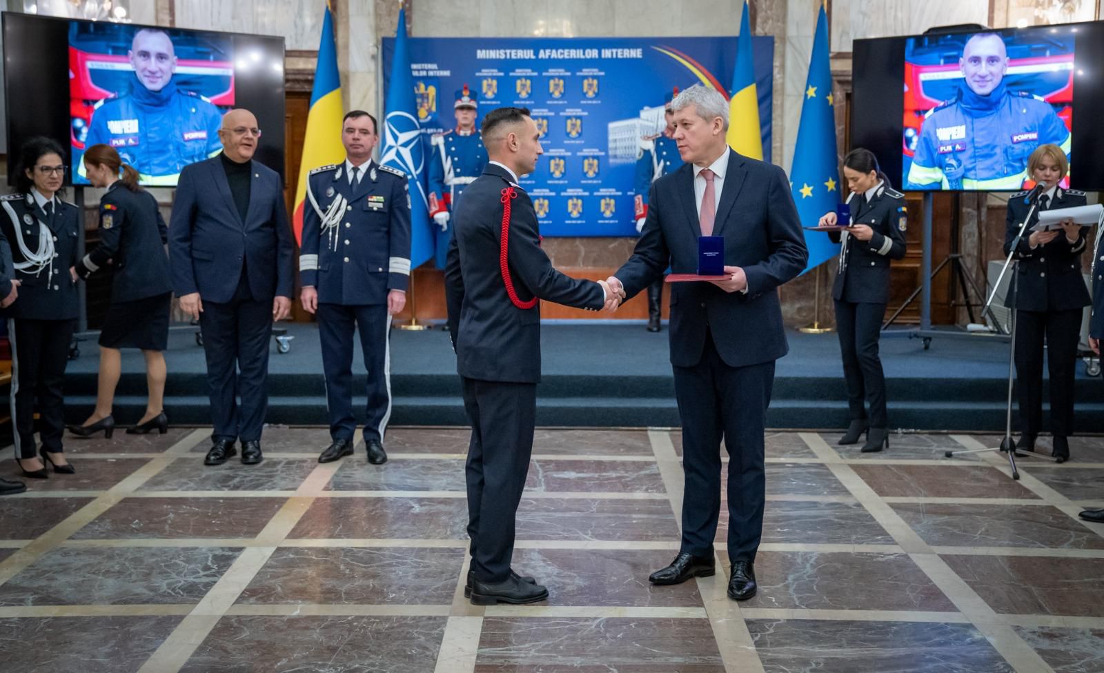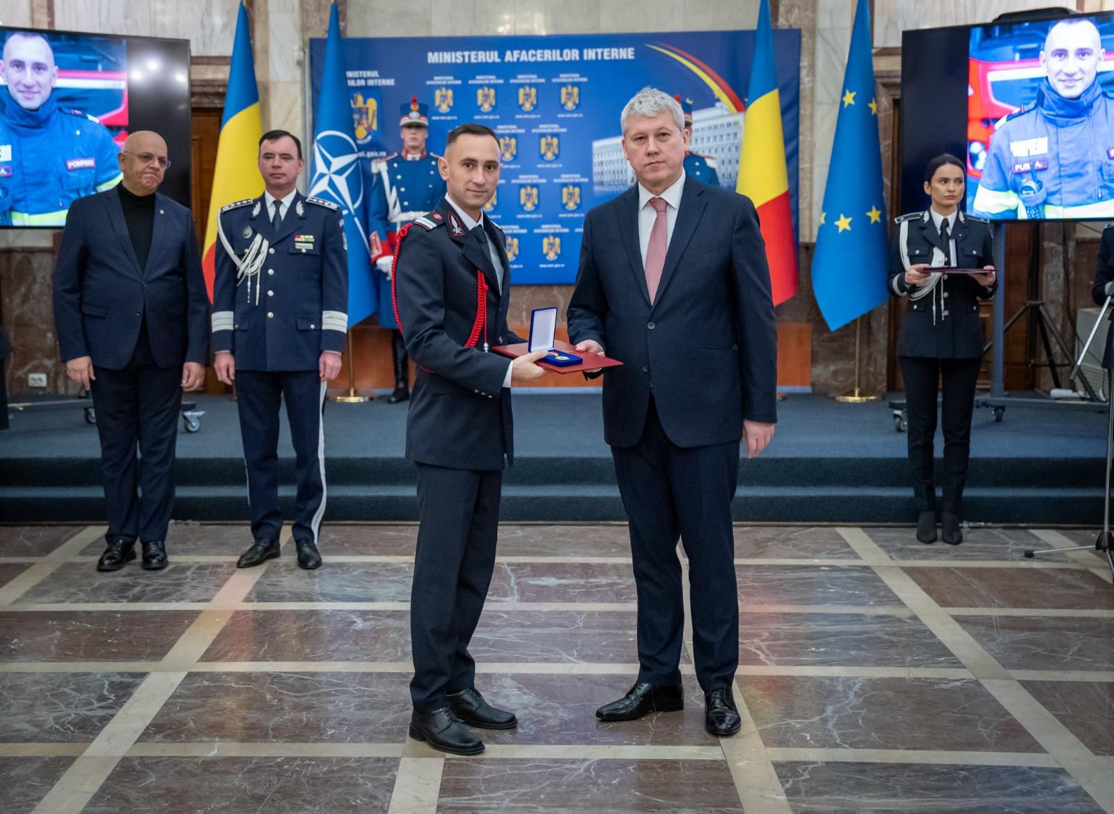 Ministrul Afacerilor Interne, Cătălin Predoiu, i-a oferit distincția, luni, în cadru festiv. Acesta a fost felicitat și de șeful Departamentului pentru Situații de Urgență, dr. Raed Arafat și de inspectorul general al IGSU, general Dan Paul Iamandi.