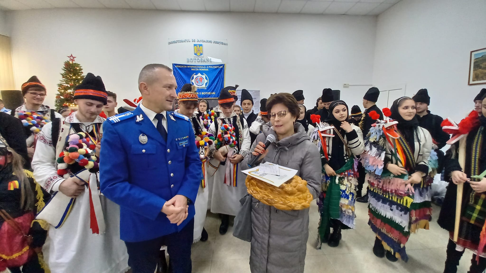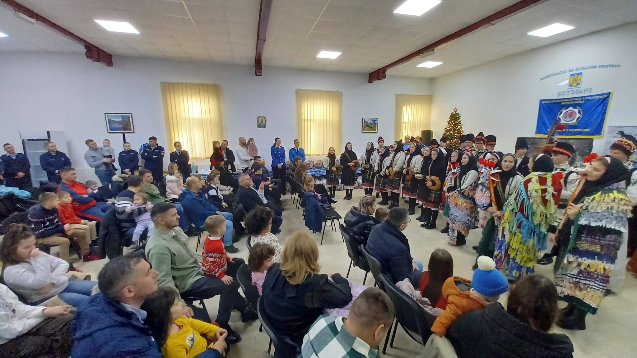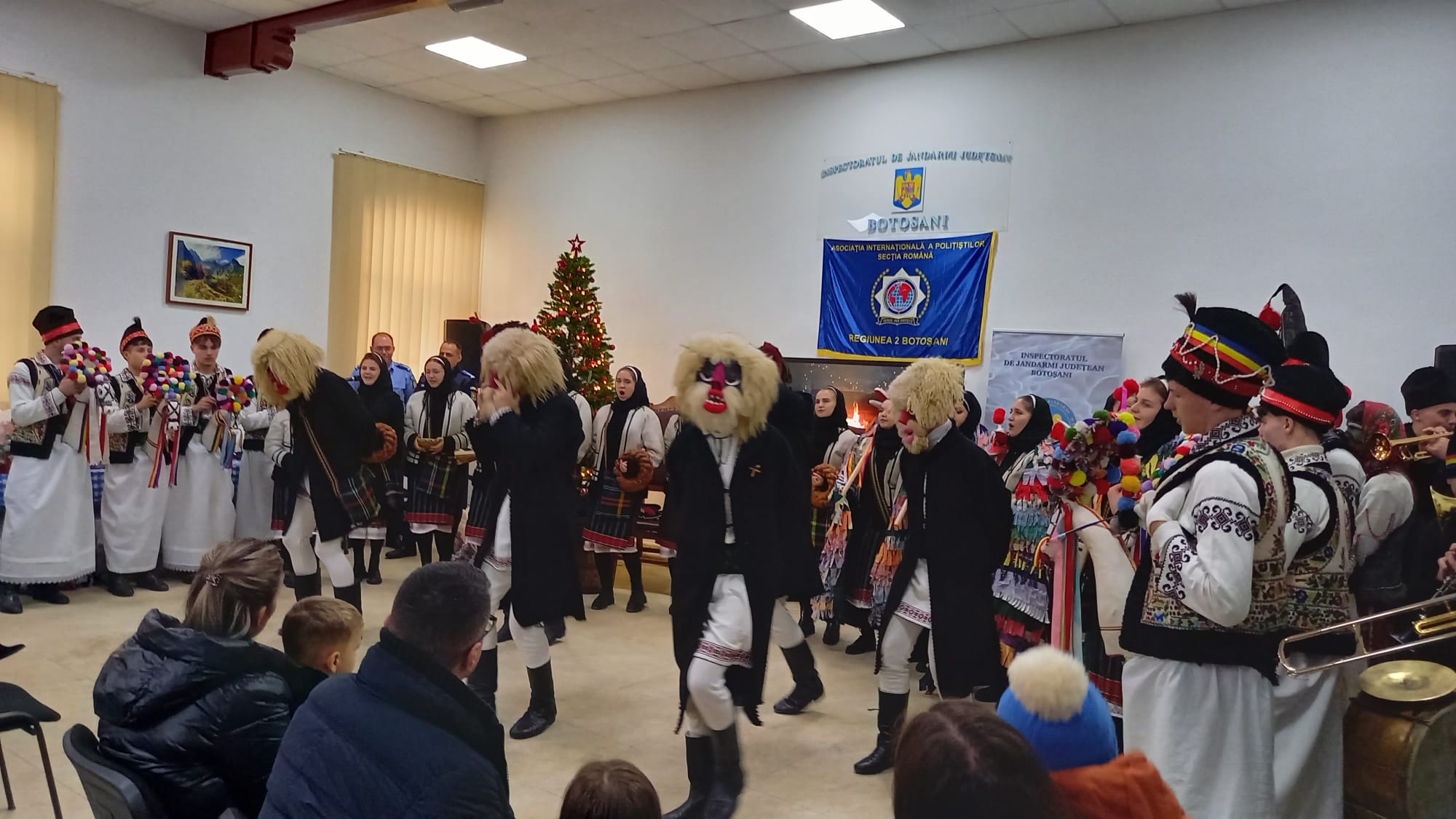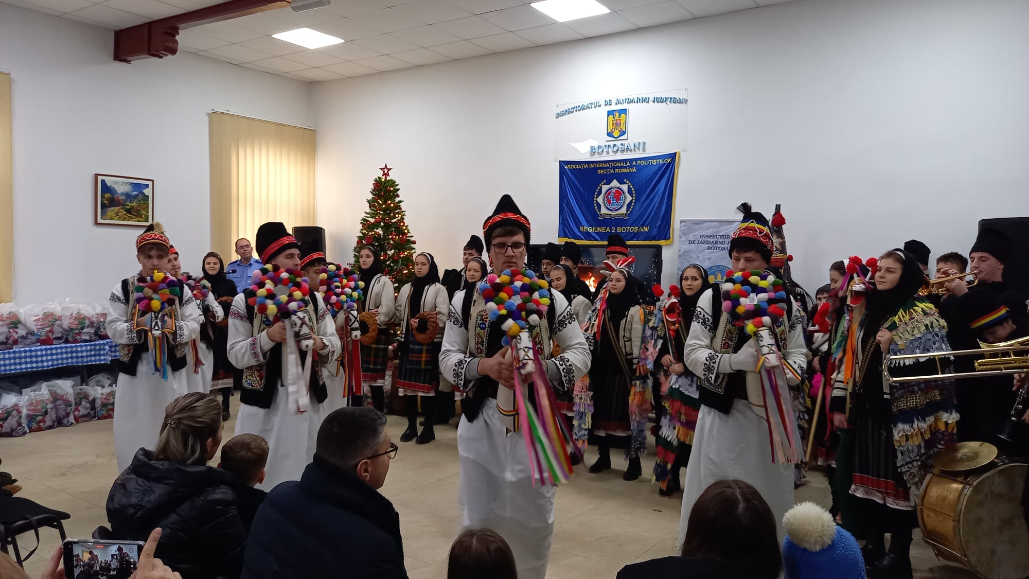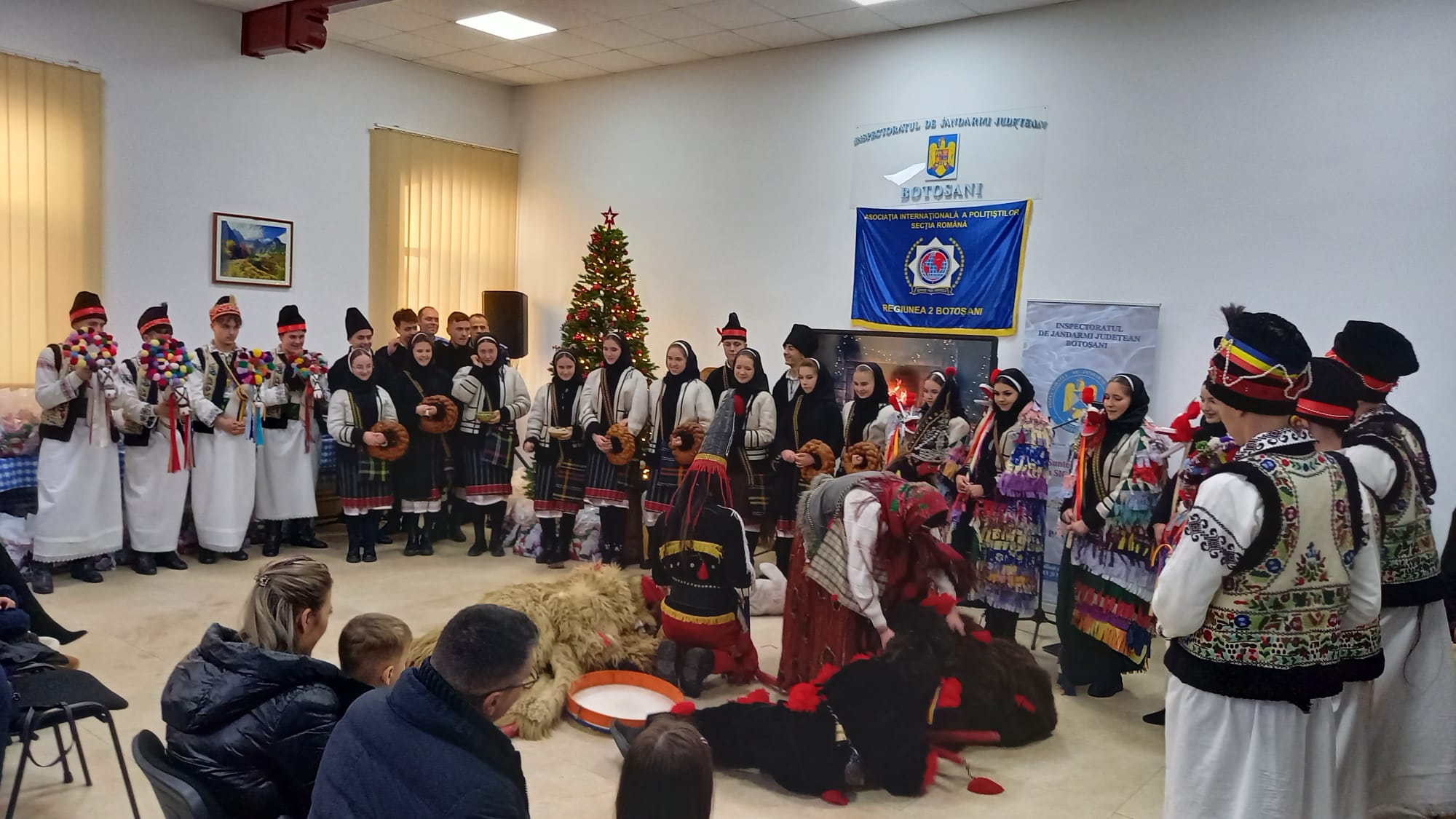 Ansamblul de datini și obiceiuri tradiționale ,,Codrulețul", coordonat de profesoara Ligia Marica, a onorat vineri după-amiază invitația de a prezenta un spectacol pentru copiii jandarmilor botoșăneni, la evenimentul ,,Pomul de Crăciun - 2024".