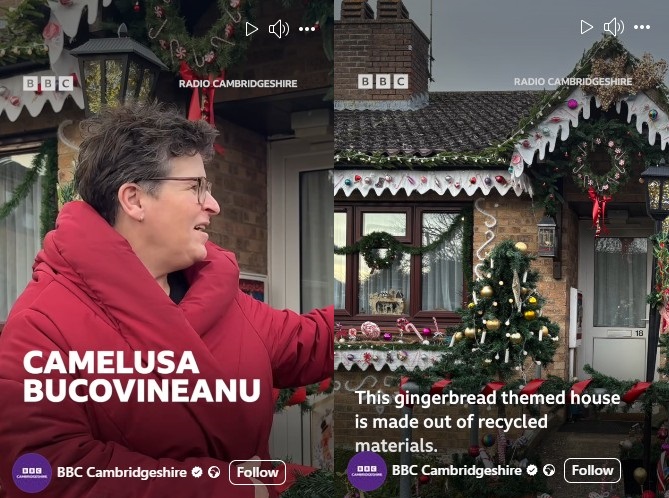 Camelia Bucovineanu, o botoșăneancă stabilită în Anglia, a devenit recent subiectul unui reportaj realizat de BBC. Jurnaliștii au căutat în Cambridgeshire casele cele mai frumos decorate de Crăciun. Locuința româncei a atras atenția, iar jurnaliștii au botezat-o imediat „Casa de turtă dulce”. Britanicii au fost foarte încântați de decorațiunile creative realizate aproape exclusiv din materiale reciclabile.