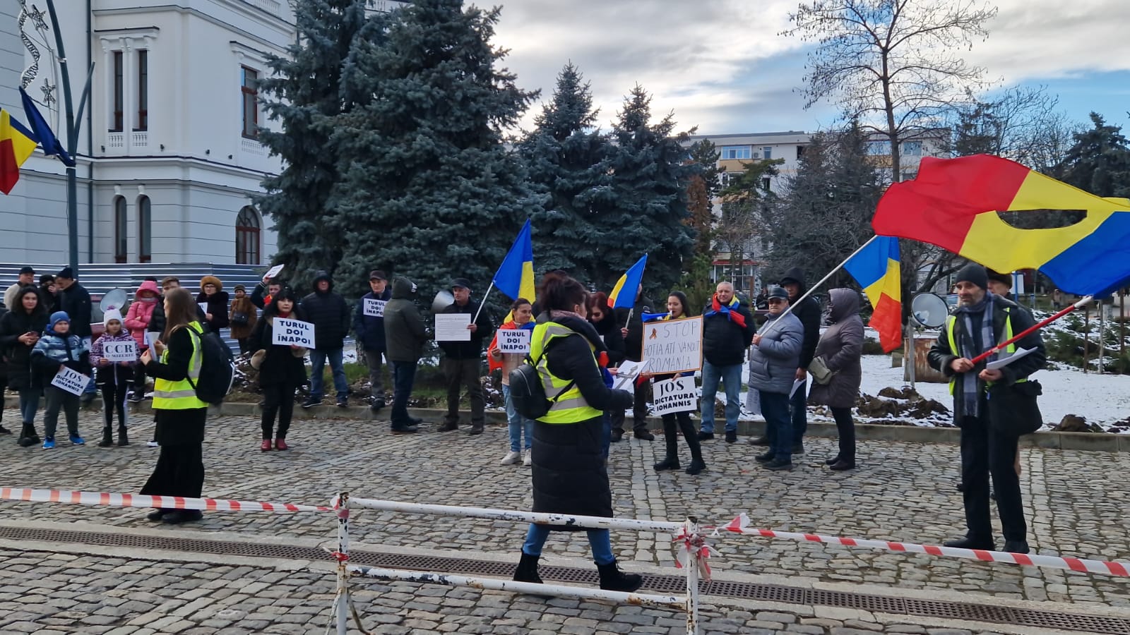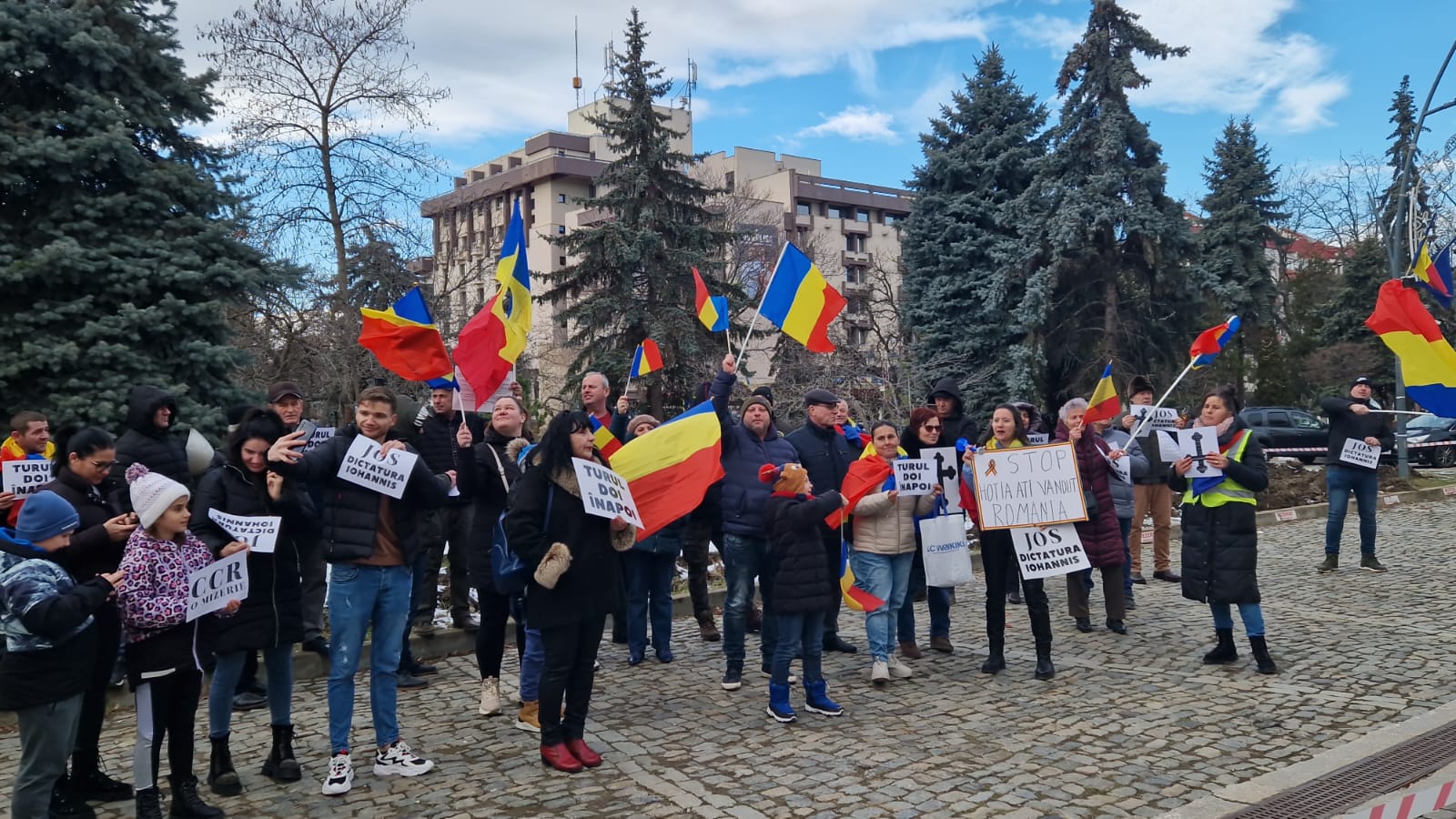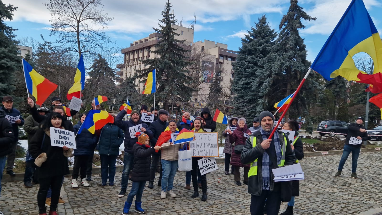 „Turul doi înapoi”, „Jos dictatura Iohannis”, „Stop hoția, ați vândut România”, sunt doar câteva dintre mesajele cu care s-au prezentat cei aproximativ 50 de protestatari.