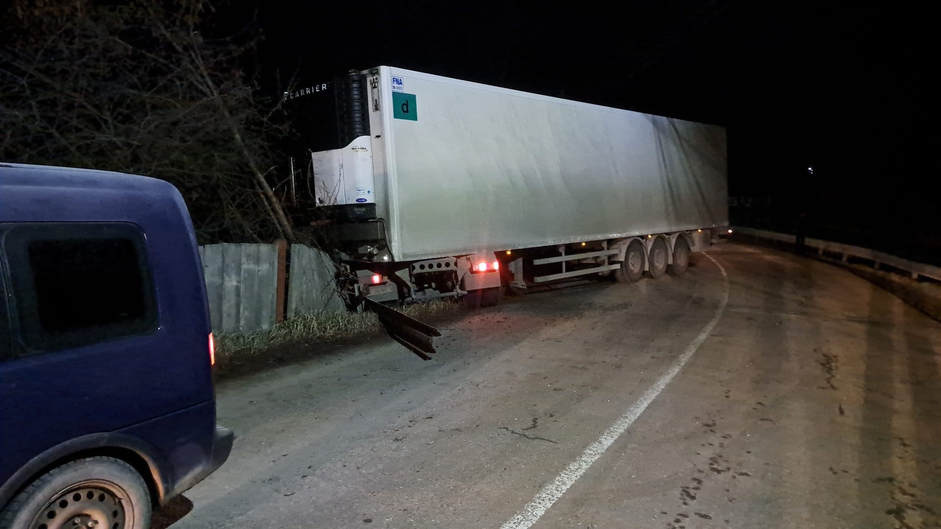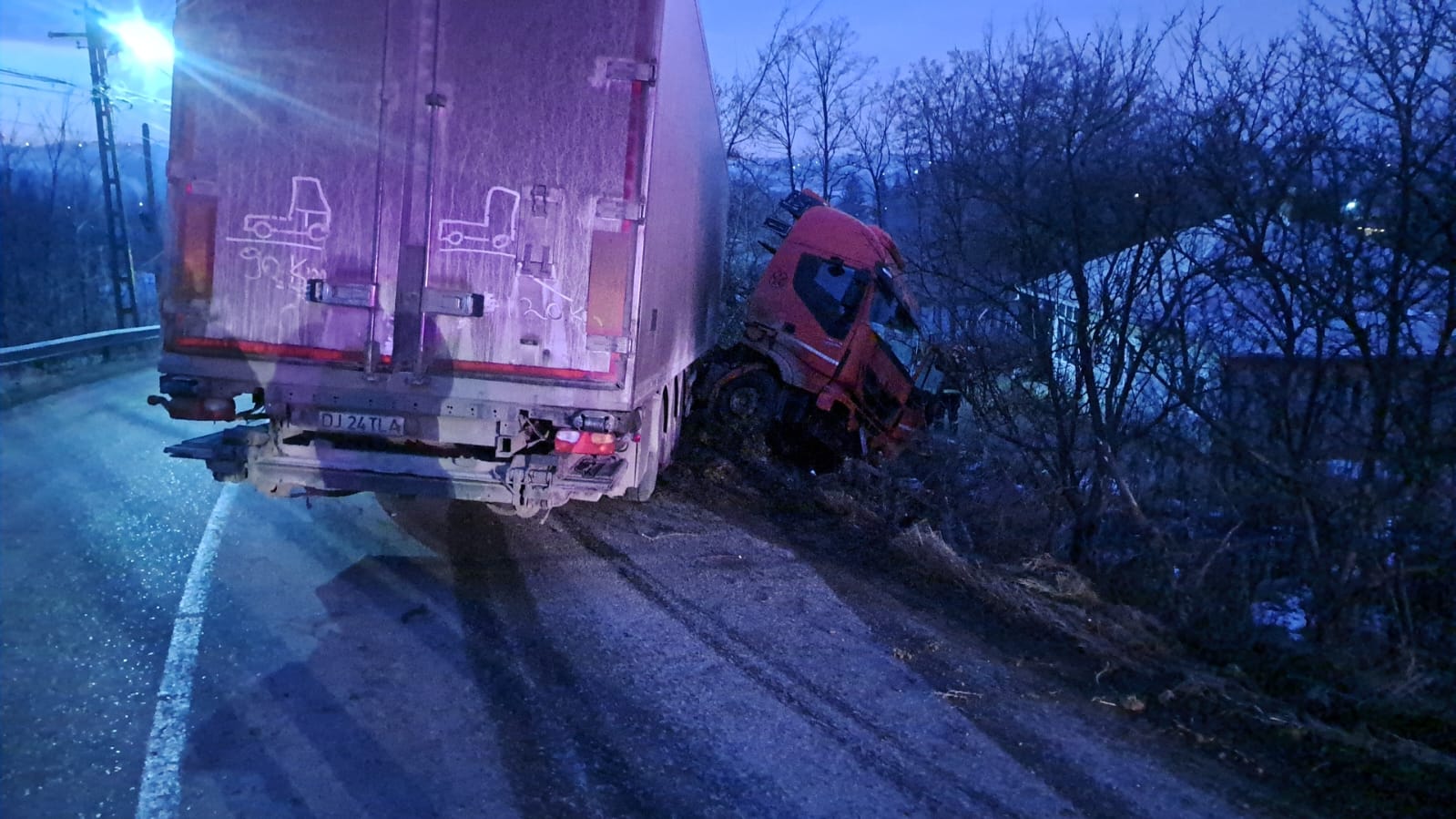Șoferul nu a fost rănit, însă camionul este avariat. Se pare ca viteza, dar și carosabilul cu polei au stat la baza producerii accidentului.