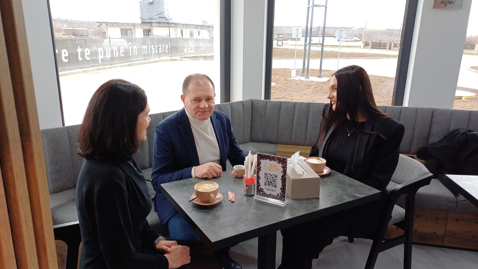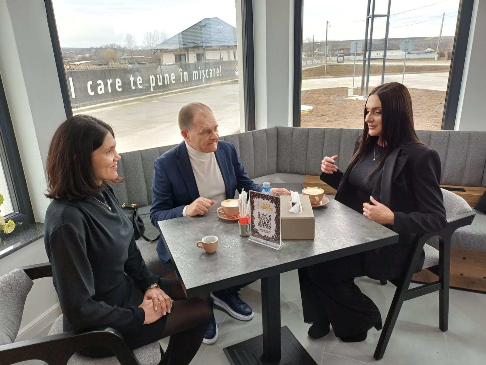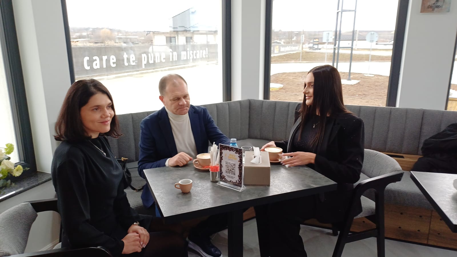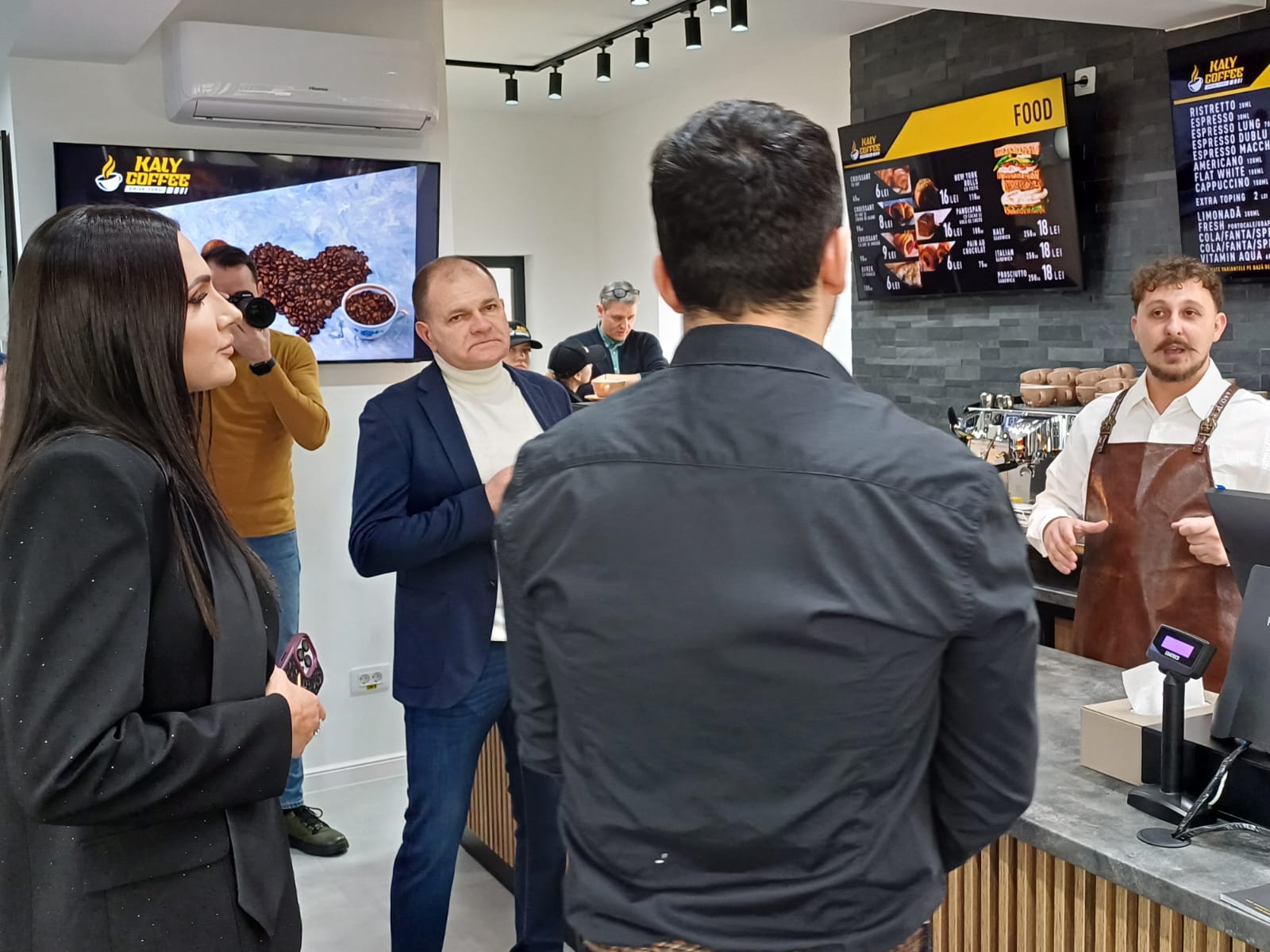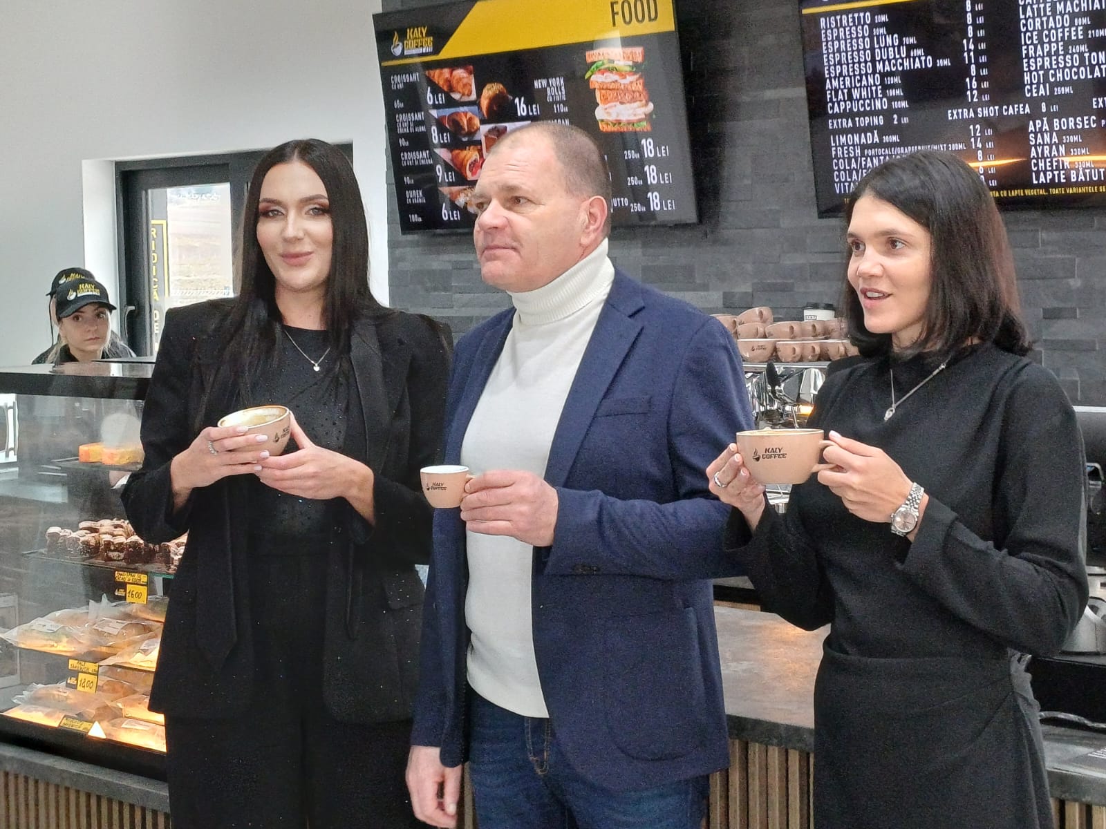 Omul de afaceri Cornel Șfaiter a fost la inaugurare și a băut cafeaua alături de cele două fete ale sale.