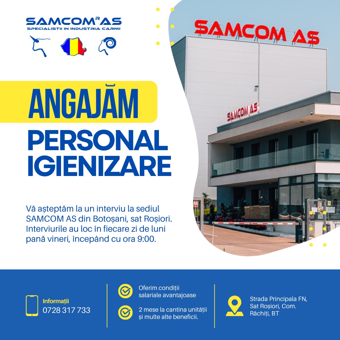Societatea comercială Samcom AS angajează personal de igienizare. Interviurile au loc în fiecare zi de luni până vineri, începând cu ora 9.00.