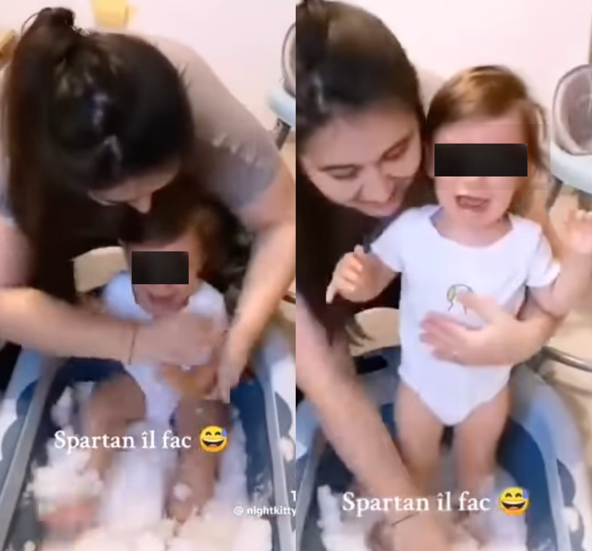 „E rece, iubire! E rece, tăticule! Ia uite ce facem noi la băiat”. În imaginile cumplite postate pe pagina femeii se vede cum un copil care pare să aibă în jur de un an, care este îmbrăcat cu doar un body, este băgat într-o cădiţă umplută cu zăpadă. Instant, micuţul izbucneşte în plâns, în timp ce pe fundal se aud părinţii care se amuză. Imaginile au fost însoţite şi de un mesaj: „Spartan îl fac!”