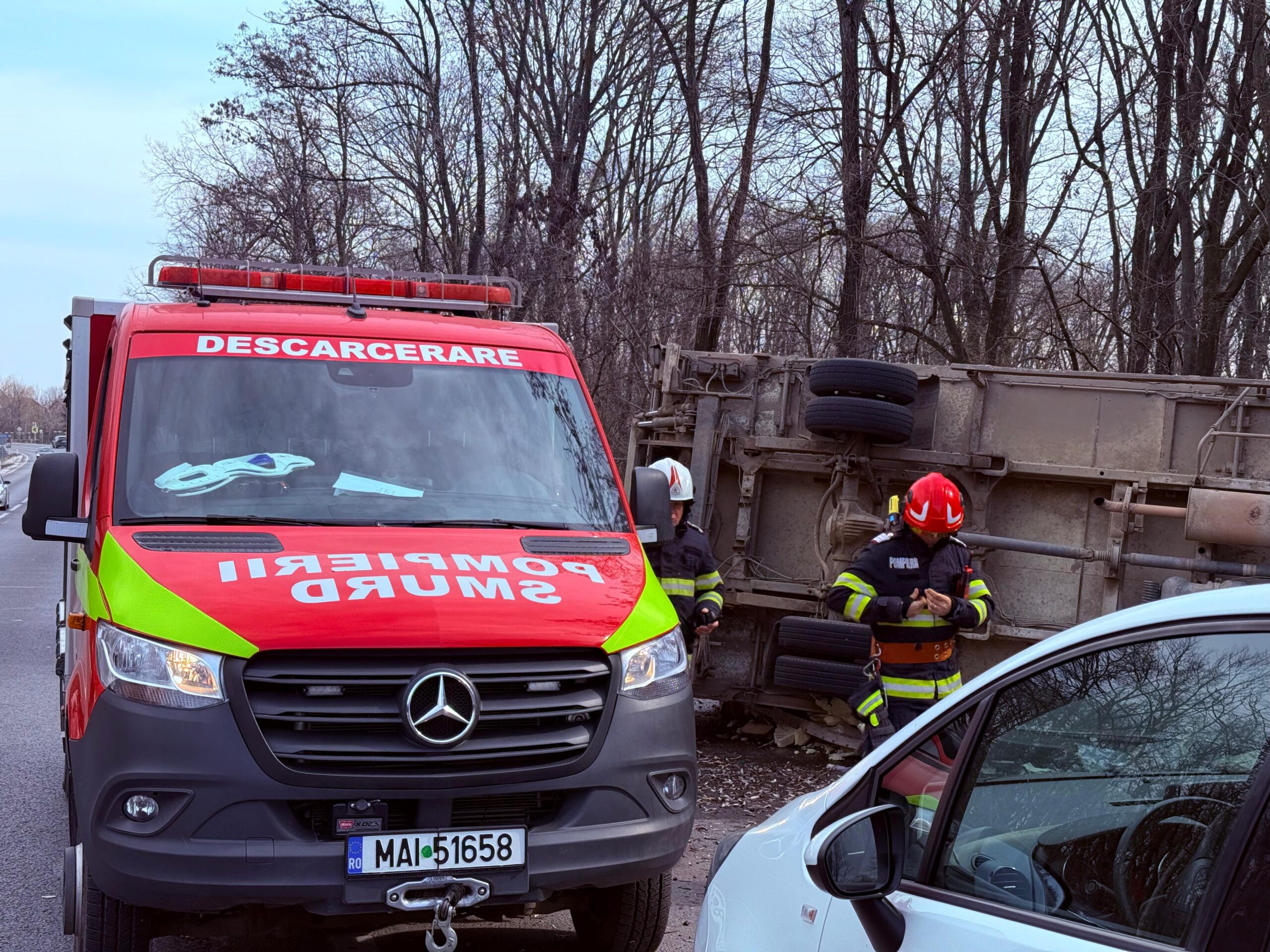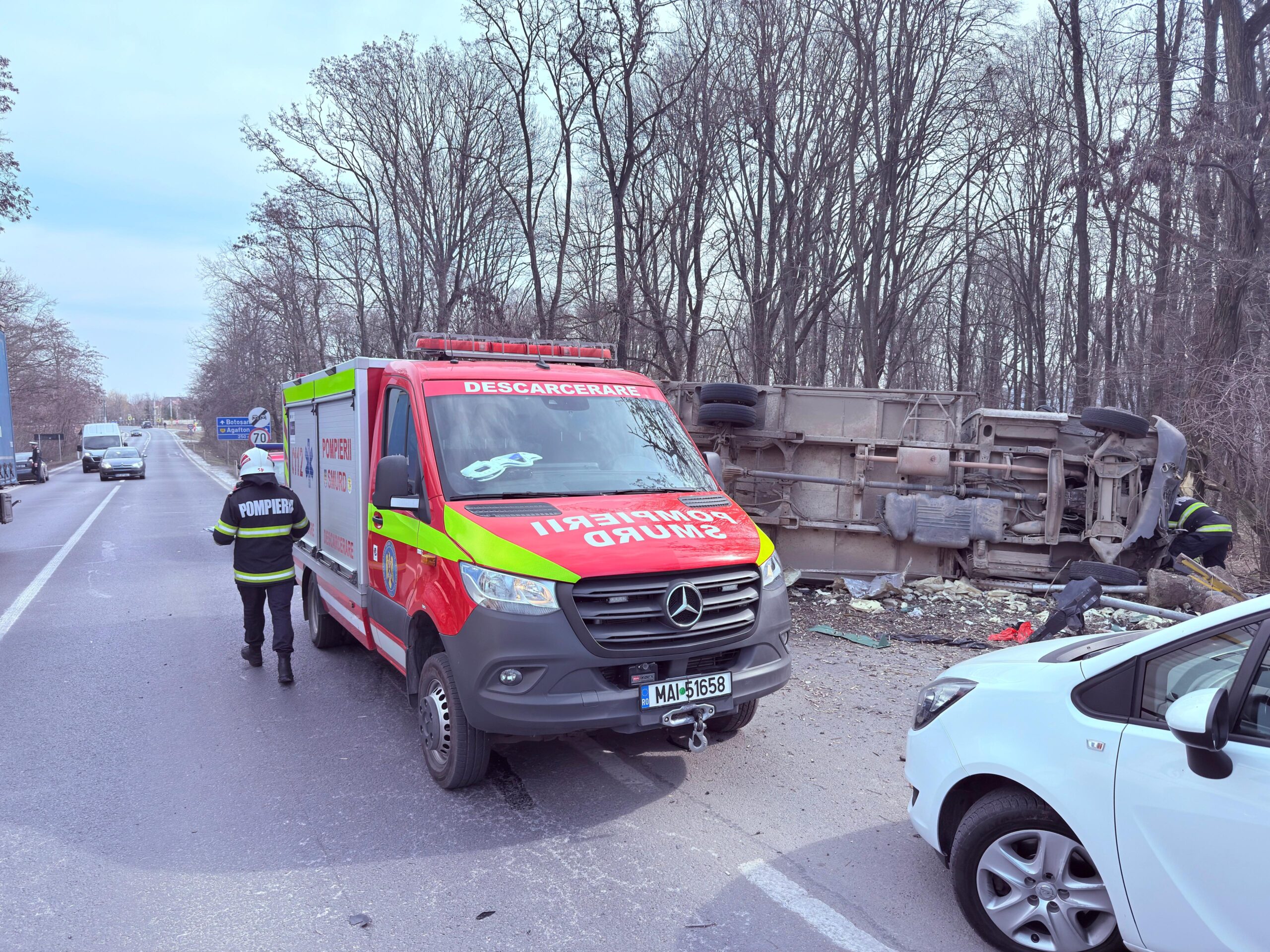 Polițiștii urmează să stabilească cum s-a produs accidentul.Din primele verificări, șoferul unui Audi a acroșat un autoturism BMW, care era în depășirea lui, apoi a lovit o autoutilitară Iveco. Cea din urmă, încărcată cu PET-uri cu bere, s-a răsturnat și a lovit un copac. Autoturismul BMW era de la firma ABC- Con Internațional.