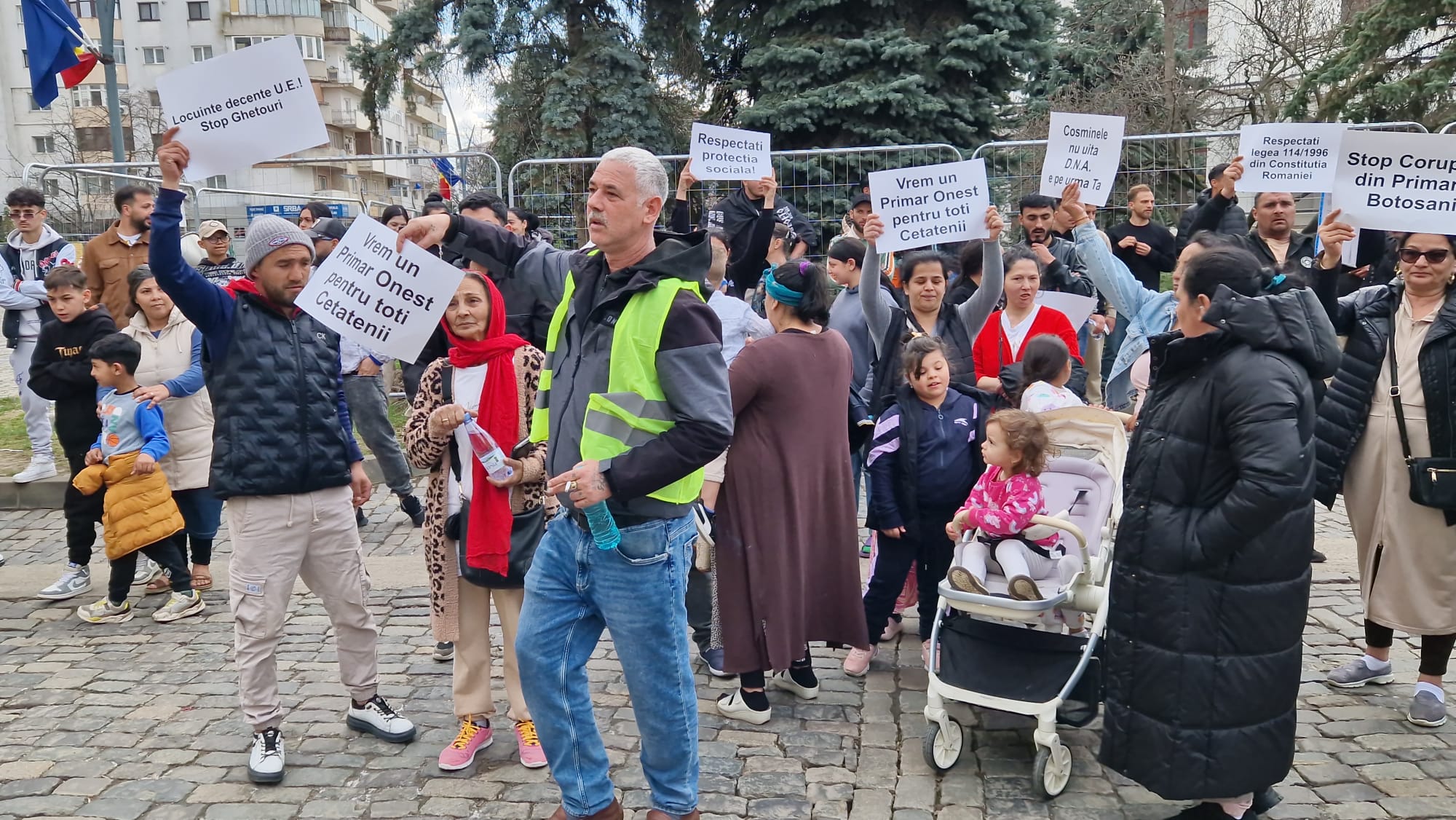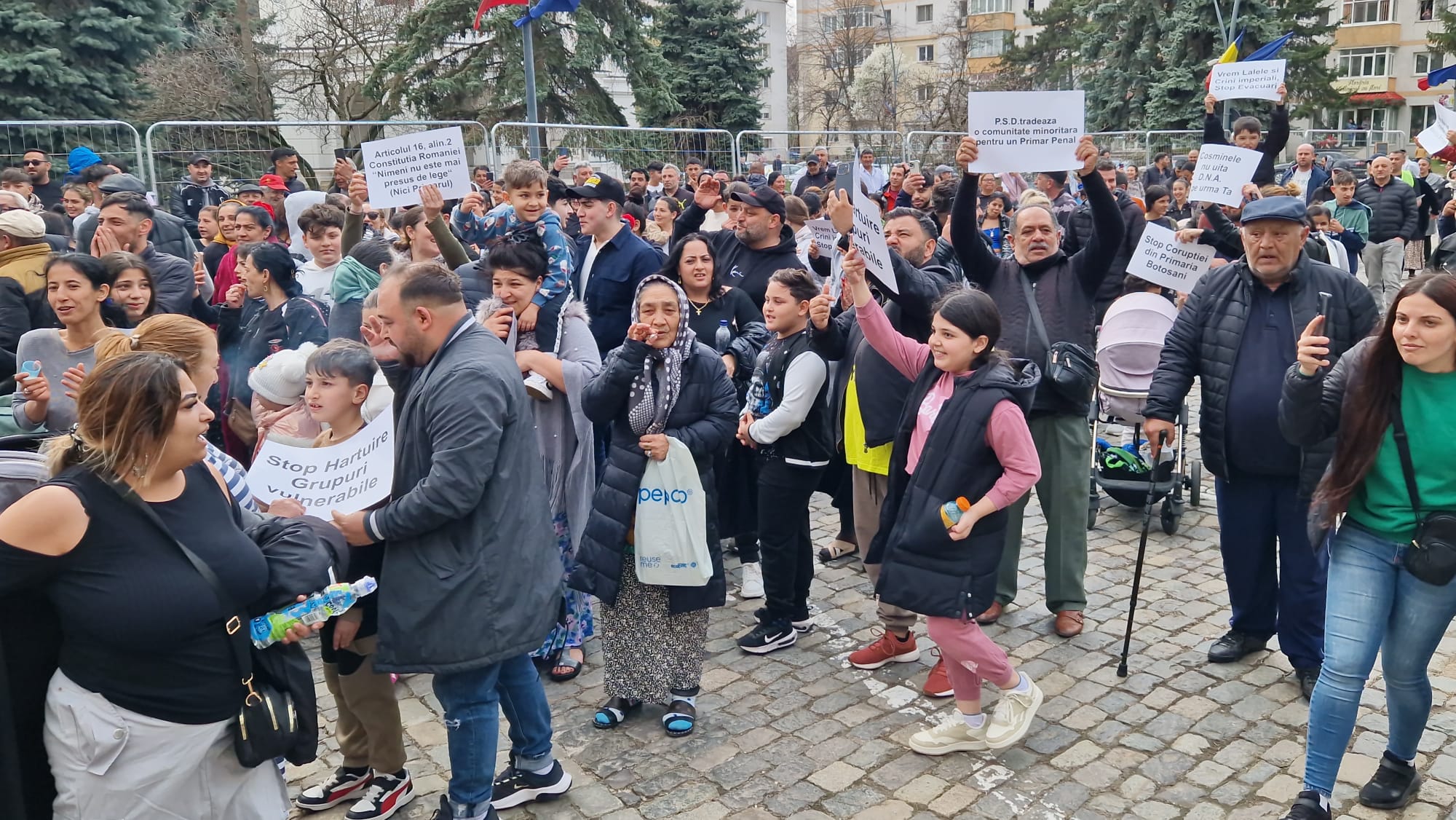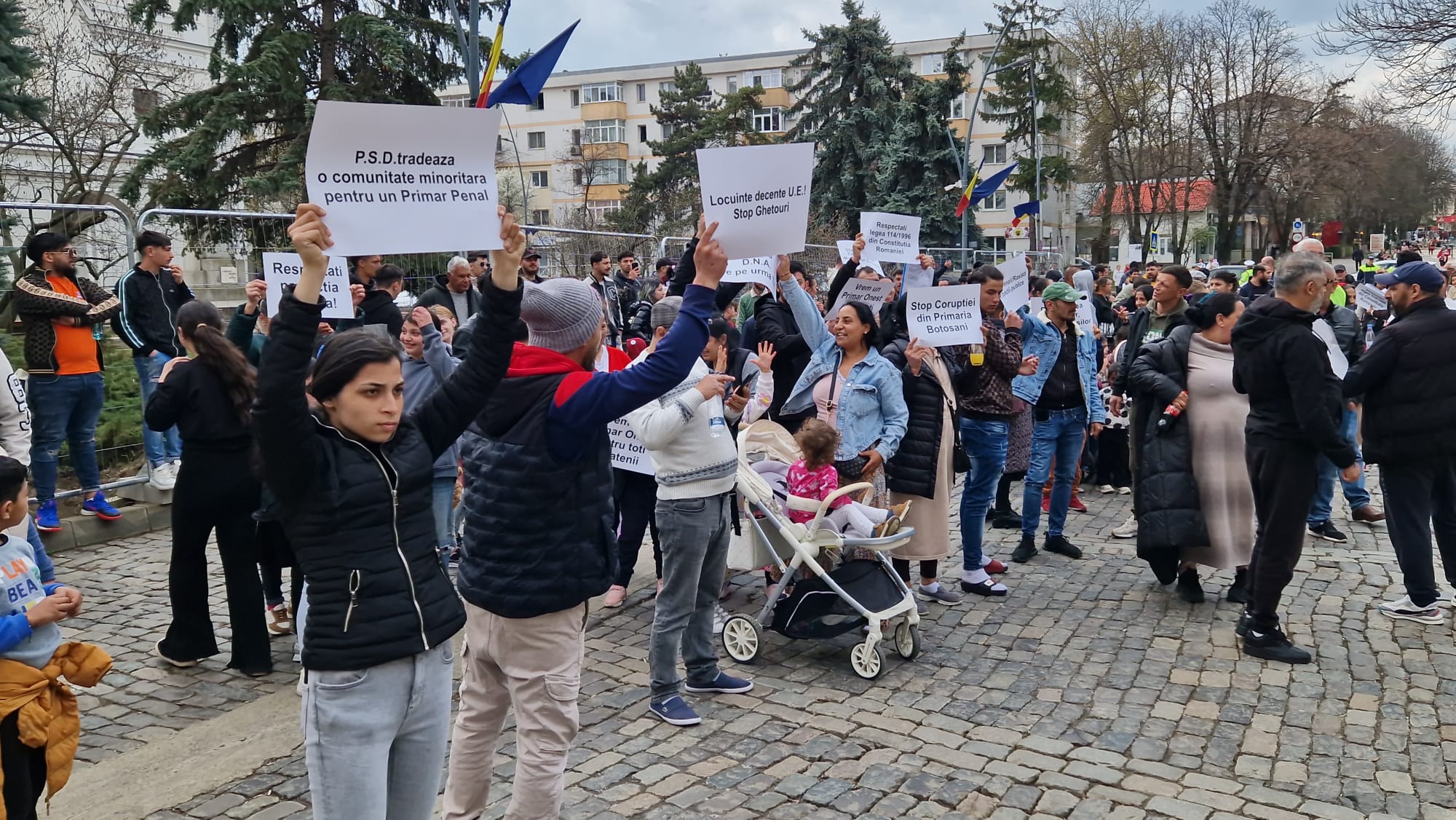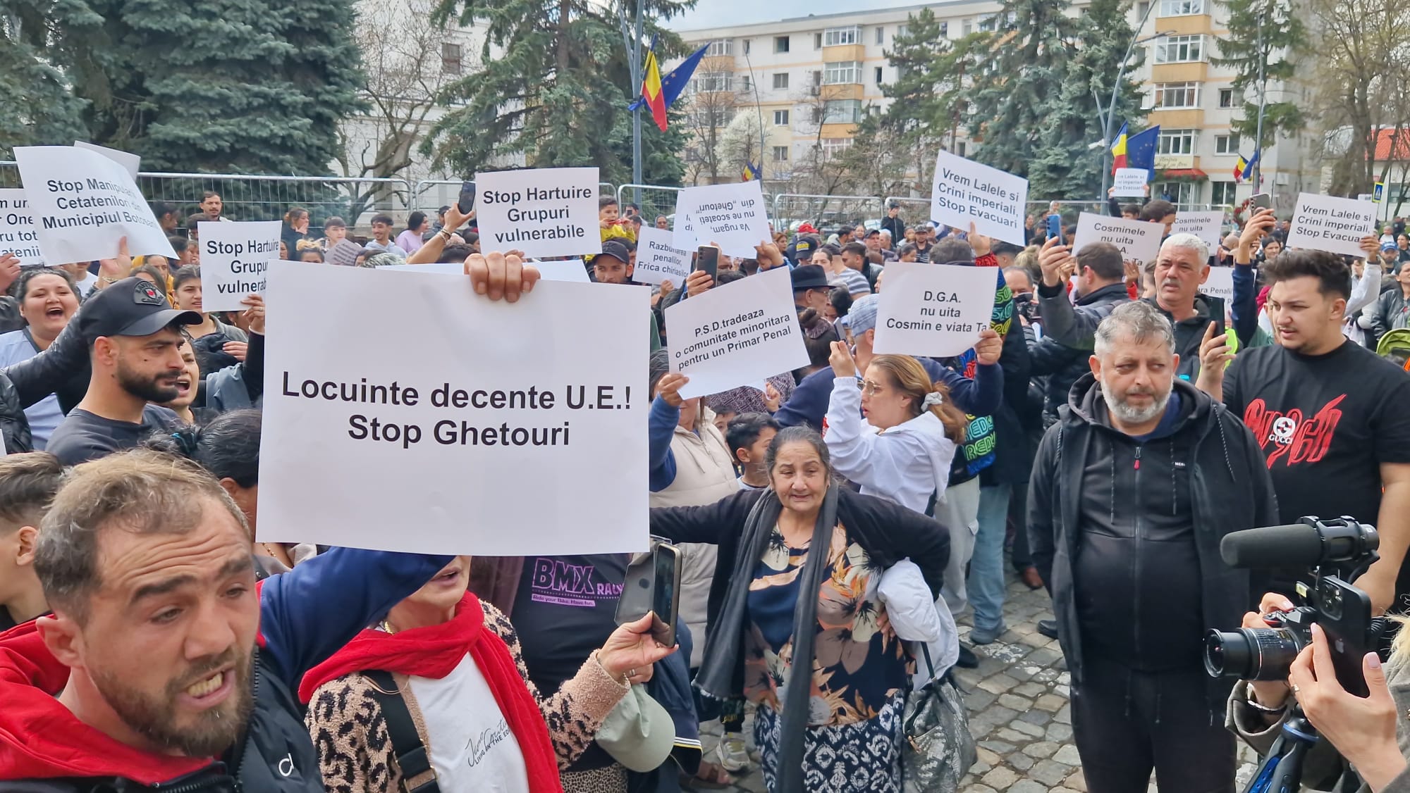 Romii din municipiul Botoșani, care beneficiază de locuințe sociale, protestează, marți, în fața Primăriei municipiului Botoșani. Aproape 300 de persoane de etnie romă s-au adunat în fața instituției. Aceștia  se răscoală împotriva primarului municipiului Botoşani, Cosmin Andrei. Locatarii de la "ghetouri" și nu numai au ieșit în stradă în semn de nemulţumire faţă de decizia în baza căreia vor fi evacuaţi din locuinţele sociale, în cazul în care provoacă scandaluri şi au amenzi neplătite.