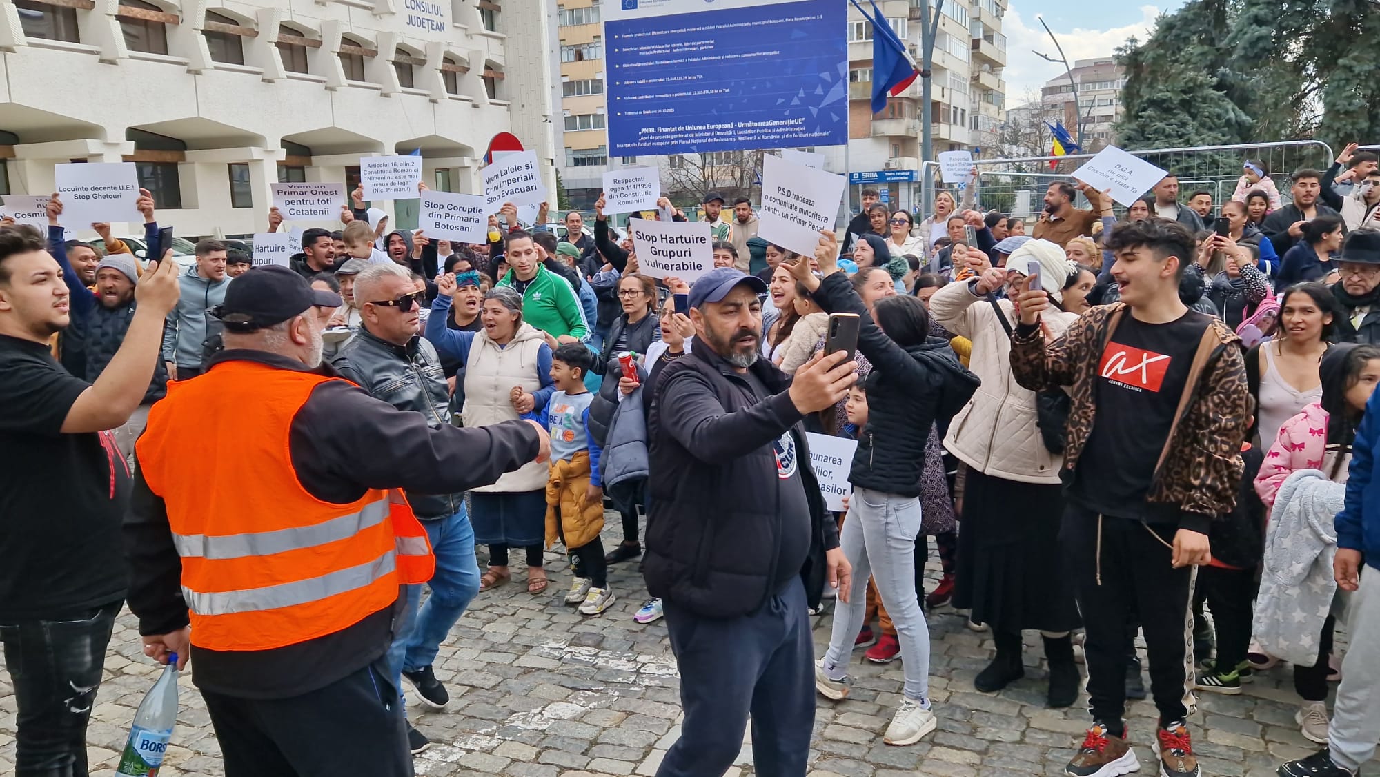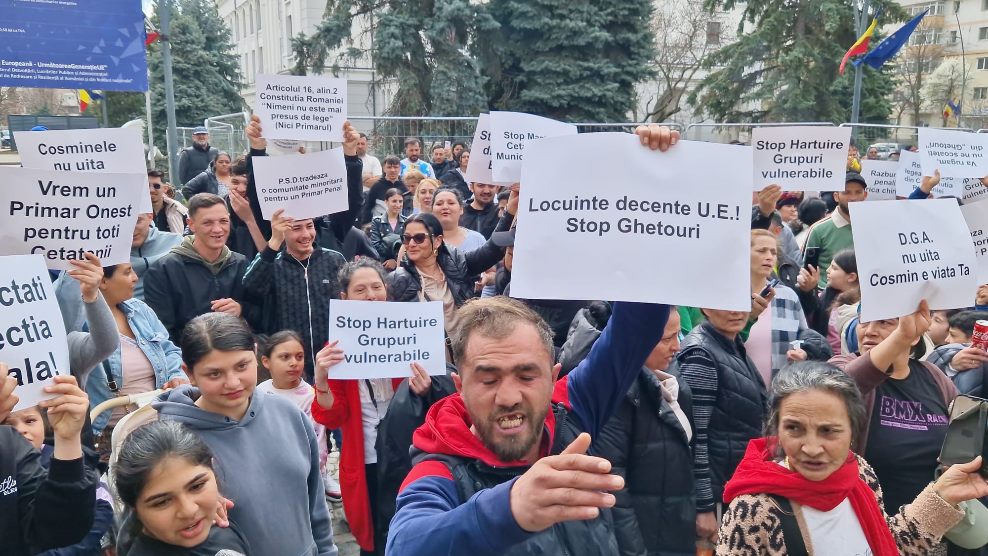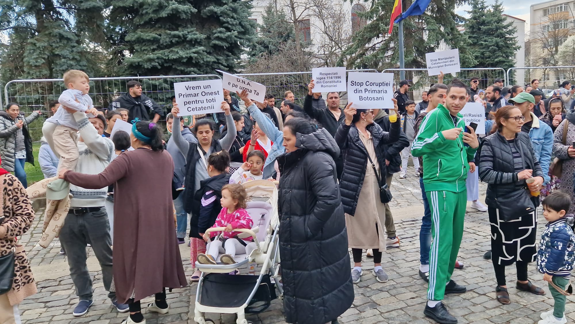 Romii din municipiul Botoșani, care beneficiază de locuințe sociale, protestează, marți, în fața Primăriei municipiului Botoșani. Aproape 300 de persoane de etnie romă s-au adunat în fața instituției. Aceștia  se răscoală împotriva primarului municipiului Botoşani, Cosmin Andrei. Locatarii de la "ghetouri" și nu numai au ieșit în stradă în semn de nemulţumire faţă de decizia în baza căreia vor fi evacuaţi din locuinţele sociale, în cazul în care provoacă scandaluri şi au amenzi neplătite.