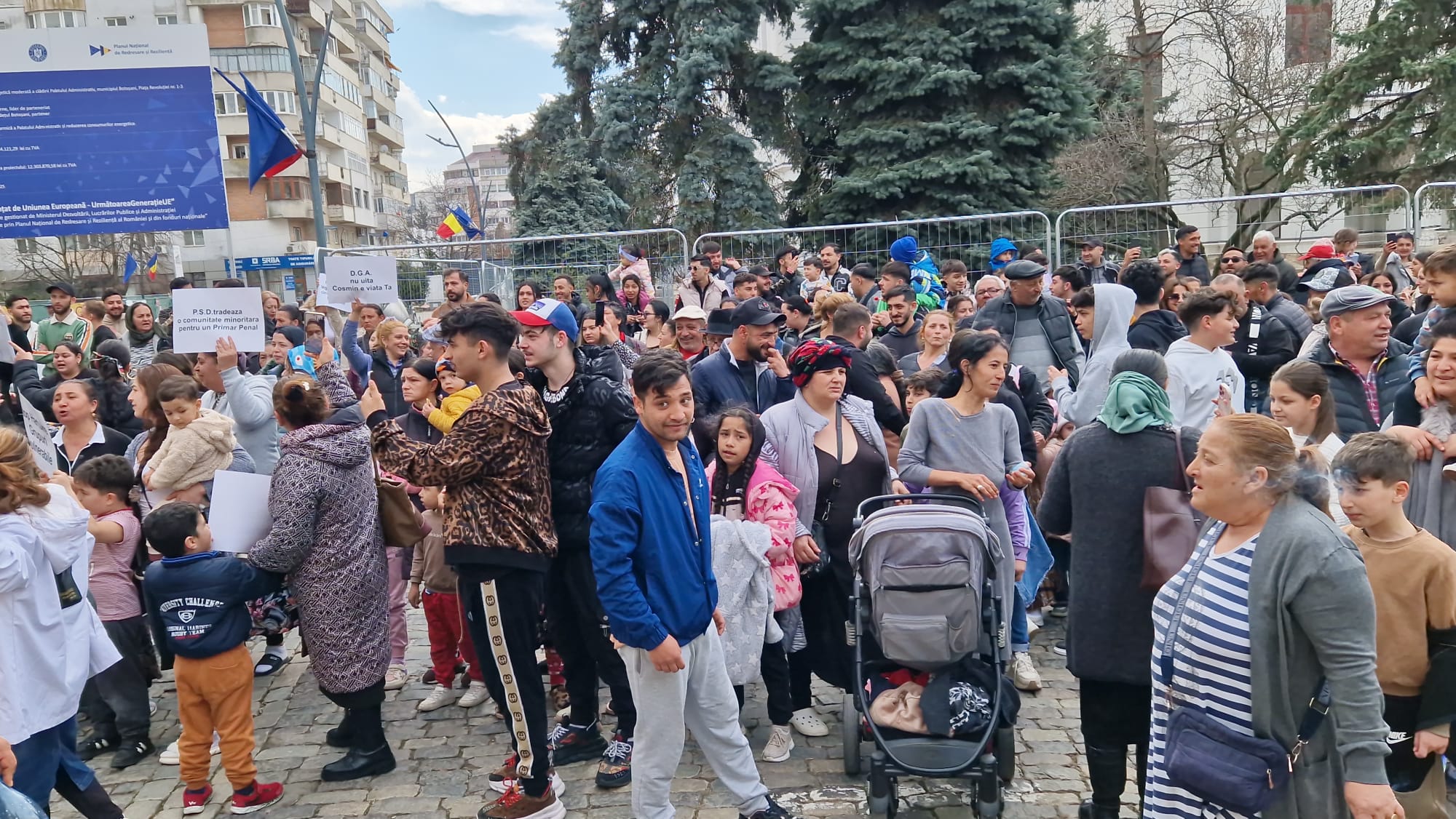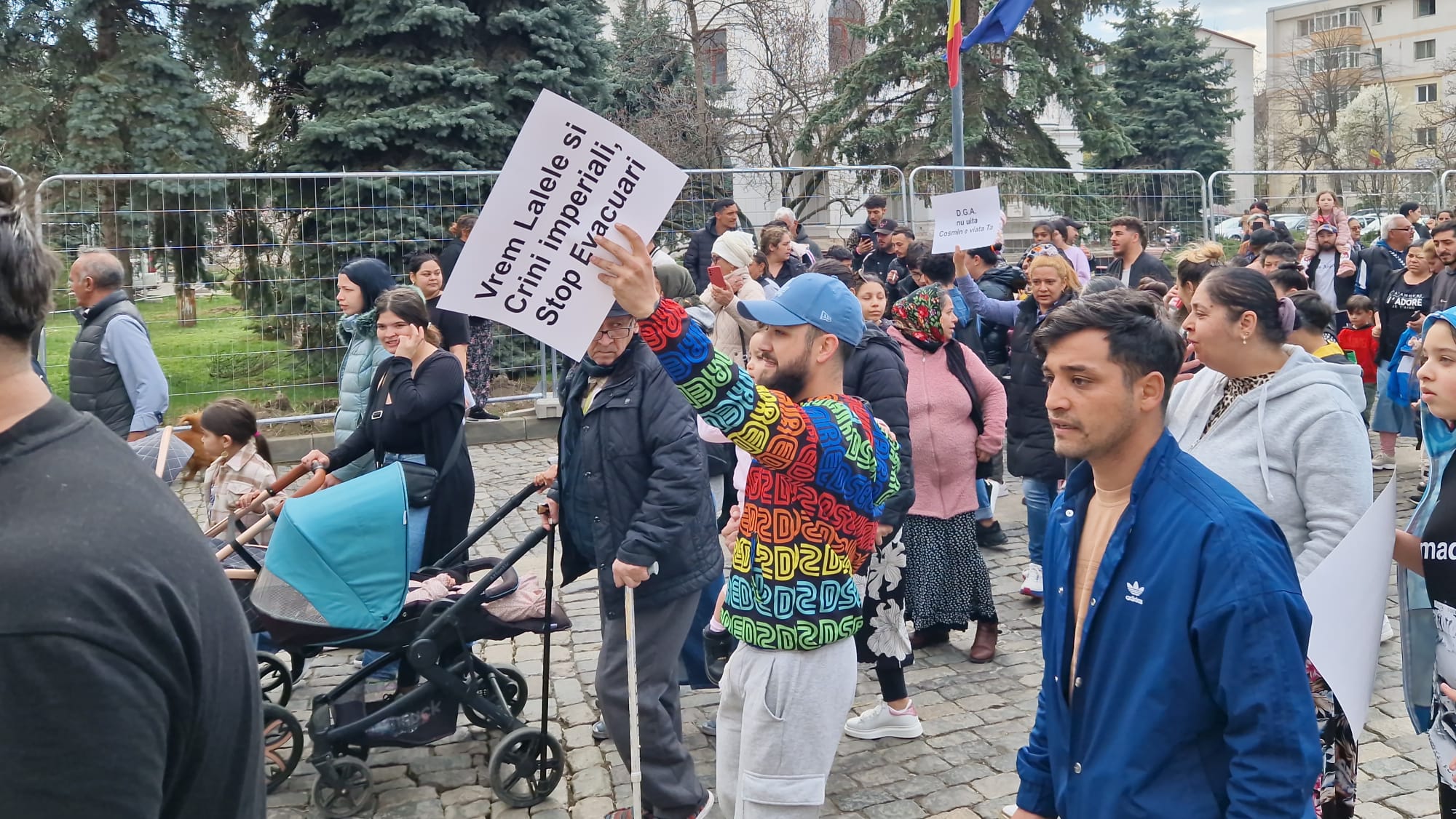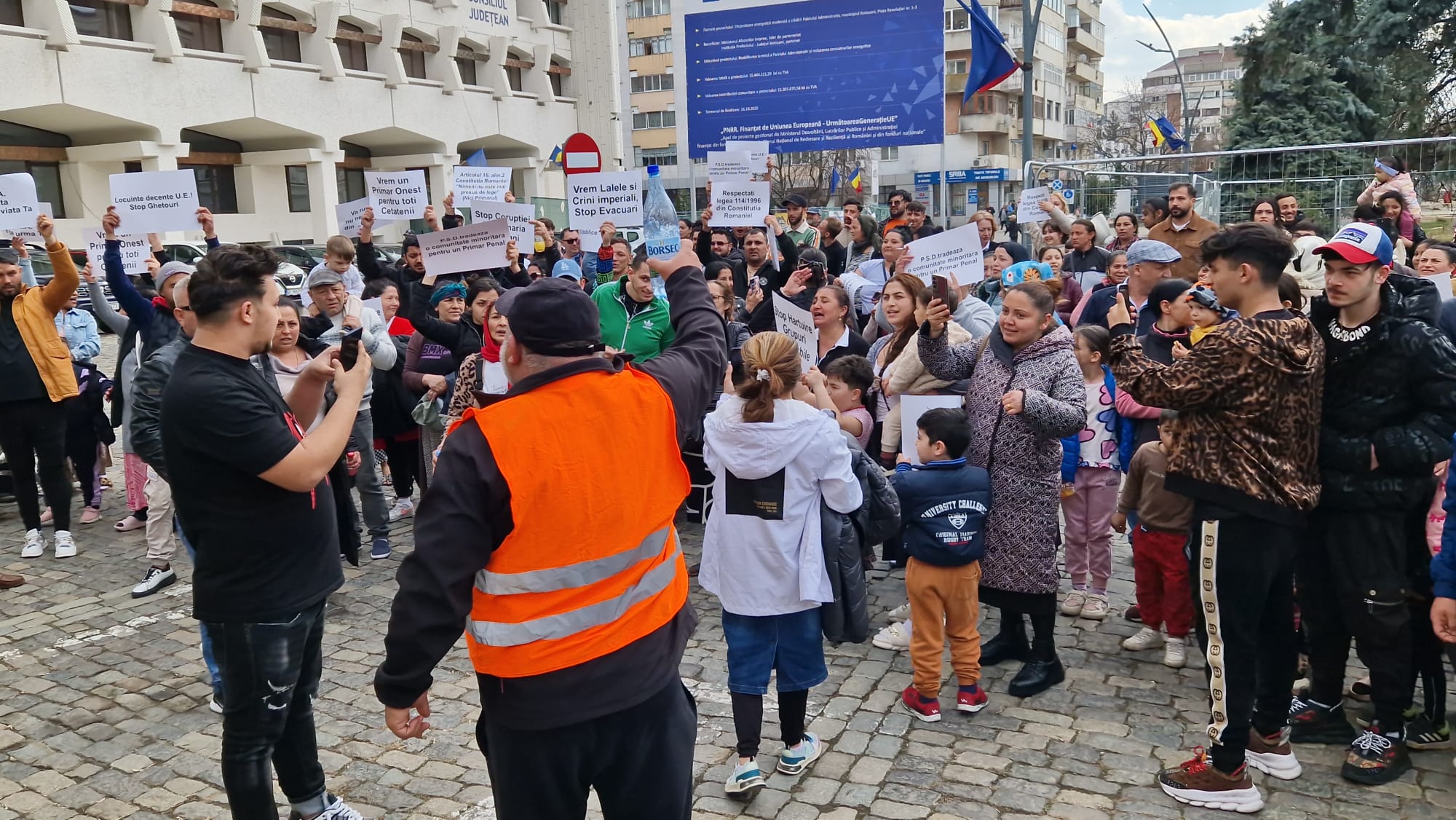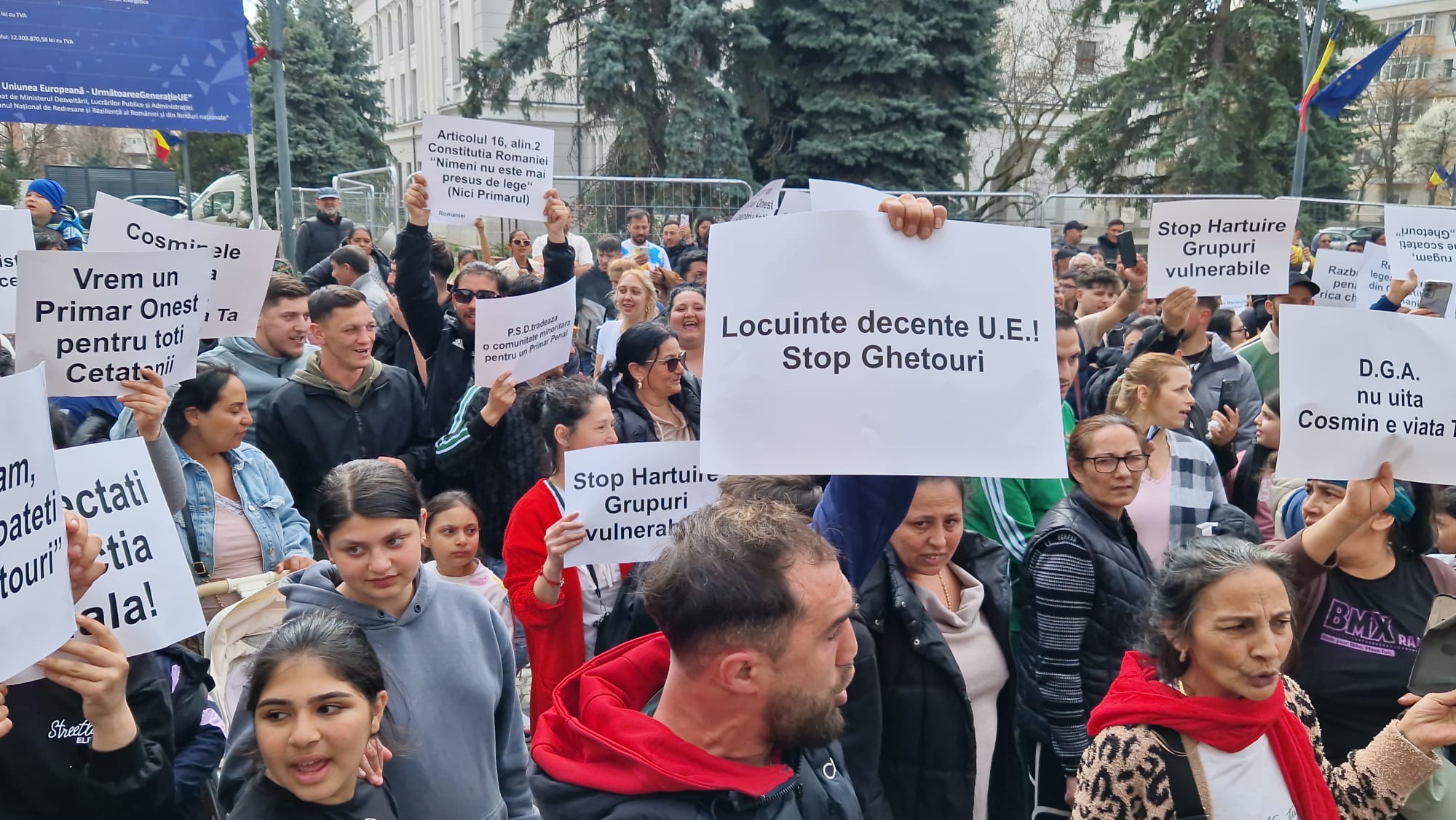 Romii din municipiul Botoșani, care beneficiază de locuințe sociale, protestează, marți, în fața Primăriei municipiului Botoșani. Aproape 300 de persoane de etnie romă s-au adunat în fața instituției. Aceștia  se răscoală împotriva primarului municipiului Botoşani, Cosmin Andrei. Locatarii de la "ghetouri" și nu numai au ieșit în stradă în semn de nemulţumire faţă de decizia în baza căreia vor fi evacuaţi din locuinţele sociale, în cazul în care provoacă scandaluri şi au amenzi neplătite.