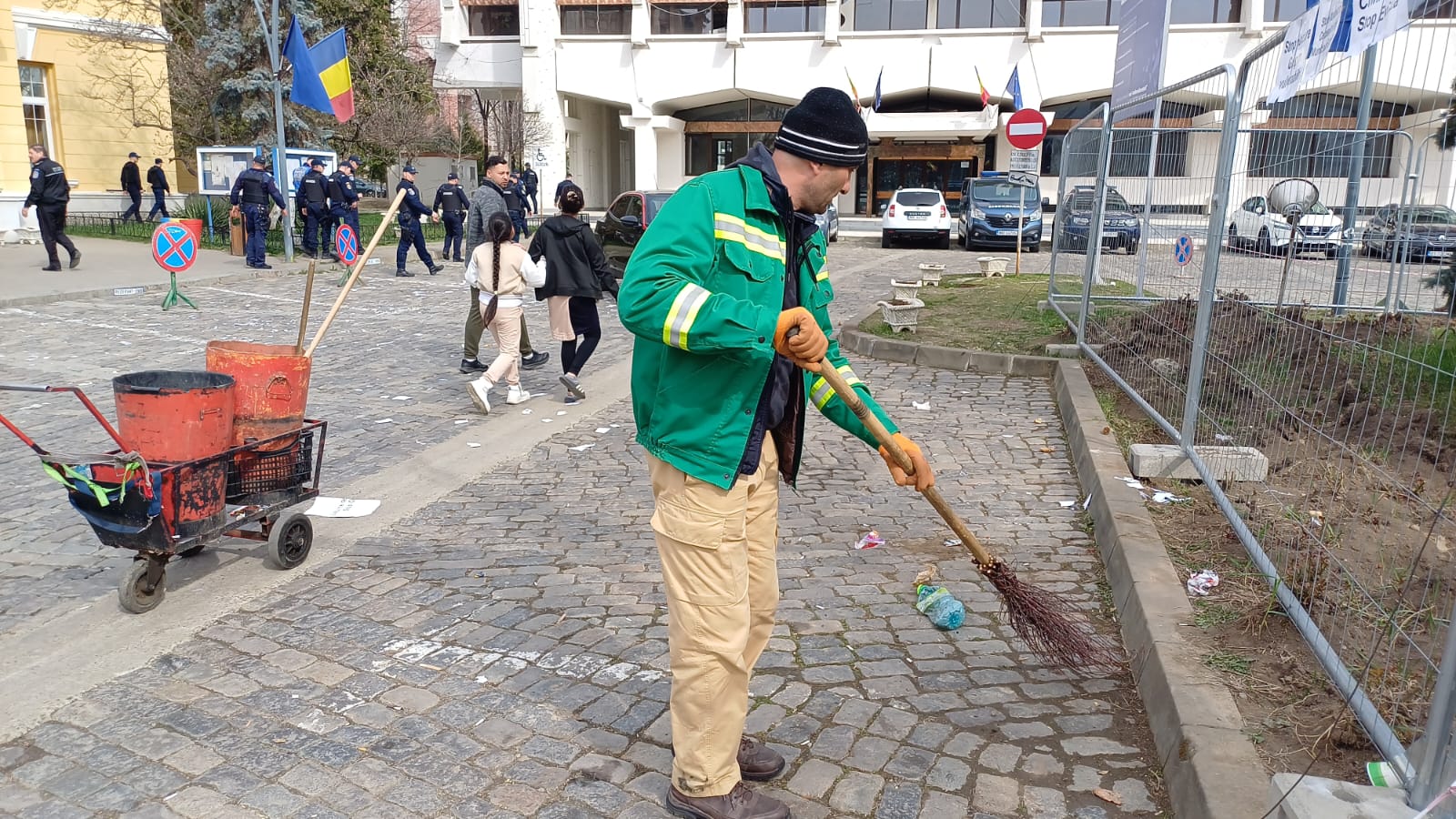După finalizarea protestului, angajații de la salubrizare au strâns afișele, PET-urile și ambalajele aruncate pe jos de protestatari.