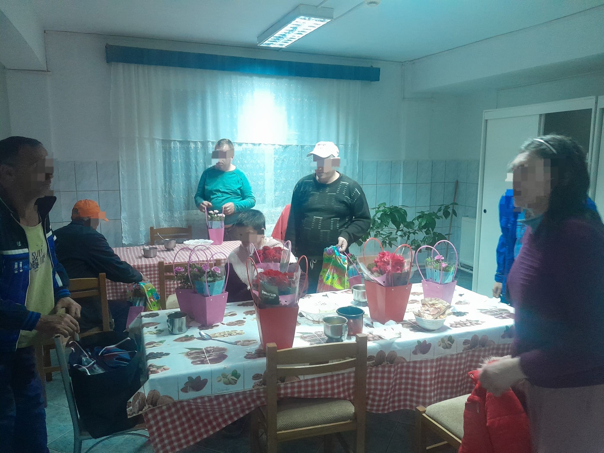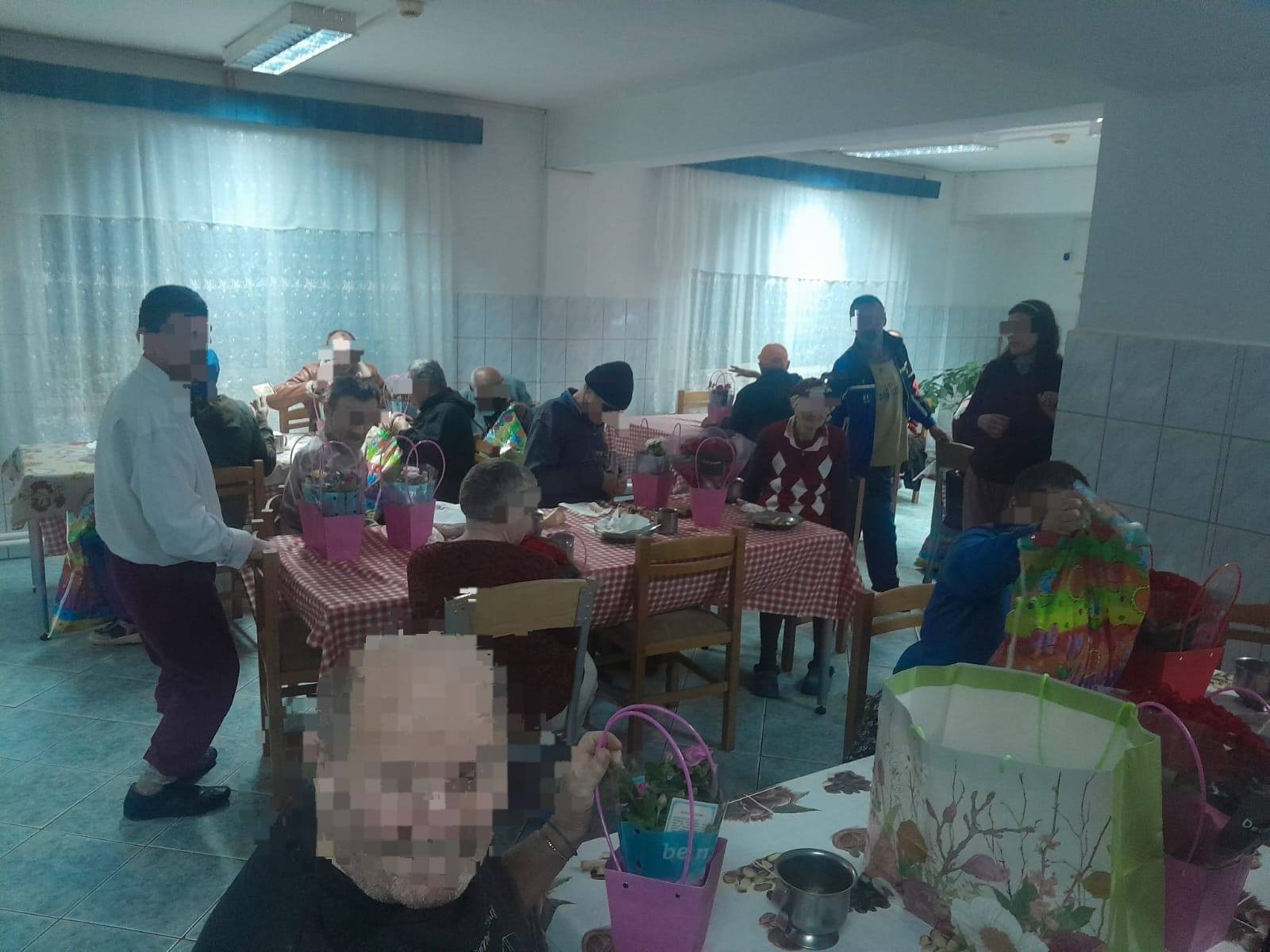 „Ne gândeam..., de Buna Vestire este ziua mamei creștine, iar noi, în această zi, am pășit pragul "casei" unor oameni care , majoritatea, nu și-au cunoscut niciodată mamele și nici nu au avut șansa să fie mame.... Mulți dintre ei au crescut și au îmbătrânit fără să-și cunoască vreodată mama și tatal. Nici în copilărie, nici in suferința bolii, nici la bătrânețe, nici pe patul de moarte nu au parte de mângâierea unui membru din familie... Niște oameni străini, angajații și colegii de centru le-au devenit familie. Copiii de la Biserica Pacea, le-au cântat câteva cântece și "La mulți ani" după care am dăruit fiecăruia dintre cei 50 de beneficiari câte o floare în ghiveci gardenia/trandafiri ( pe care le vor planta ulterior în curtea centrului), o iconiță și două pungi de cadou. Fiecare dintre ei a primit produse noi: pijamale, șosete, șlapi, căciuli, prosop, gel de duș, șampon, fructe, dulciuri, pufuleți, colăcei, conserve de ton și altele. De asemenea le-am dăruit tort, pizza, suc, 37 de icoane (pentru fiecare cameră), o candelă, cărți, inclusiv de rugăciuni și Biblia, ochelari pentru citit, un radio și le-am lăsat, în plus, pijamale, șlapi, șosete, căciuli și alte haine ce le vor fi de folos. Spunem că este un strop de bucurie pentru că noi chiar dacă am mers cu mașinile încărcate la maxim, ei sunt 50 de suflete, care merită să se bucure mai des de astfel de vizite și de astfel de daruri. Foarte rar ii viziteaza cineva, iar ei ies foarte rar din centru”, precizează Anamaria Macuc.