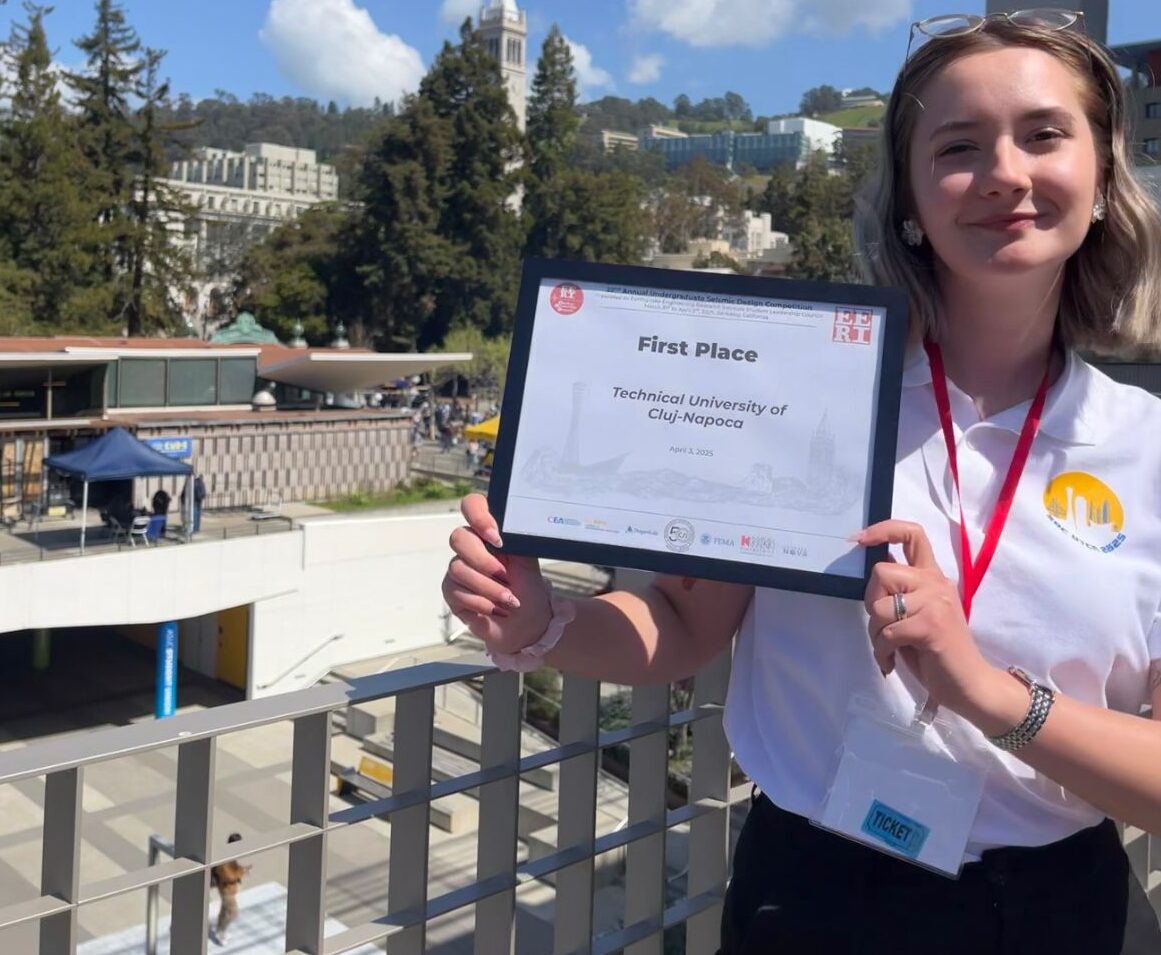 Recent, tânăra a participat cu echipa Universității Tehnice din Cluj-Napoca, la Seismic Design Competition 2025, o competiție internațională de inginerie seismică desfășurată la Universitatea din California, Berkeley, SUA, de unde s-a întors cu locul I, dar și cu premiul pentru Best Communication Skills – o recunoaștere a muncii în echipă și a modului în care tinerii și-au susținut proiectul.