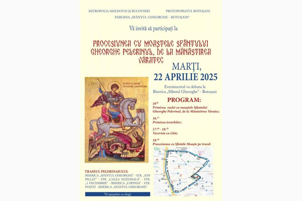 Marți, 22 aprilie, Parohia „Sfântul Gheorghe” din Botoșani va primi, de la Mănăstirea Văratec, racla cu moaștele Sfântului Gheorghe Pelerinul, cu prilejul hramului bisericii istorice. După săvârșirea Vecerniei și a Litiei, începând cu ora 18.30, soborul și credincioșii vor merge în procesiune pe străzile municipiului.
