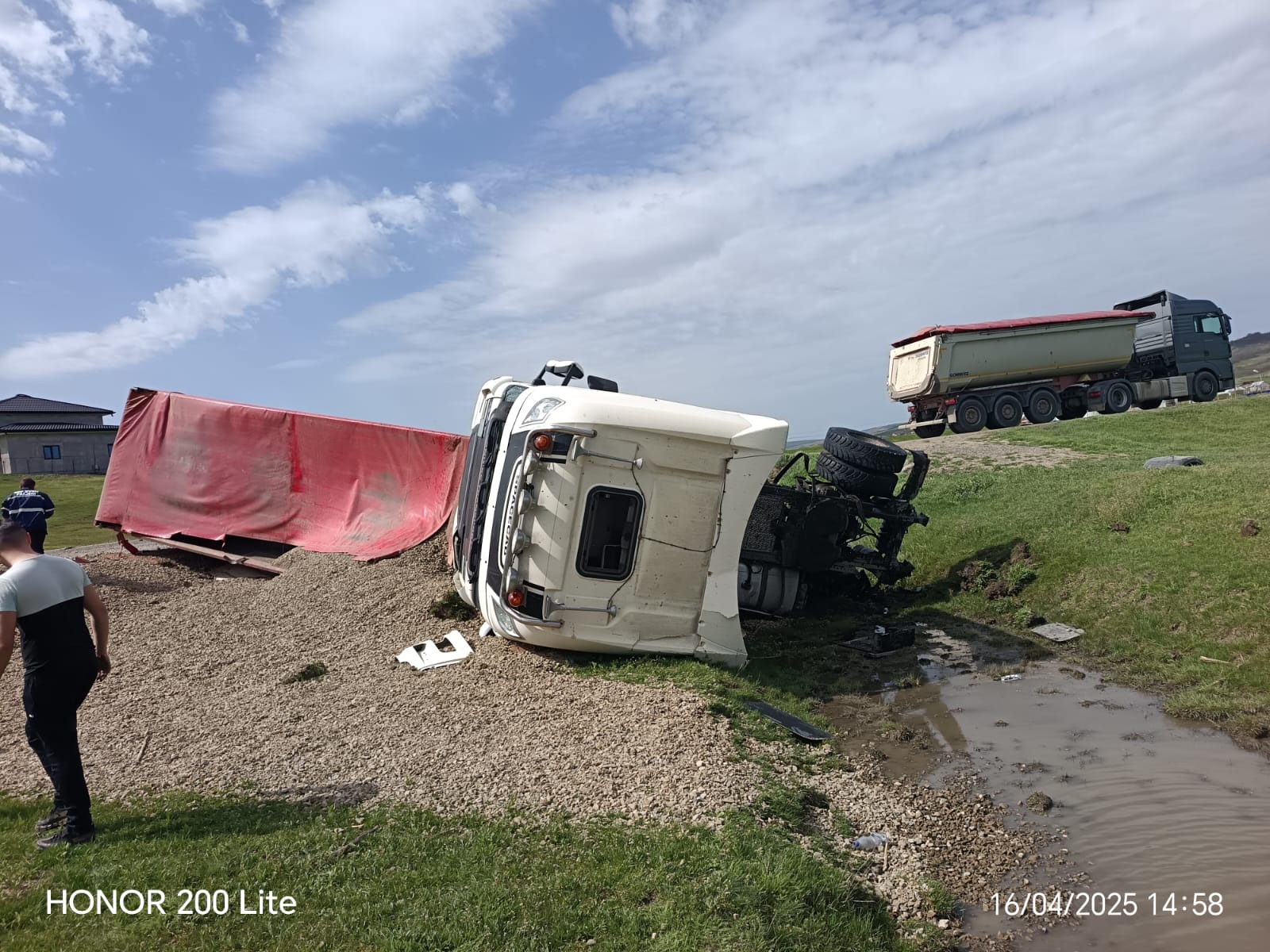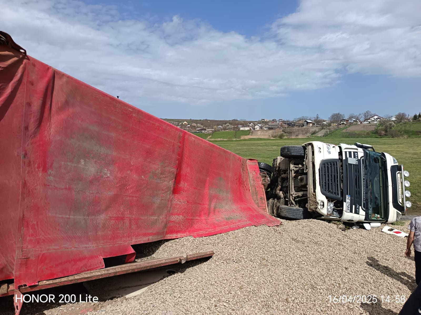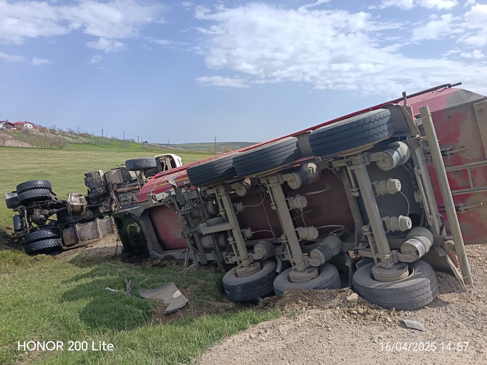 Aceștia au constat faptul că autovehiculul, cu o capacitate de 40 de tone, era răsturnat în afara părții carosabile și că nu erau persoane încarcerate.