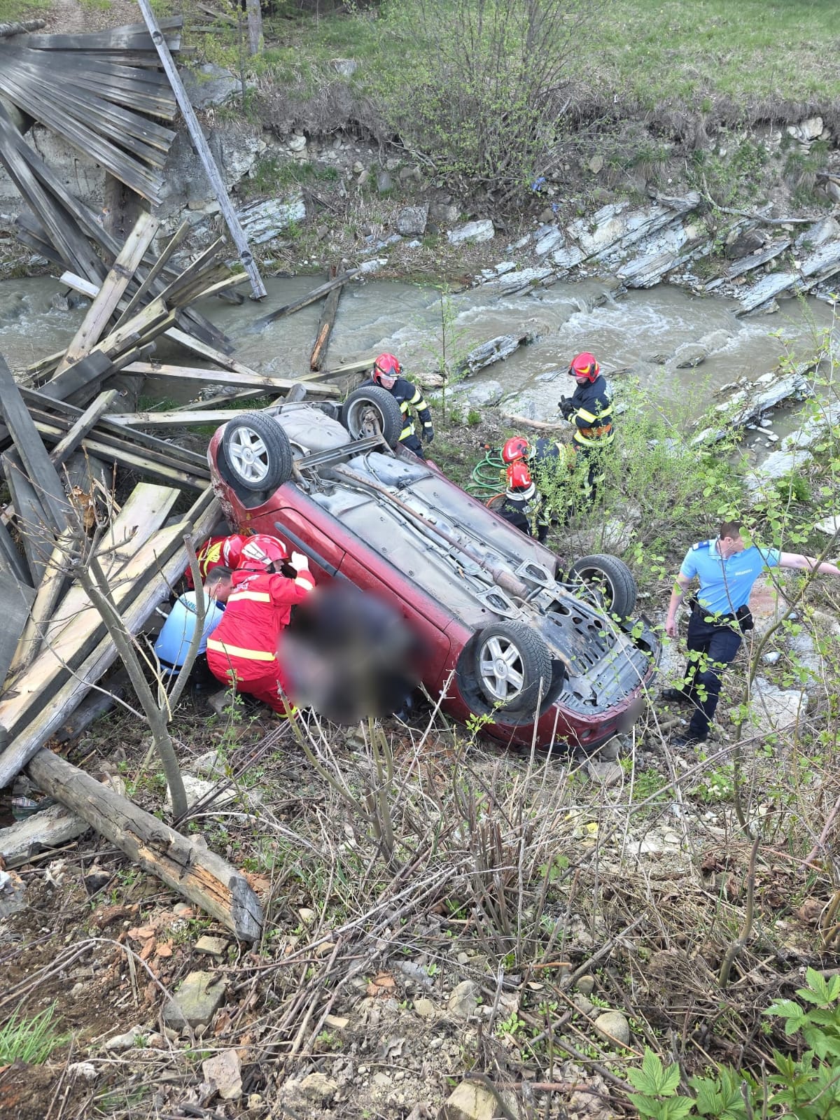 După ce podețul s-a rupt, autoturismul condus de bărbatul de 79 de ani a căzut și s-a răsturnat de la o înălțime de cca. 3 metri in albia râului Sucevița.
