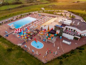Piscina exterioară, una dintre atracțiile principale ale parcului, este pregătită să primească vizitatori de toate vârstele, dornici de relaxare, înot și distracție în aer liber.