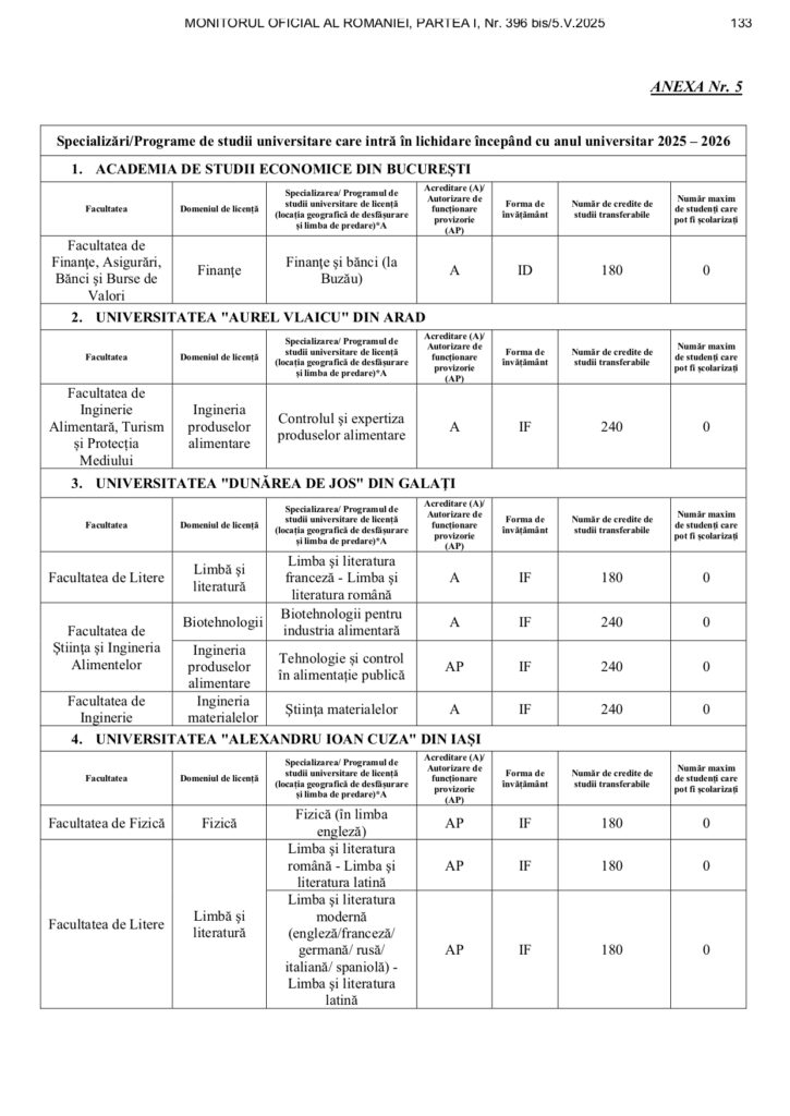 Nouă universități vor renunța la unele programe de studii sau specializări din anul universitar 2025-2026, potrivit hotărârii de Guvern publicate în Monitorul Oficial. Este vorba despre programe de licență de la facultăți din ASE, Universitatea Alexandru Ioan Cuza din Iași sau Universitatea Vasile Goldiș din Arad dar și de la universități private.