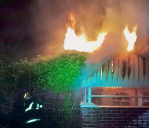 Acoperișul unei fântâni a luat foc din cauza unui cablu electric defect, iar flăcările amenințau să se extindă și la casa de locuit.
