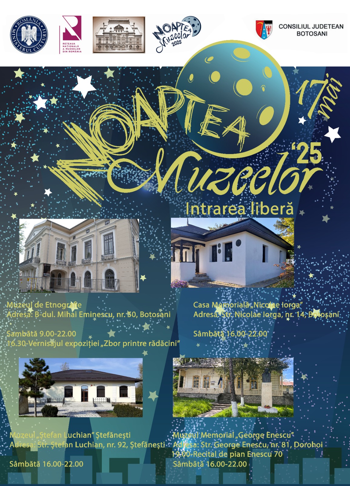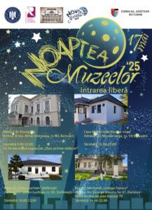 Conform tradiției ultimilor ani, Muzeul Județean Botoșani va lua parte și în 2025 la „Noaptea Muzeelor”, eveniment cultural de anvergură națională care mobilizează numeroase instituții de profil muzeal din întreaga țară într-o binevenită celebrare a culturii. Astfel, în data de 17 mai 2025, în intervalul orar 16.00-22.00, intrarea va fi liberă la următoarele muzee botoșănene: