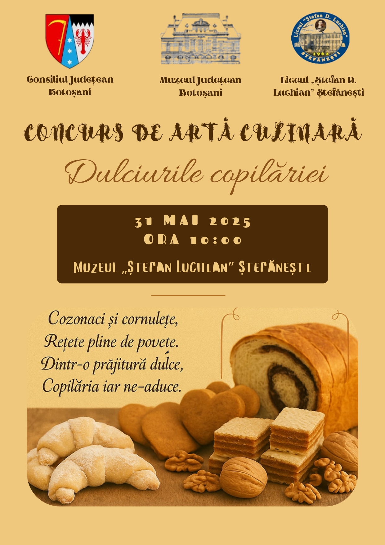 Muzeul „Ștefan Luchian” Ștefănești organizează sâmbătă, 31 mai 2025, de la ora 10.00, Concursul de Artă Culinară „Dulciurile copilăriei”, eveniment dedicat celor care doresc să readucă în prim-plan gustul și aroma deserturilor care le-au încântat copilăria.